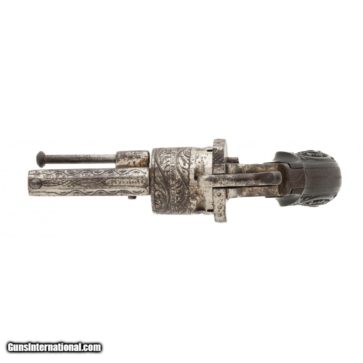 Manufactured in the 1880's. Cylinder is marked ""The Guardian, American model of 1878"". revolver is engraved with floral motifs. Grips are carved gutta-percha in the same motif as engraving. Action needs repair. Very reasonably priced.