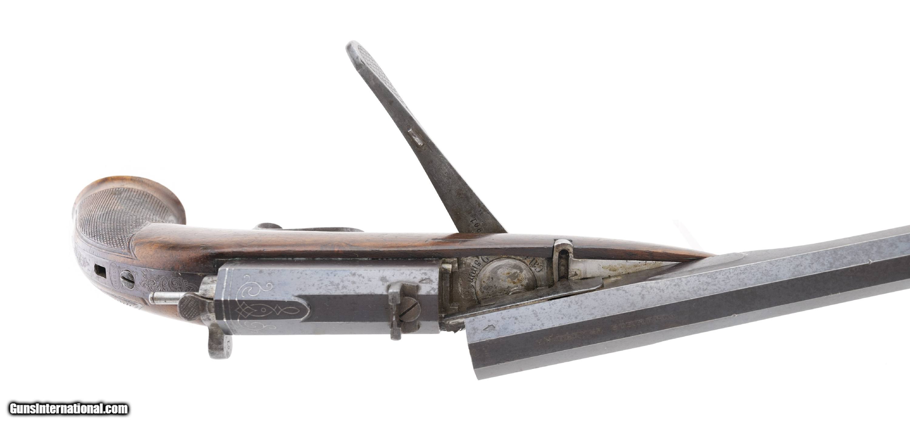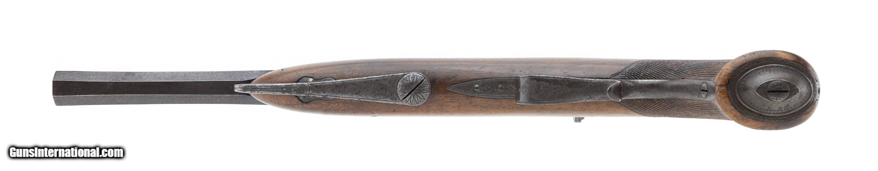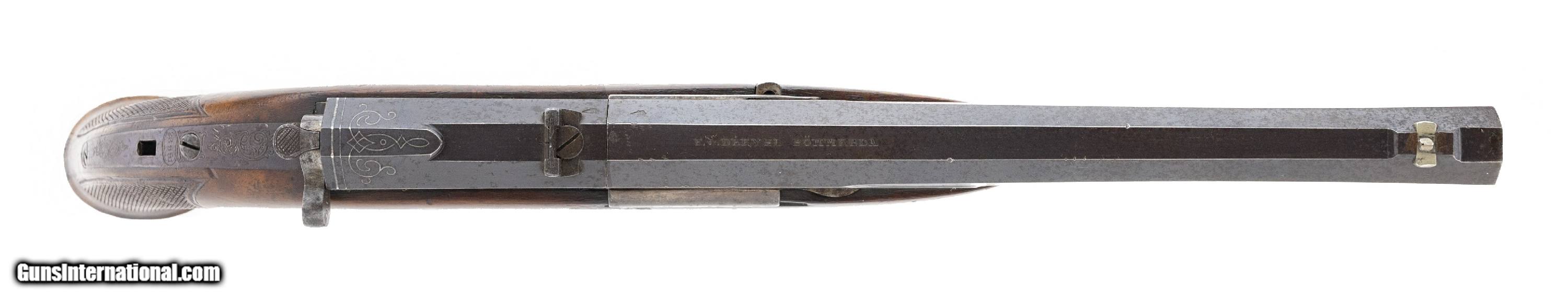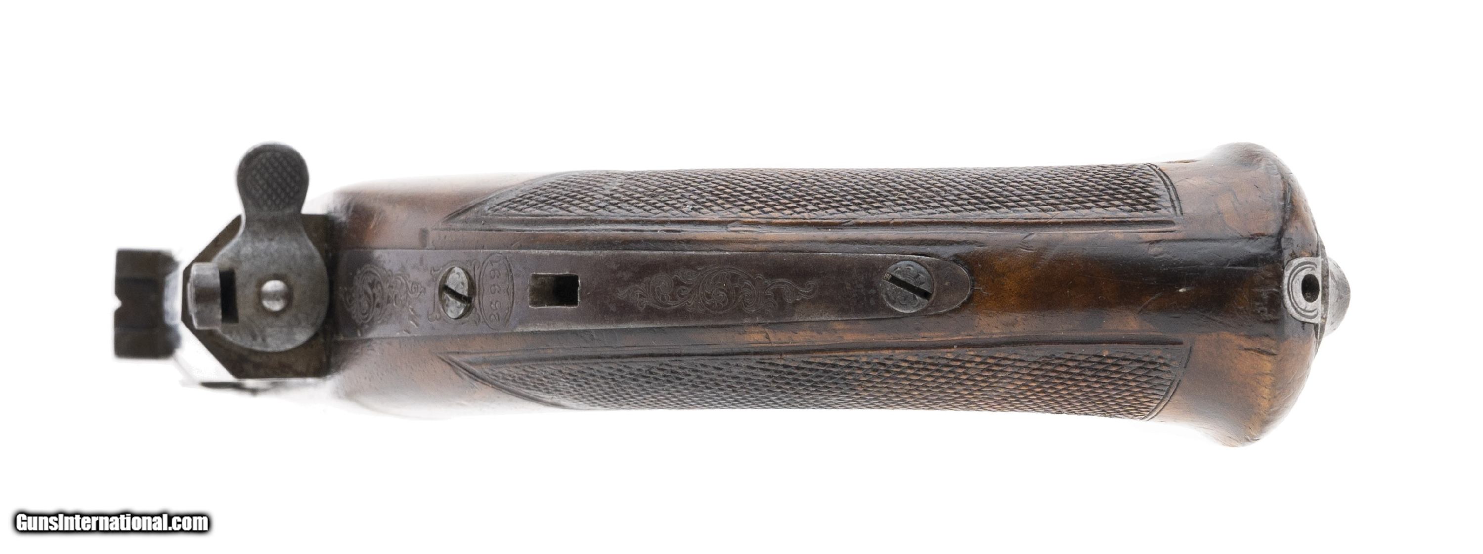 Description: "Baron von Dreyse's needle fire rifle was the first major step toward what we know today as the modern cartridge firearm. In addition to rifles and carbines, he also manufactured pistols, the most common of which is a needle fire revolver. Starting in the 1830s, von Dreyse also manufactured single shot needle fire pistols, the most common of which is the Model 1835 with a side mounted operating lever. This rare single shot Dreyse needle fire pistol may predate the Model 1835. It is operated with a bottom lever which swings the barrel to the side for loading. The overall length is approx. 15 5/8"". The approx. 8.75"" swamped octagon 37 caliber (marked Cal. 9.5mm 2/24P inside the action) rifled barrel has a fair bore with areas of pitting. However, this doesn't matter much as the pistol is fitted with what appears to be a 22 caliber chamber insert for parlor shooting. There is a blade front sight and an adjustable notch rear sight. The top of the barrel is marked F. v. DREYSE SOMMERADA (factory name and location). The pistol cocks on opening. The only other marking are the serial number, 26991, located on the top grip tang and barrel bottom and crown over V proof marks at the breech. The barrel and action have a smooth blue-brown patina with light mottling. The spur trigger guard and operating lever have a gray-brown patina. The rear of the breech has two silver bands with silver scroll inlay forward of that. There is decorative engraving on the barrel latch escutcheon, the operating lever, the trigger guard, the butt cap, and the rear tang. The rear tang and butt cap are configured for the attachment of a shoulder stock. The stock is fine with light usage dents and dings, a small chip at the butt cap, fine checkering on the grips, and no other chips or cracks. The action, which features an adjustable trigger, functions correctly. If you collect needle fire guns, especially the Dreyse series of firearms, this very interesting single shot Dreyse pistol is a must. Antique: Yes Price: $7,250.00 Contact Seller |