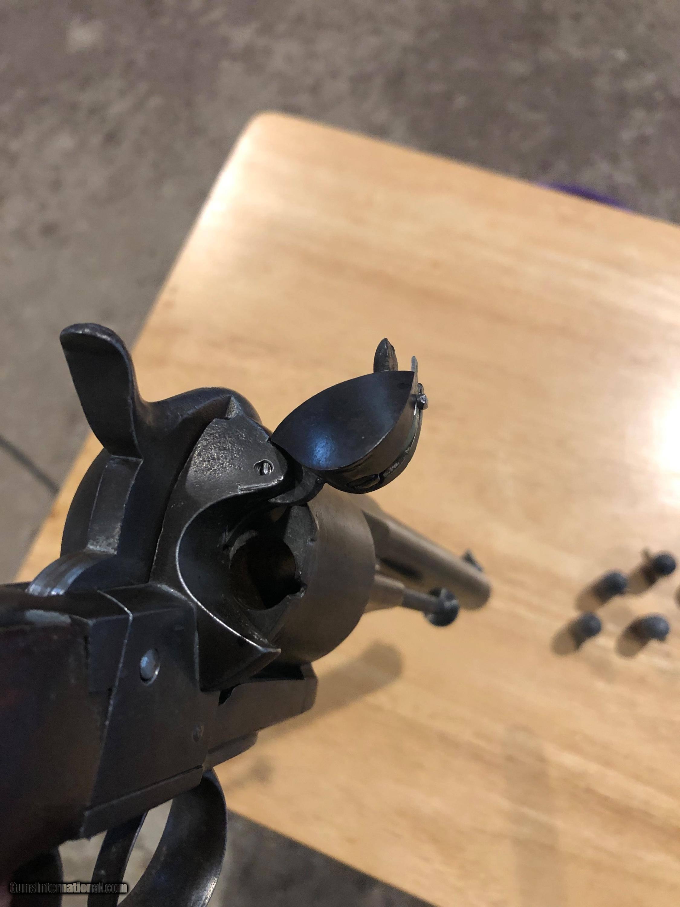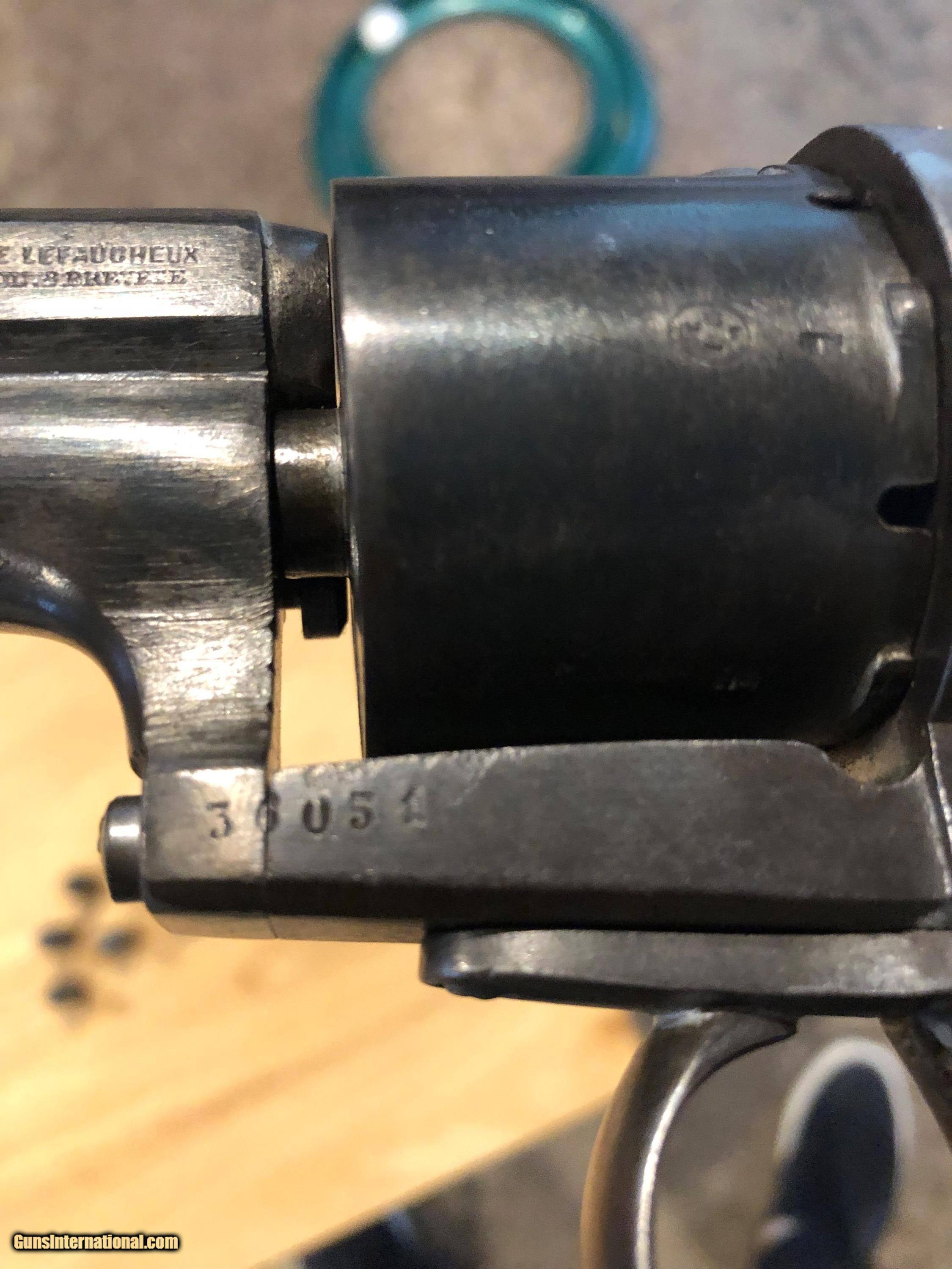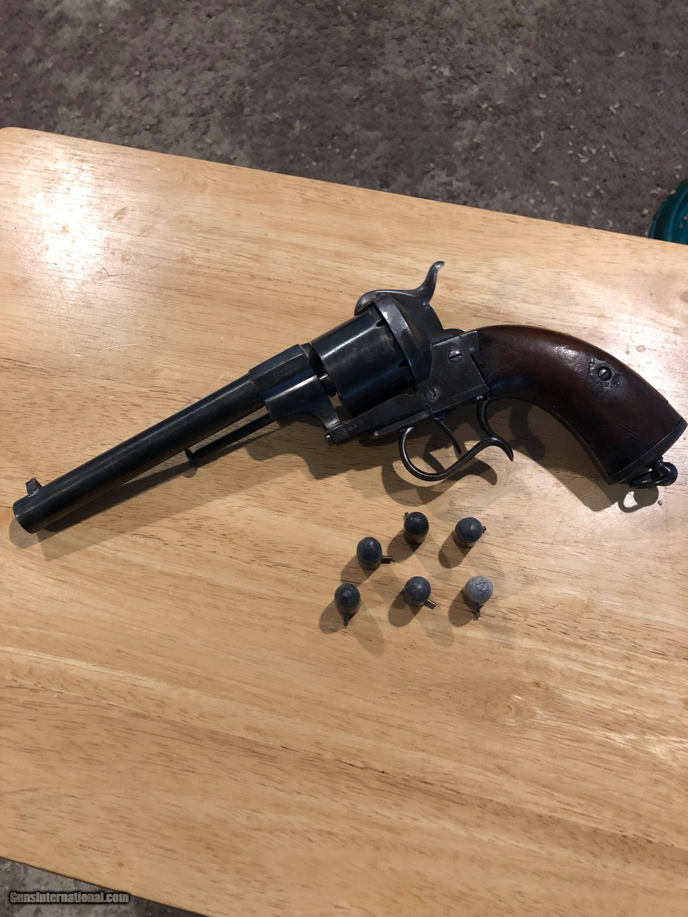 Description: For sale is this mechanically sound , fully operational, well maintained 1854 E. Lefaucheux Civil War Era Pinfire Revolver. Nice bore, nice bluing, fully functioning. Serial number 36051. Inv Brevette on the left side of the barrel lug under E. Lefaucheux. Also have 6 rounds of BB 12 Original 12mm ammo purchased from the Horse Soldier in Gettysburg , Pa. Beautiful piece of Civil War history - Stonewall Jackson was given one of these by his men and carried it in the war. Nice walnut grips. $35 shipping UPS to your house. Have come down from $975 to $435 - not going any lower. SOLD Antique: Yes Handgun Caliber: 12mm Manufacturer: E. Lefaucheux Model: 1854 Serial Number: 36051 Barrel Length: 6.5 Chambers: Clean Condition: VG Metal Condition: VG Wood Condition: VG Bore Condition: Clean Action: SA Finish: Blu Sights: Fixed |