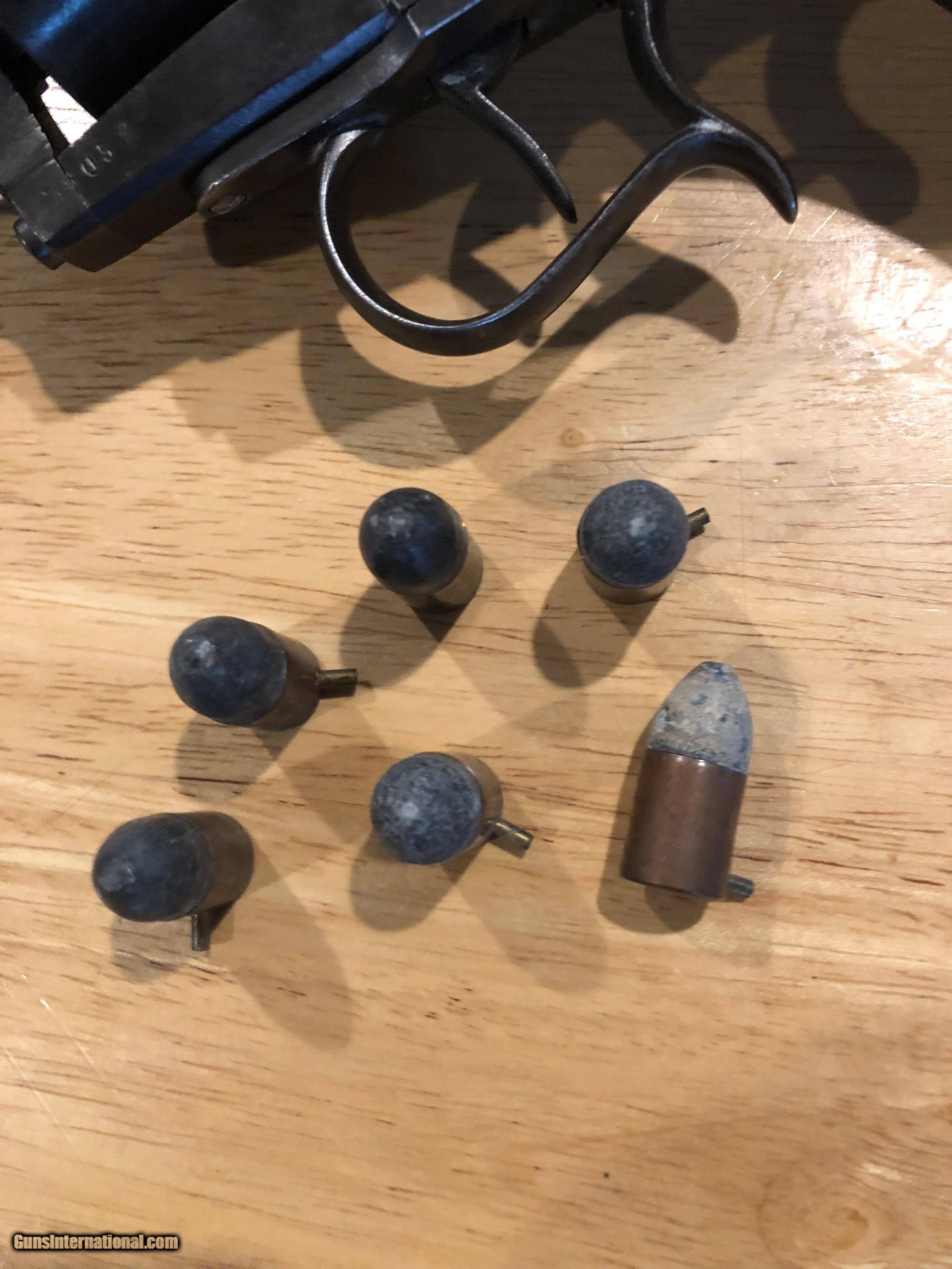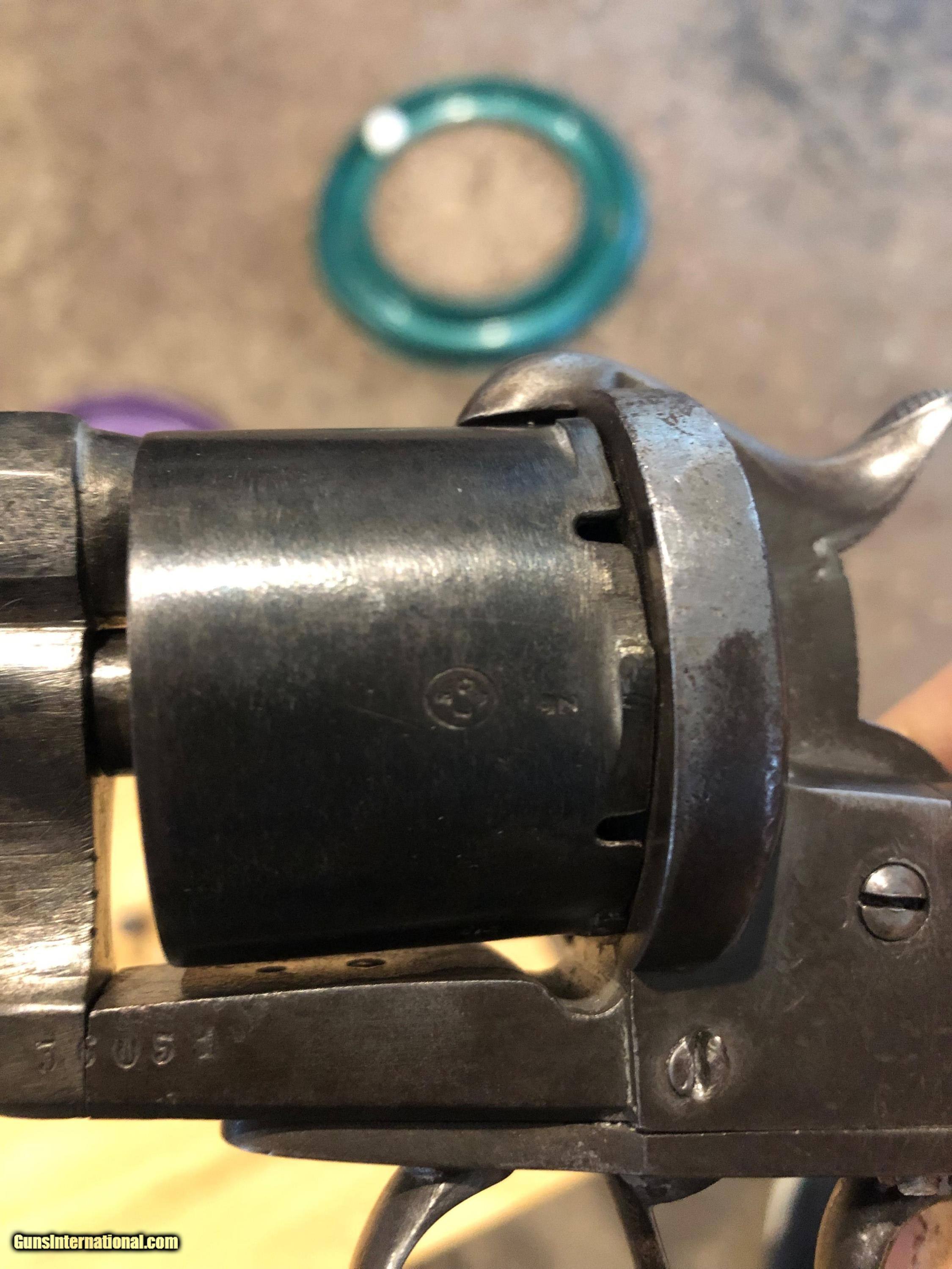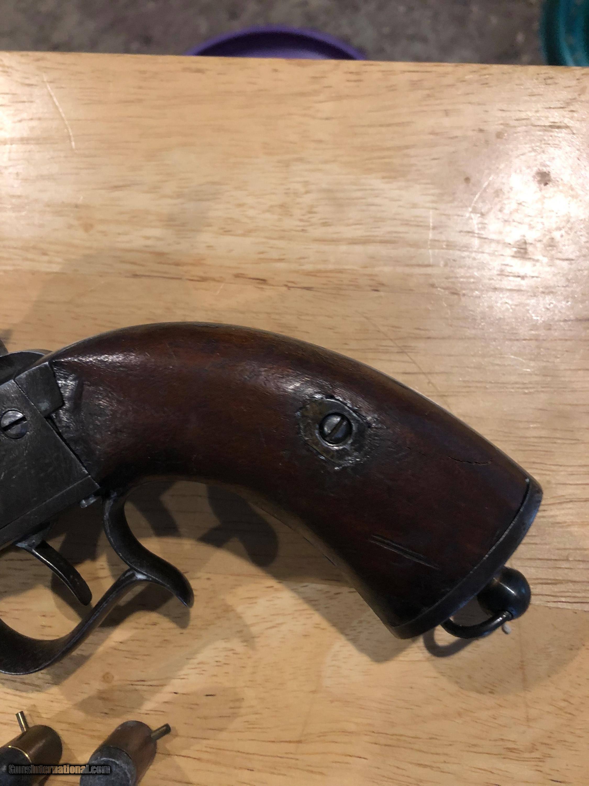 Description: For sale is this mechanically sound , fully operational, well maintained 1854 E. Lefaucheux Civil War Era Pinfire Revolver. Nice bore, nice bluing, fully functioning. Serial number 36051. Inv Brevette on the left side of the barrel lug under E. Lefaucheux. Also have 6 rounds of BB 12 Original 12mm ammo purchased from the Horse Soldier in Gettysburg , Pa. Beautiful piece of Civil War history - Stonewall Jackson was given one of these by his men and carried it in the war. Nice walnut grips. $35 shipping UPS to your house. Have come down from $975 to $435 - not going any lower. SOLD Antique: Yes Handgun Caliber: 12mm Manufacturer: E. Lefaucheux Model: 1854 Serial Number: 36051 Barrel Length: 6.5 Chambers: Clean Condition: VG Metal Condition: VG Wood Condition: VG Bore Condition: Clean Action: SA Finish: Blu Sights: Fixed |