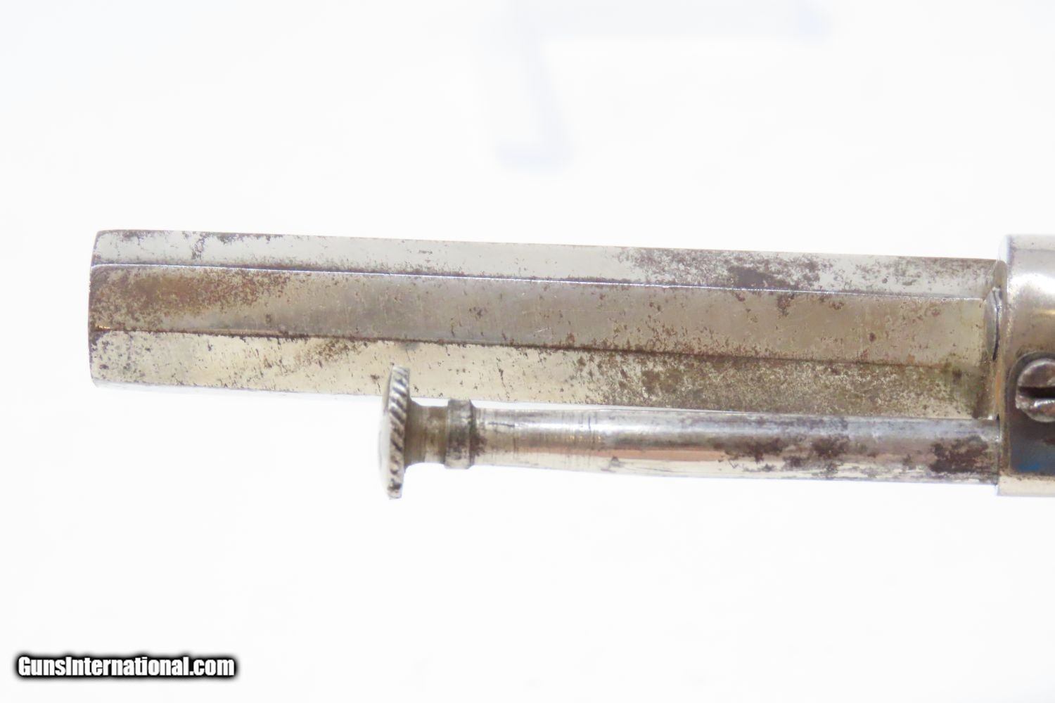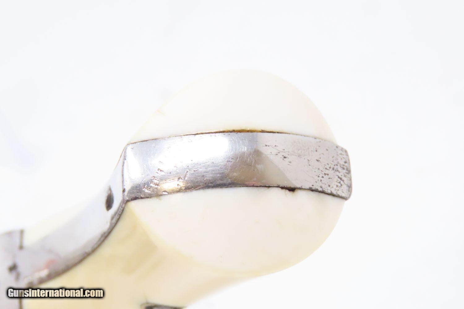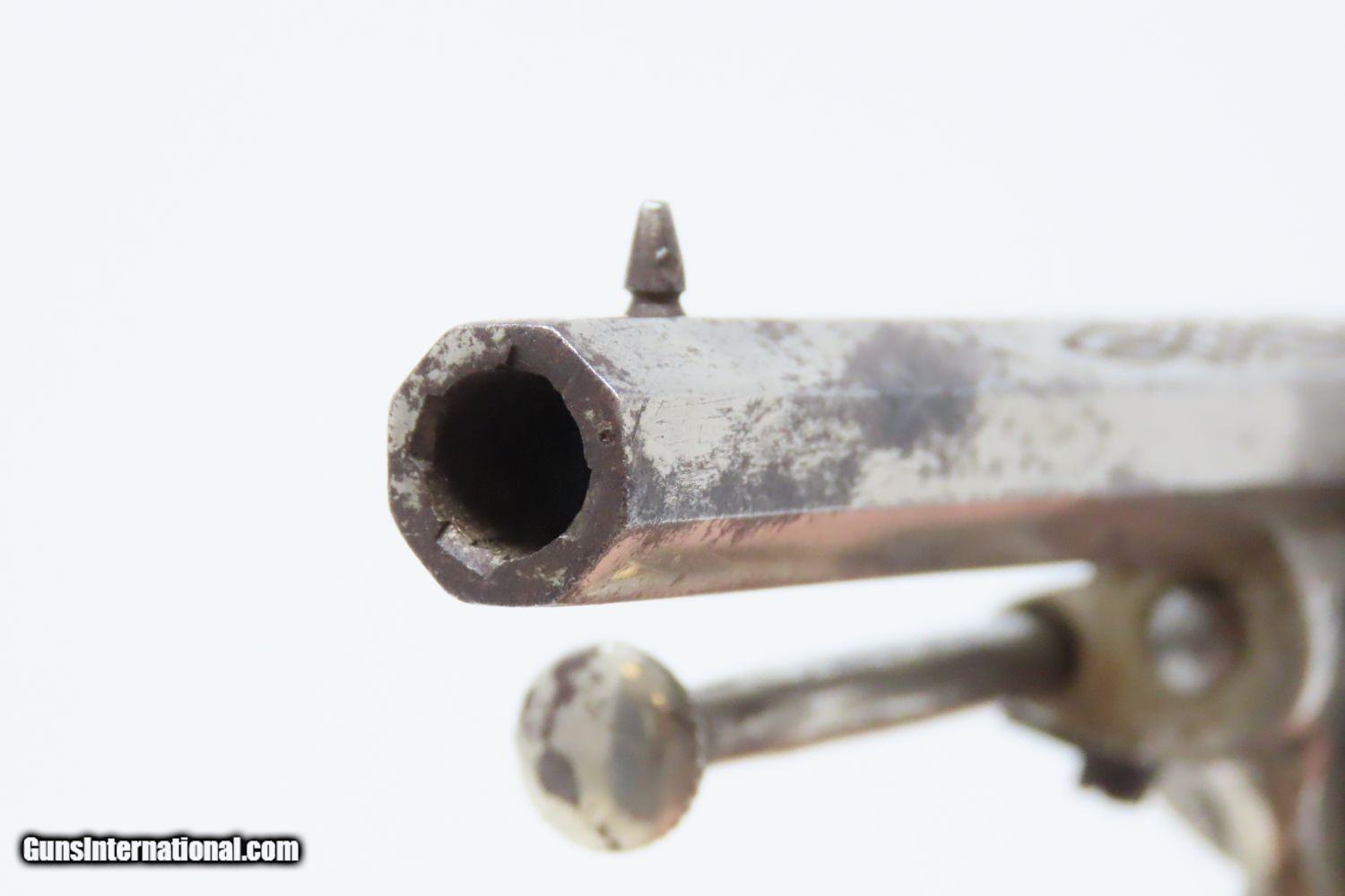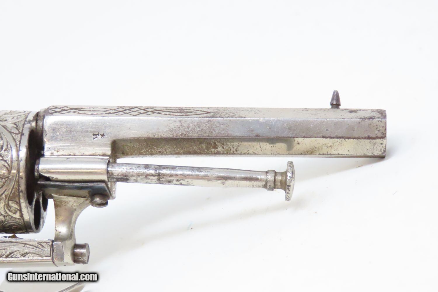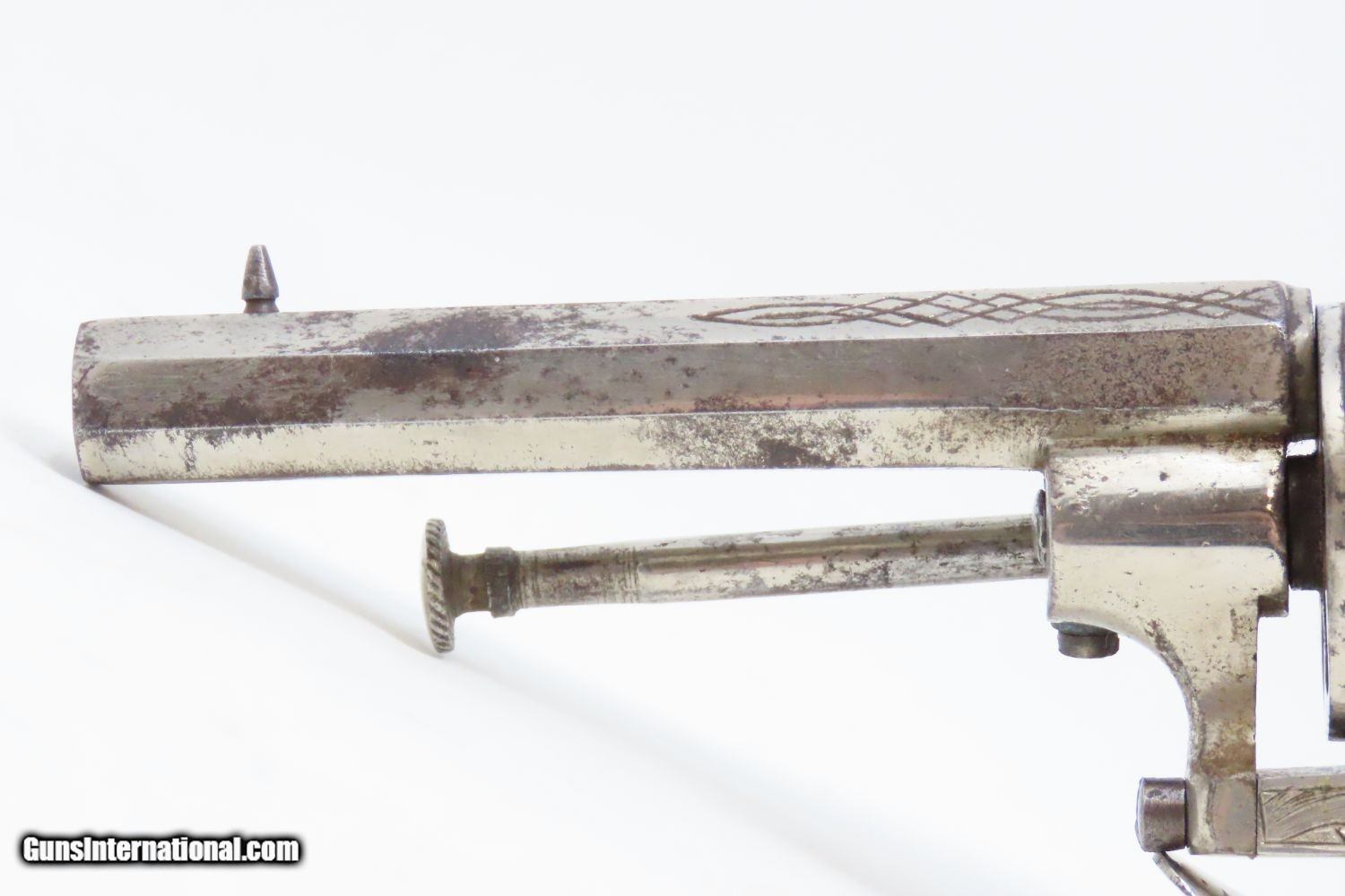 Description: Antique ENGRAVED & IVORY European PINFIRE Folding Trigger REVOLVER 7.65mm Engraved 7.65mm Sidearm with IVORY GRIPS! Here we present an antique European Pinfire Revolver, made circa the 1850s in Belgium. In 1830, notable gun maker and inventor Casimir Lefaucheux invented the pinfire cartridge and patented it in 1835 to become one of the first self-contained firearms cartridges. This very early design included a case with ball, powder and primer, but what made it different from what was to come later in cartridge development was the “firing pin” that projected out of the side of the case. It was this pin that was struck and detonated the primer inside. His son, Eugene, would build on Casimir’s invention, designing a pistol to take advantage of it. The hammer would be flat and smash down on the side of the cylinder, from which the pin of the cartridge would project. This revolver and pistol design would become prolific, especially in Europe throughout the 19th Century, being adopted by militaries, used by civilians and police, and even being sold for use during the American Civil War. Many makers made both licensed and unlicensed copies. This one is beautifully engraved with a nickel finish and ivory grips. It is equipped with a folding trigger for a little more compactness in the pocket and is capable of firing in double & single action mode. The overall condition is fine. Original nickel finish. The action is strong. The bore is in good shape. Both grips are firmly seated with a minimal amount of handling wear. The engravings remain sharp. A true gem of a revolver! Own the original! This is a legitimate antique and not a reproduction. Barrel is 3-1/4 inches. Caliber: 7.65mm Pinfire Overall condition as seen in photos. Very Fast. Very Safe. FREE SHIPPING WORLDWIDE. Delivered directly to your door by express mail! Guaranteed AUTHENTIC & Includes CERTIFICATE OF AUTHENTICITY. ancestryguns $1035 #201051 SOLD Antique: Yes |