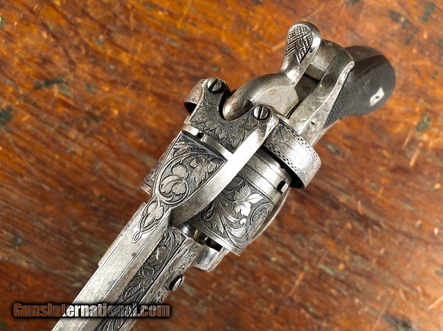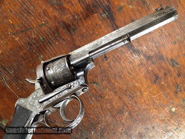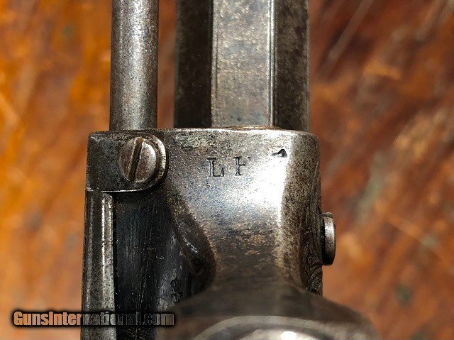 Description: Fine & Large Auguste Francotte, Liege, Belgium Relief Engraved Lefaucheux Double Action Revolver with Ebony Grips, 11mm Pinfire, mfg. circa 1870. Pictures don't do this gun justice! It is a very impressive high quality pistol in fantastic original condition. Auguste Francotte was of course one of the premier Belgian makers of fine arms throughout the 19th century and large caliber Lefaucheux style revolvers such as this were immensely popular among both American and European military officers. The pistol measures 11" long overall and features a 6" octagon barrel with an integral raised rib and topstrap fitted with a dovetailed high-blade front sight and standing single leaf rear. The gun is profusely engraved in relief style floral patterns with Lefaucheux's patent "LF" stamped under the forward portion of the frame and Auguste Francotte's Crown over "AF" proof struck on the frame and cylinder along with additional Liege markings. The finish has mostly thinned to gray with some bright bluing remaining within protected areas of the frame ahead of the cylinder. The surfaces are smooth with sharp edges and engraving throughout. The original checkered ebony grips fit perfect and show only light wear with no cracks, chips, or marring. Original hammer, trigger, screws, lanyard ring, loading gate, and cartridge extractor rod with spring retainer. The loading gate swings open and snaps shut like a vault. The action is flawlessly crisp in both single and double action and functions perfectly. Excellent bore with clean sharp seven-groove rifling front to back and only a couple tiny oxidation spots that should remove with a quick cleaning. There is even still bright bluing within the grooves! Weight is on the somewhat hefty side at 2 lbs 7 oz. You just don't see this size, quality, and condition very often - easily the nicest pinfire revolver we have offered in some time! Jeremiah Johnson Trading sells antique firearms manufactured prior to 1899 and muzzleloading blackpowder reproductions only. For the purpose of these conditions the term "antique firearm" will hence include muzzleloading blackpowder reproductions. Buyers must be 21 years of age or older and have no felony convictions to purchase antique firearms. Antique firearms do not require Federal licensing and may be shipped directly to the buyer with the following exceptions. No antique firearms will be shipped to Washington D. C. or any of the five boroughs of New York City (or residents thereof). Some restrictions may apply to antique firearms shipped to California and will be noted in the item description if applicable. Any handgun (antique or muzzleloading blackpowder reproduction) shipped to New Jersey must ship to a licensed FFL holder. Any muzzleloading blackpowder reproduction rifle, shotgun, or handgun shipped to Illinois must ship to an FFL holder. No international sales of antique firearms which may fire conventional metallic cartridges or any reproductions regardless of ignition. Antique muzzleloaders, or antiques which fire obsolete cartridges, may be shipped internationally however it is the responsibility of the buyer to know and abide by their local laws and provide proof that the antique arm is legal to receive and own. Payment can be made by money order, banker's check, personal check, or credit card (no fees). Please allow 7-10 business days for clearance on personal checks. If paying by credit card please call us directly to process your order. If not satisfied with an item within 3 days of receiving it, simply return the item in the same condition as shipped for a full refund, minus return shipping costs. Cleaning, disassembly, or altering of a firearm in any way will void inspection privileges. Layaway may be allowed upon negotiation, but will void inspection privileges. Buyer pays actual shipping & insurance costs. Occasionally a post-1898 firearm from my personal collection may be sold under this account however it will be noted that any such transaction is a personal sale in no way affiliated with our business. Any such arm will be shipped to a licensed FFL or C&R holder in accordance with Federal law. All firearms are sold as collector's items and are not warranted safe for shooting. Please consult a competent gunsmith prior to shooting any firearm. Message or call with any questions about this firearm, or any of our other items at 860-873-1092 (office) or 860-345-2100 (shop). SOLD Antique: Yes Manufacturer: Auguste Francotte Model: Lefaucheux Barrel Length: 6 Bore: 11mm Pinfire Manufacture Date: Circa 1870 Engraving: Yes |
