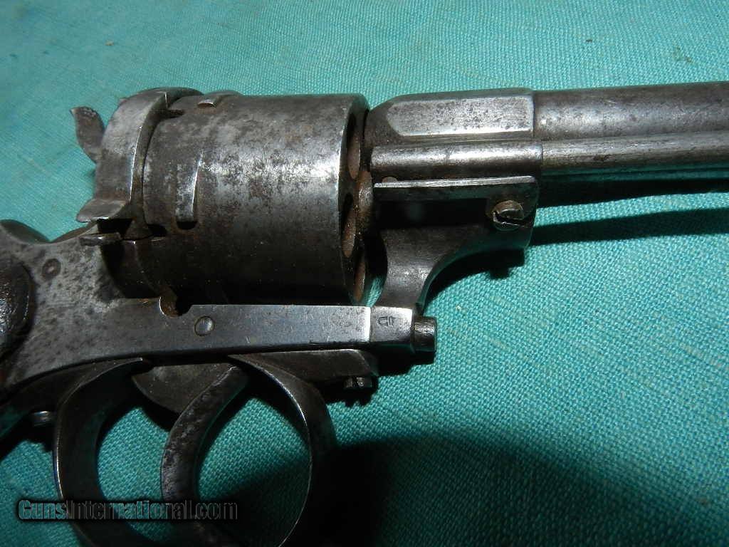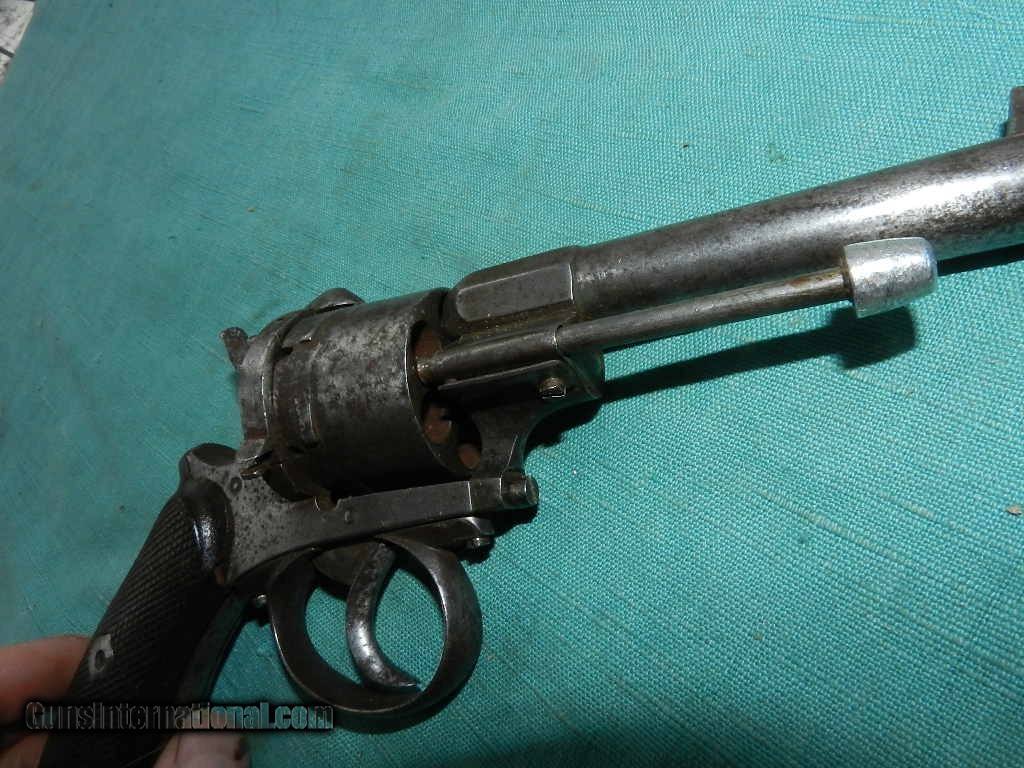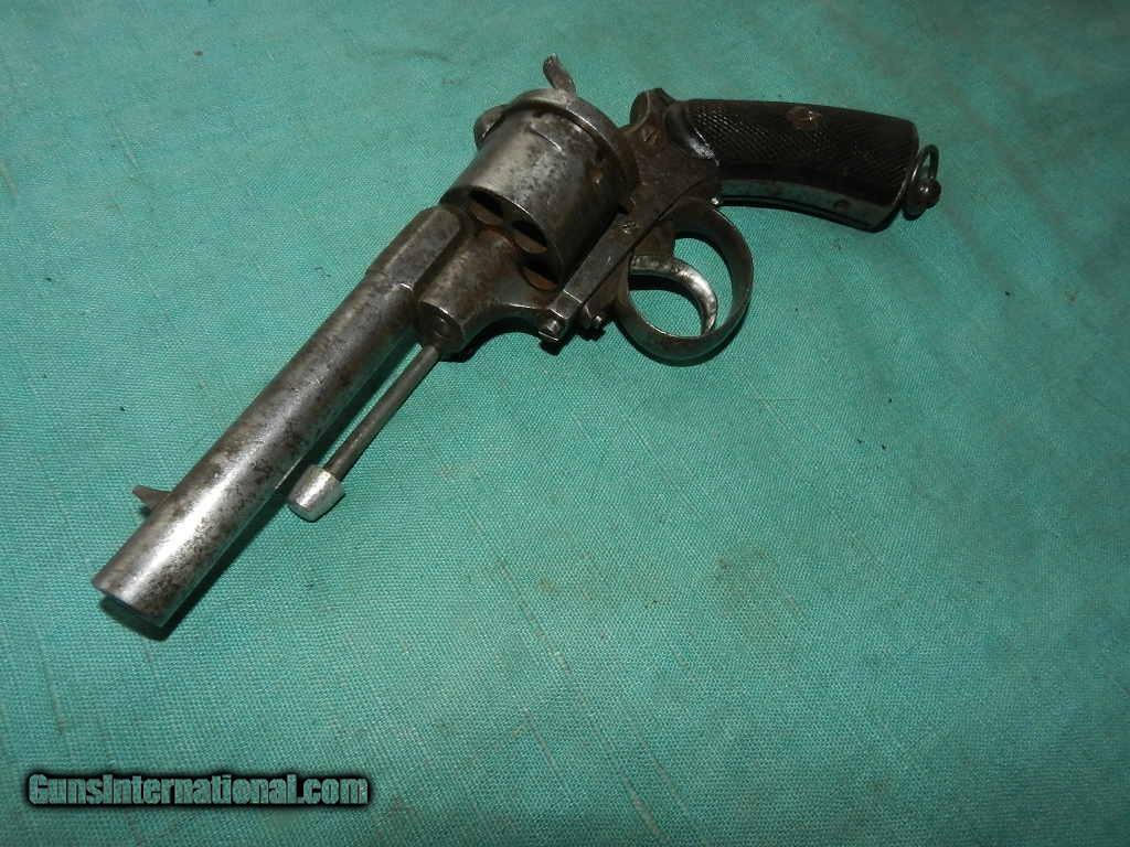 Description: <<< SOLD>>> Nagant type revolver of about 1850, chambered for the .36 PIN FIRE with a 4 1/2" round barrel with a dark bore, with good rifling and patches of corrosion. Exterior finish is mostly grey with areas of brown coloring and surface oxidation but not pitted. The European hand checkered walnut grips rate very good with one chip missing at the top of the left grip, and the gun has it's lanyard loop. Don't see any proofs or marks so it was made for export, may be Belgium or German! The hammer snaps and won't stay cocked, the cylinder won't won't always advance. Needs at least a trigger return spring. Check my inventory of rare grips, unusual gun parts, barrels and holsters. Shipping may be higher than stated as shippers raise their prices twice year without notice! When buying a gun always have it examined by a competent gunsmith before shooting. To buy a gun from me you must get a direct email for me, with details, and shipping cost. We don’t have a web site .I prefer money orders or a check. Item ships when funds come in. If you can only pay with a card let me know. I try to keep guns affordable, which means I make less money than most dealers. You won’t get altitude sickness, or nose bleed, with my prices! I consistently have the best selection of older guns If you attempt to buy, you must still contact us for details . Best to email to buy. Sometimes a local person can stop buy and purchase before the gun is removed. Sometimes not home to get calls. Some guns are required shipment to a gun dealer near you for a transfer to you when it arrives. Otherwise many older or black powder guns ship to your door. With the widest selection of older guns at great prices, We don’t have a store, and sell on the internet only. I’m easy to get along with. Thank You. SOLD Antique: Yes |