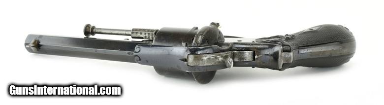French Pinfire Revolver. Six shots, approximately .30 caliber (7.5mm Pinfire?). Excellent bore. Action works perfectly. Gun has approximately 60-70% blue. The grips are beautifully modeled with flourishing scrolls and fine checkering. Barrel 4” length. 7 ½” overall. No makers mark. No proofs. So, we think it’s French. Well made.
