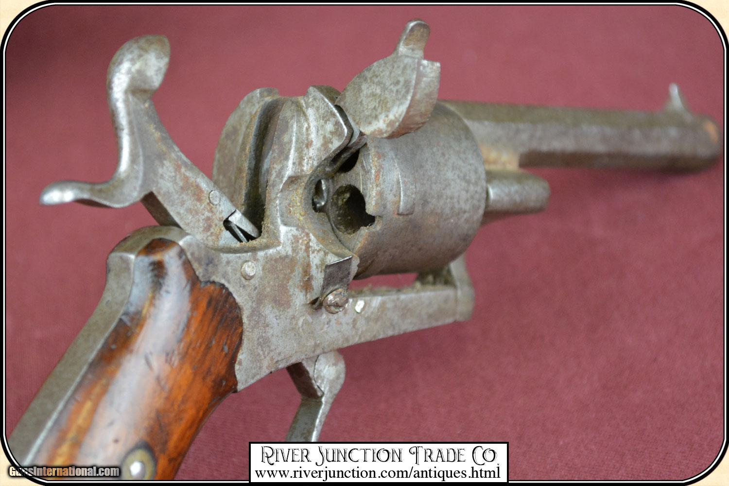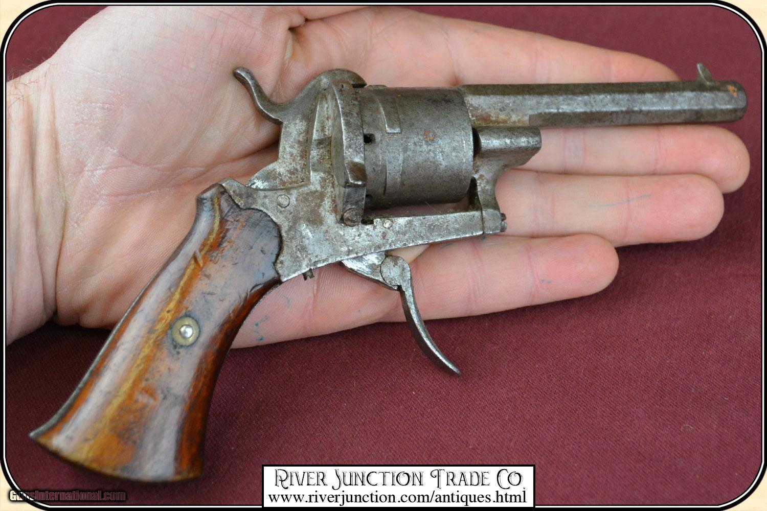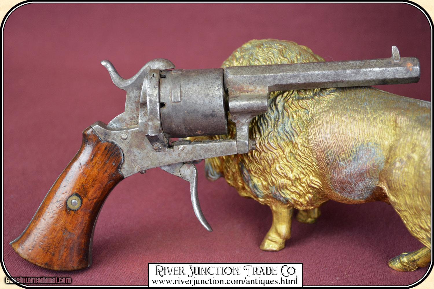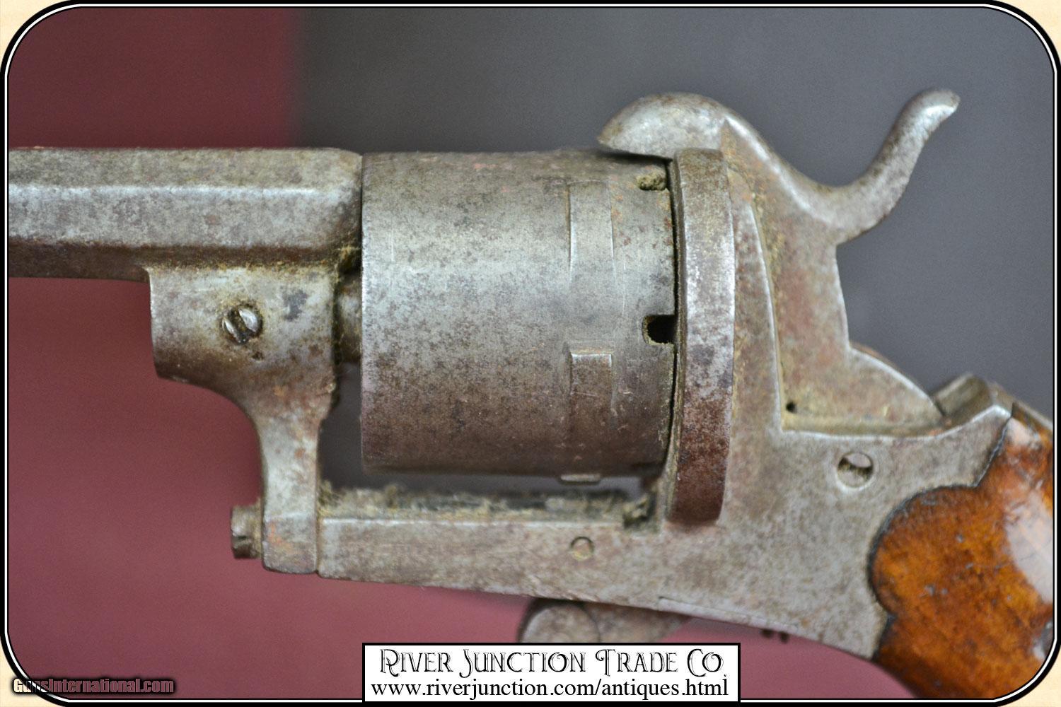 Description: This is a 7mm (about .32 ) Belgium Pin-fire revolver. This is a neat Civil War, or Indian War era revolver, probably used by ladies as a muff or garter pistol, or a gamblers hideaway revolver. This revolver is mechanically perfect. A neat tiny example of the pinfire revolver that would be an unusual addition to your outfit. This is an ANTIQUE and can be shipped directly to you. Sold as an Antique ~ no guarantees, warranties, or liabilities for any actual usage. If any firearms are to be used for shooting purposes, a qualified gunsmith should inspect them first. Adult signature required. Payment Cash, postal money order, cashiers check, personal & business checks. Can be ordered with a credit card or paypal at wxx.riverjunction,cxx just type in the number 4527 in the search box. SOLD |