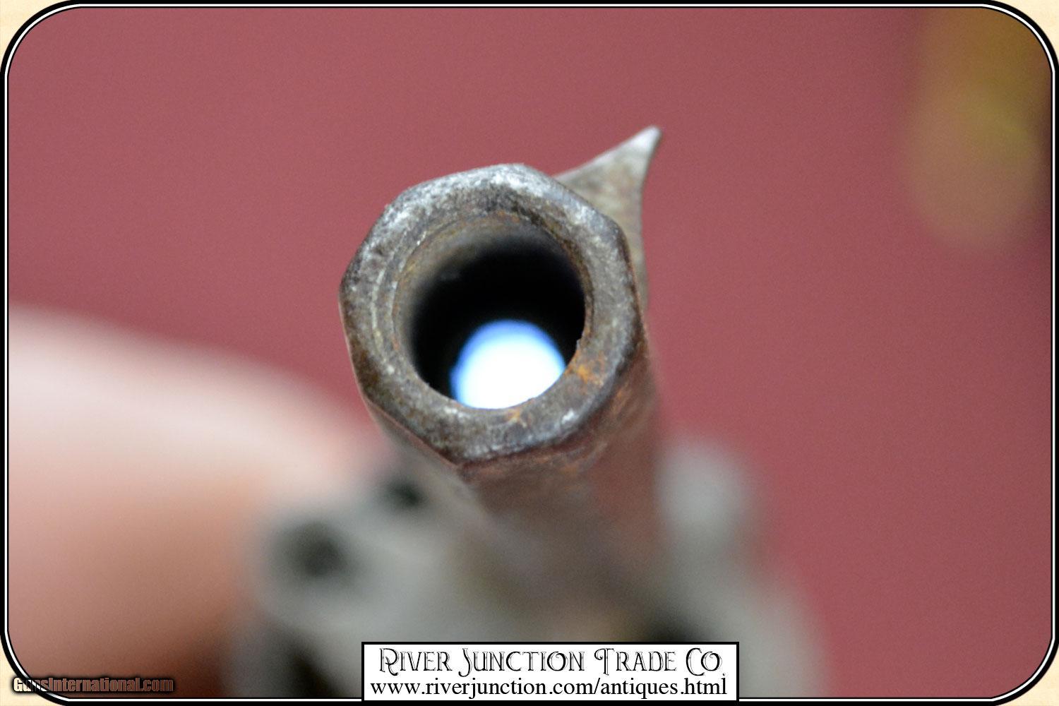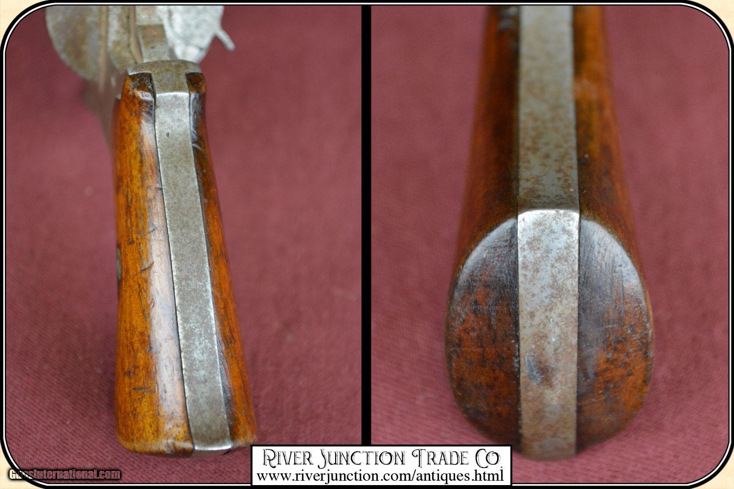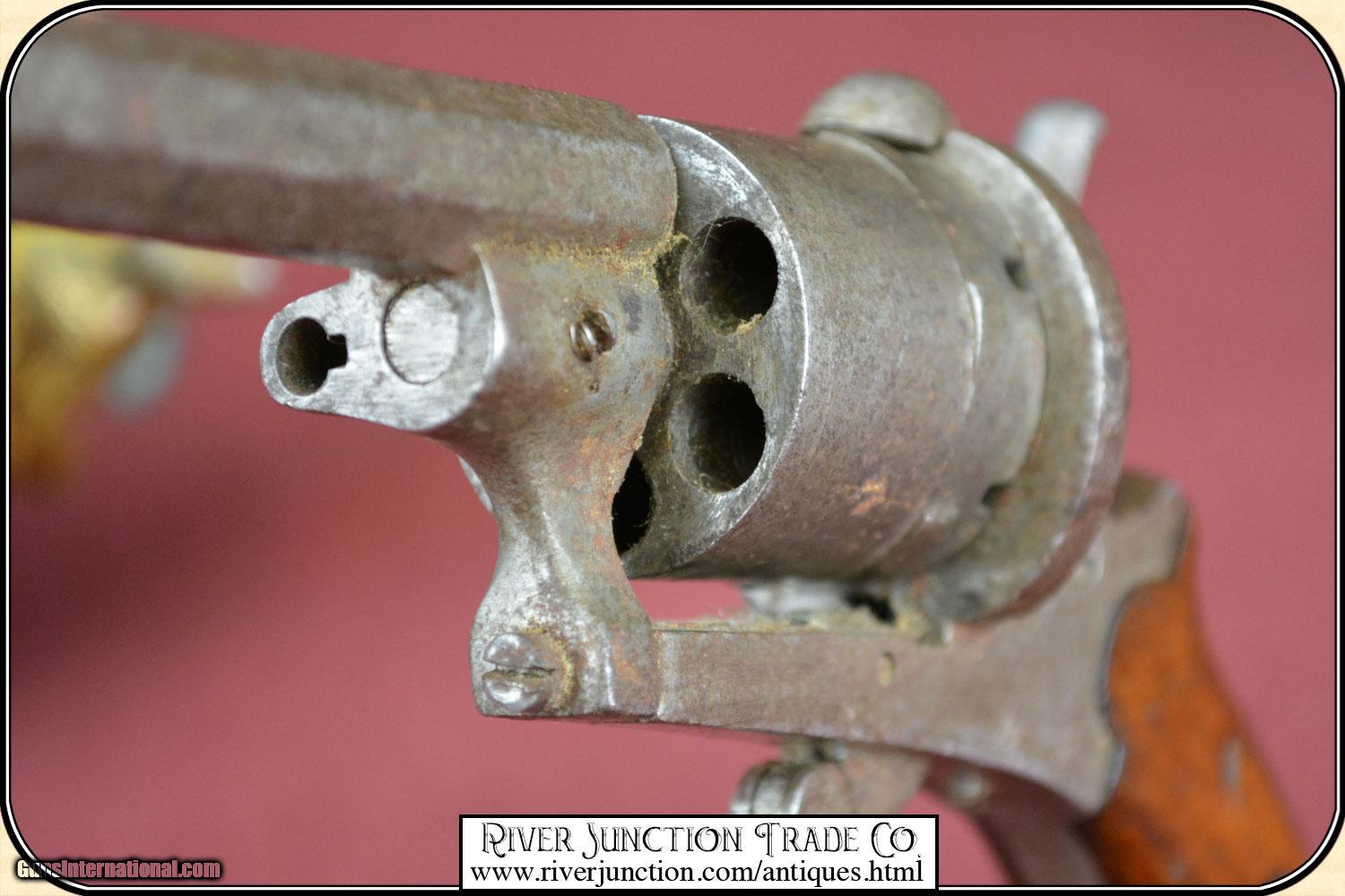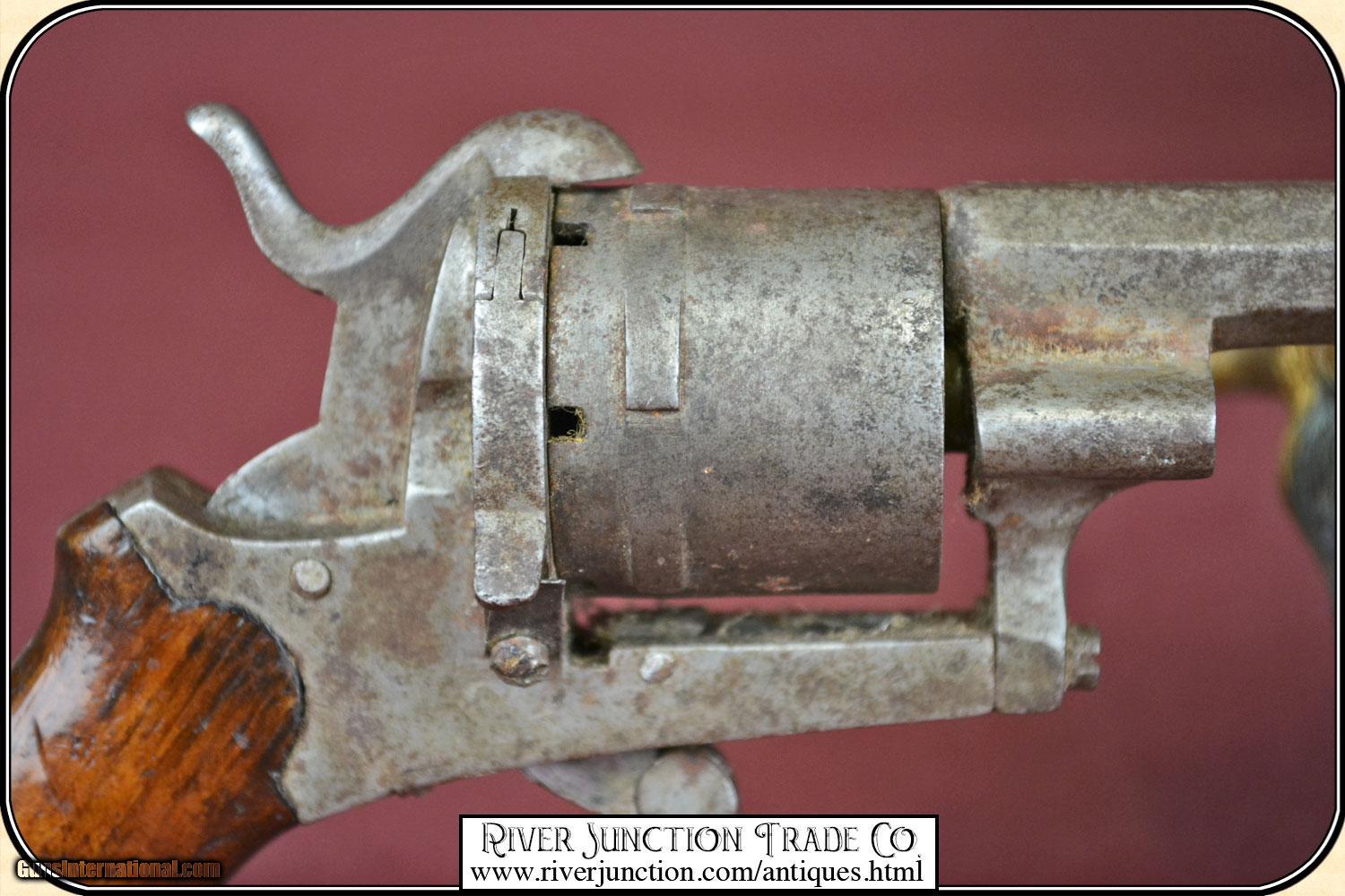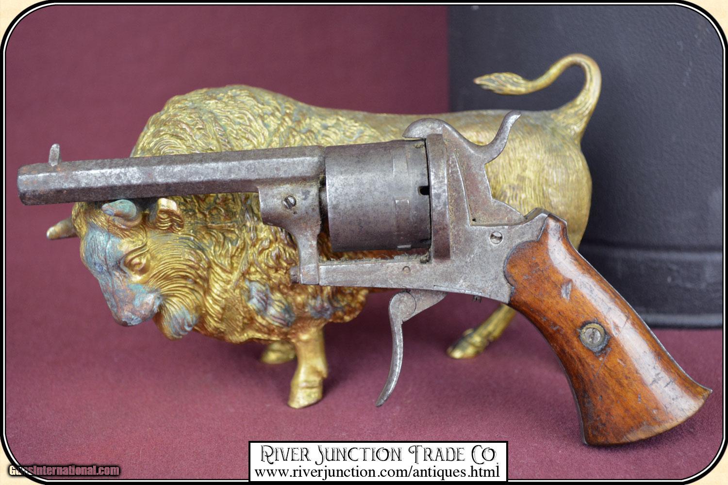Description: This is a 7mm (about .32 ) Belgium Pin-fire revolver. This is a neat Civil War, or Indian War era revolver, probably used by ladies as a muff or garter pistol, or a gamblers hideaway revolver. This revolver is mechanically perfect. A neat tiny example of the pinfire revolver that would be an unusual addition to your outfit. This is an ANTIQUE and can be shipped directly to you. Sold as an Antique ~ no guarantees, warranties, or liabilities for any actual usage. If any firearms are to be used for shooting purposes, a qualified gunsmith should inspect them first. Adult signature required. Payment Cash, postal money order, cashiers check, personal & business checks. Can be ordered with a credit card or paypal at wxx.riverjunction,cxx just type in the number 4527 in the search box. SOLD |