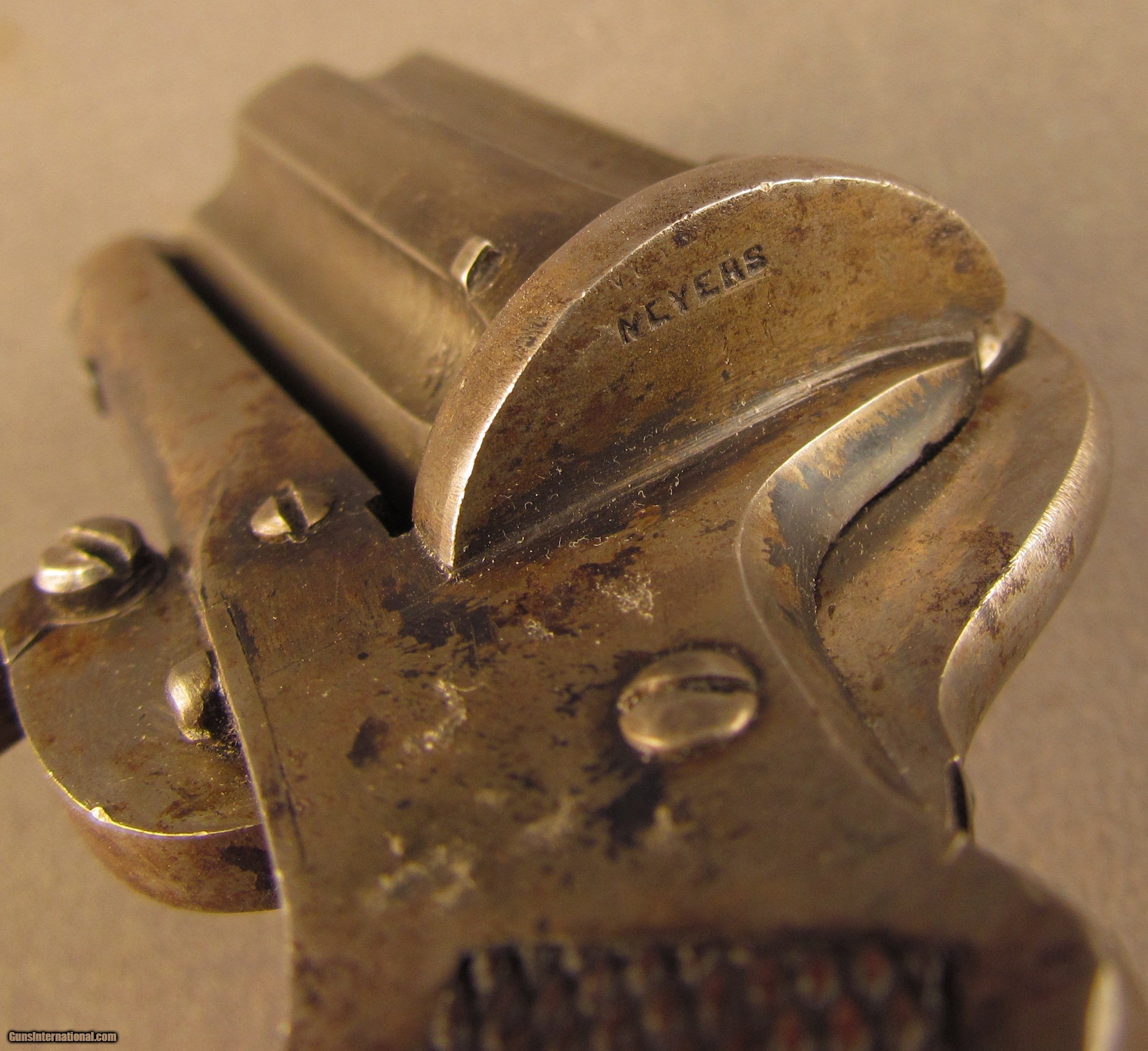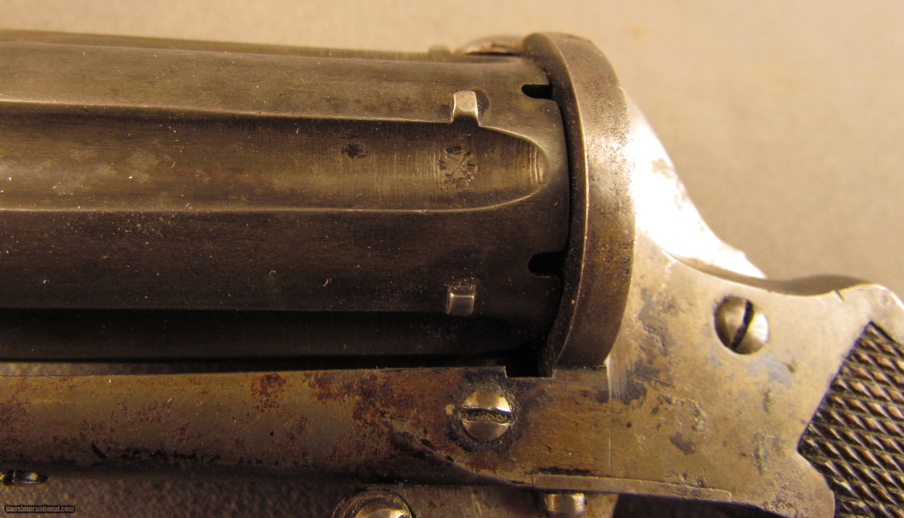 Description: NSN, 7mm Pinfire, 1 15/16" barrel cluster with fine, bright bores. This is a very well made, iron frame pepperbox with folding trigger and British proofs. The metal has an overall dark pewter gray patina with traces of the original bright blue remaining on the frame, mostly on the sides of the hammer, and on the recoil shield. The checkered walnut, bag-shaped grips are in fine shape with light-moderate flattening of the points, and the original ejector rod is still present in its threaded seat at the butt. Aside from the London proofs on the 6-shot barrel cluster, the only marking on the gun is a small “MEYERS" on the left recoil shield (probably a retailer). The action and lock-up are still solid, and the action functions flawlessly. This is a great little pinfire pepperbox, and is in fine-near excellent condition. Antique SOLD Antique: Yes Manufacturer: Meyers Model: Pepperbox Caliber Info: 7mm Gauge Info: 7mm |