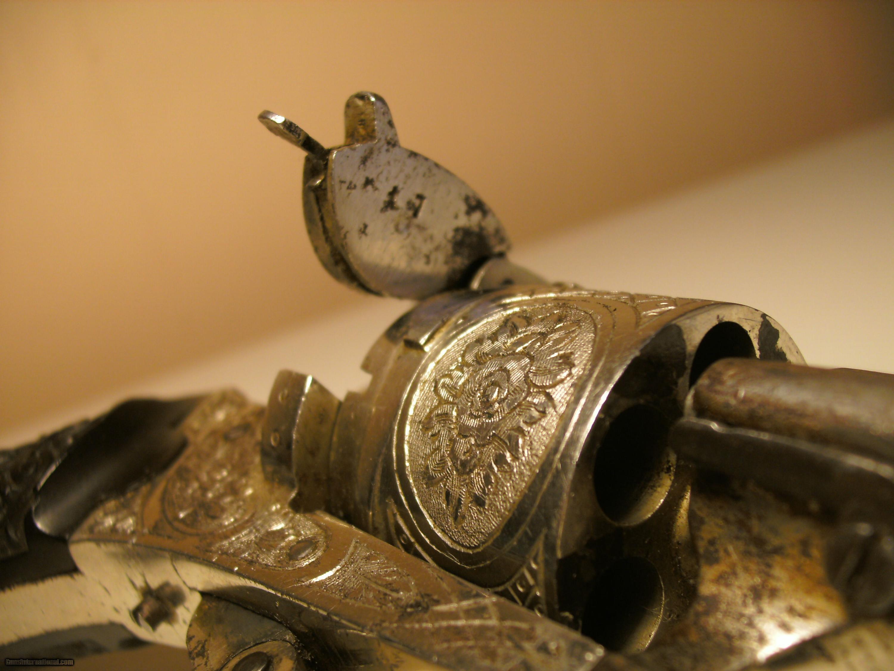 Description: Six shot 7mm Pinfire Revolver i believe it is Belgian. The gun is nickle plated and highly engraved with fancy bakelite grips. It is in working condition timing is correct with a good hammer drop. Please contact me with any questions. This is an antique and can be shipped to you. No sales to Califronia, NJ, NYC, or DC. FREE SHIPPING SOLD Antique: Yes |