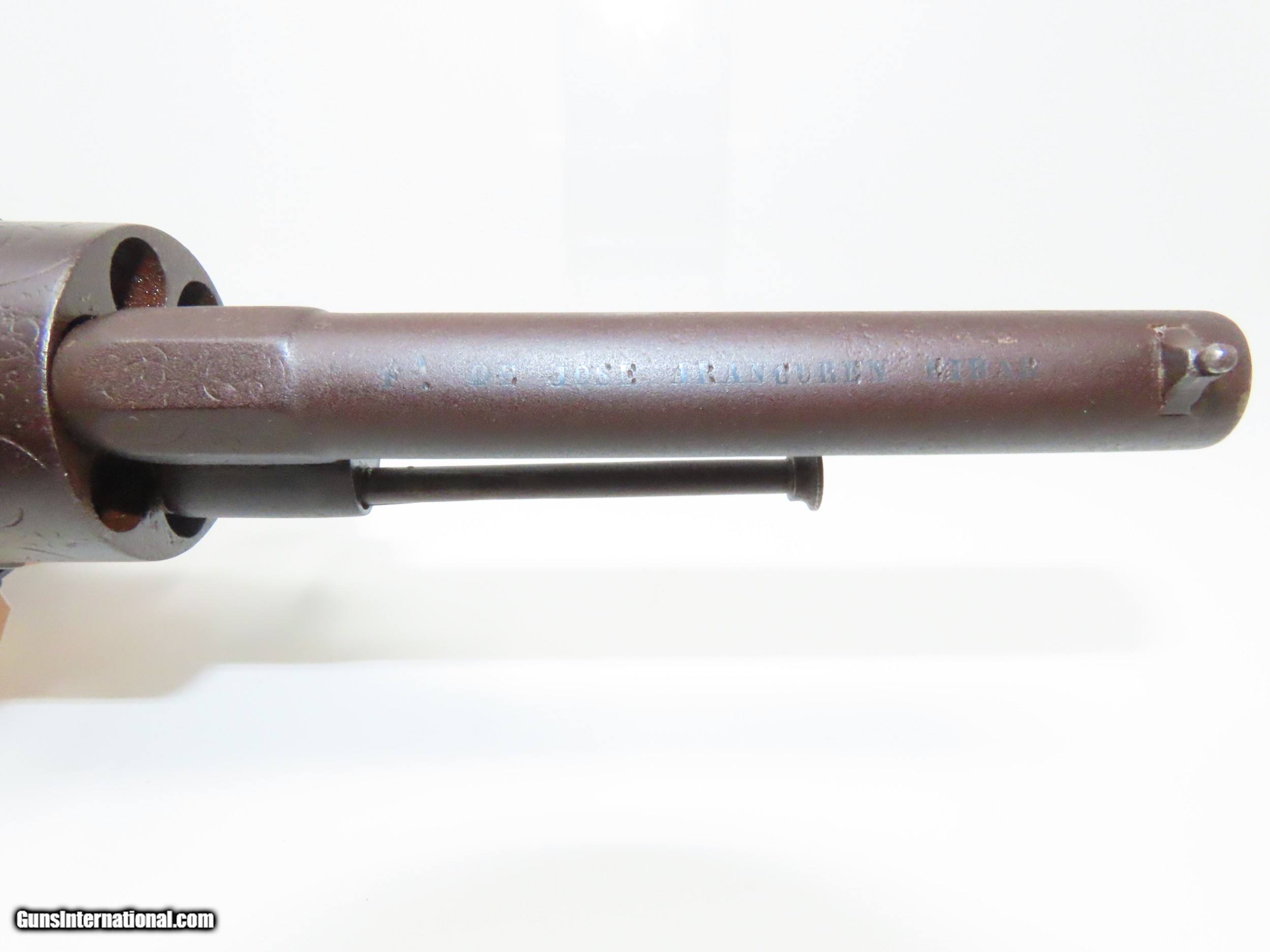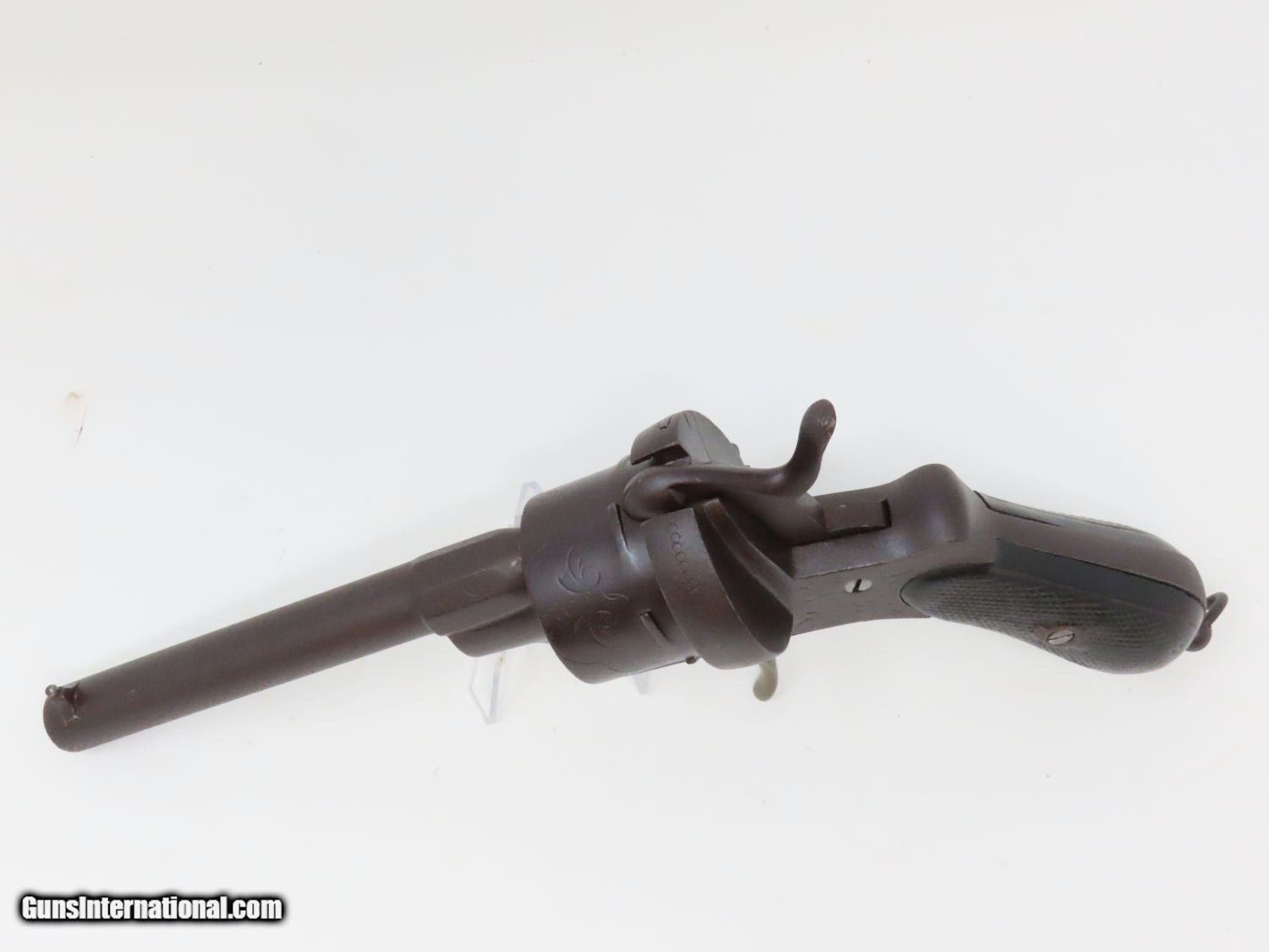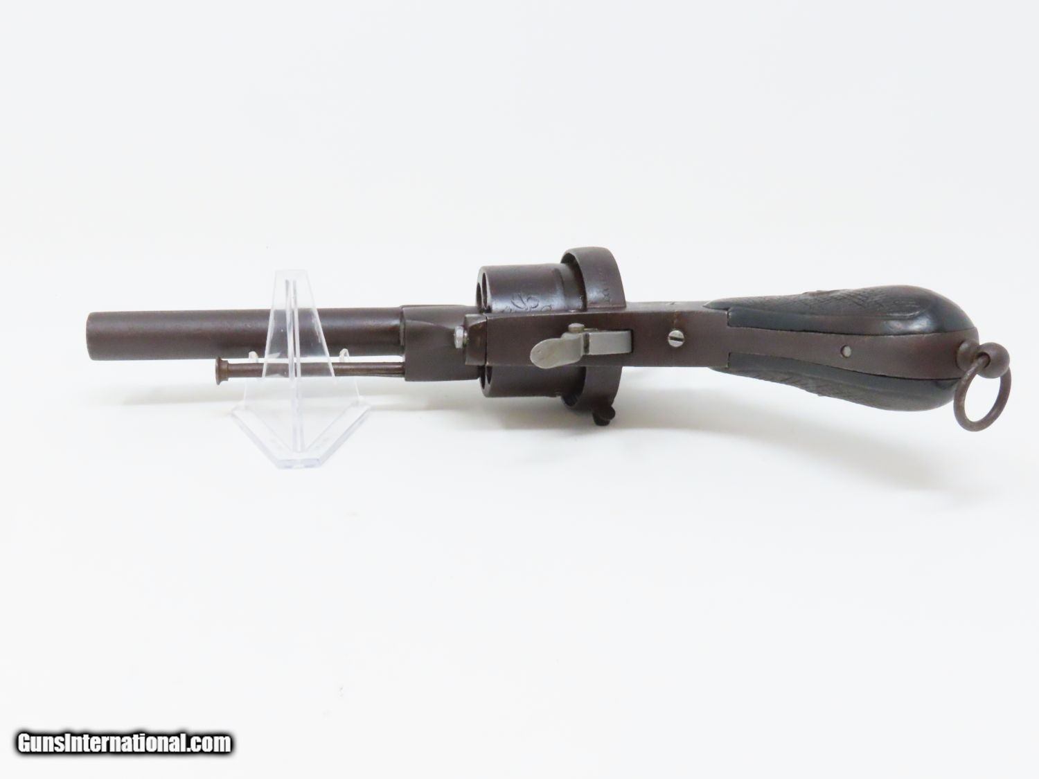 Description: SPANISH Antique PINFIRE Service Revolver Made by JOSE ARANGUREN of EIBAR 11.43mm/.45 Caliber Double Action Revolver! Here we present an antique Spanish Revolver in .45 caliber, made by Jose Aranguren in Eibar, circa the 1860s. In 1830, notable gun maker and inventor Casimir Lefaucheux invented the pinfire cartridge and patented it in 1835 to become one of the first self-contained firearms cartridges. This very early design included a case with ball, powder and primer, but what made it different from what was to come later in cartridge development was the “firing pin” that projected out of the side of the case. It was this pin that was struck and detonated the primer inside. His son, Eugene, would build on Casimir’s invention, designing a pistol to take advantage of it. The hammer would be flat and smash down on the side of the cylinder, from which the pin of the cartridge would project. This revolver and pistol design would become prolific, especially in Europe throughout the 19th Century, being adopted by militaries, used by civilians and police, and even being sold for use during the American Civil War. Many makers made both licensed and unlicensed copies. This one is marked on the top of the barrel “FA DE JOSE ARANGUREN EIBAR”. Light floral engraving on the cylinder and frame. Folding trigger and a lanyard ring. The overall condition is good. The bore is in good condition with strong rifling. The action (hammer/trigger) is strong. The cylinder does not currently revolve. Own the original! This is a legitimate antique and not a reproduction. Barrel is 5-1/2 inches. Caliber: 11.43mm (.45 caliber) Pinfire Overall condition as seen in photos. Very Fast. Very Safe. FREE SHIPPING WORLDWIDE. Delivered directly to your door by express mail! Guaranteed AUTHENTIC & Includes CERTIFICATE OF AUTHENTICITY. ancestryguns $650 #20682 SOLD Antique: Yes |