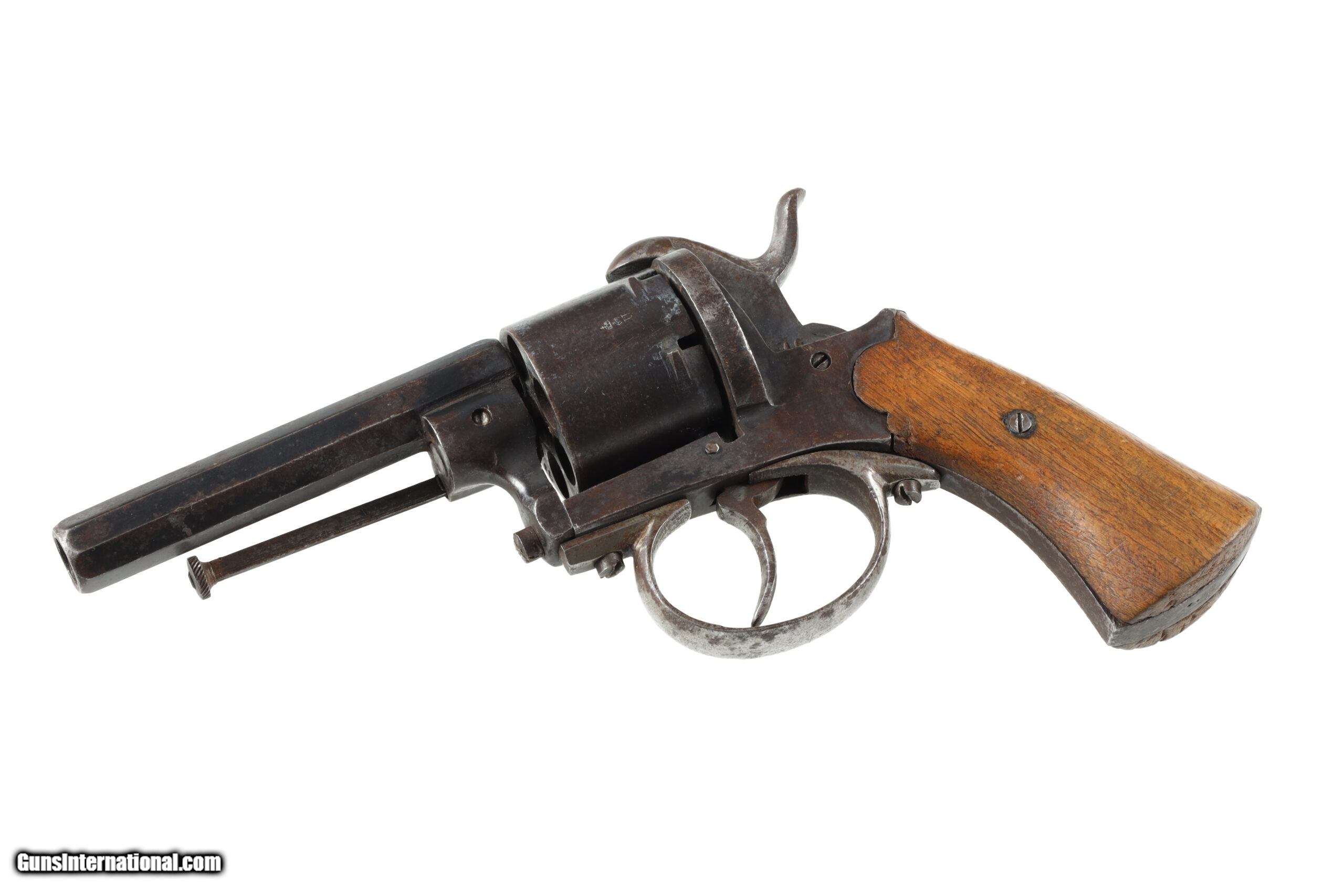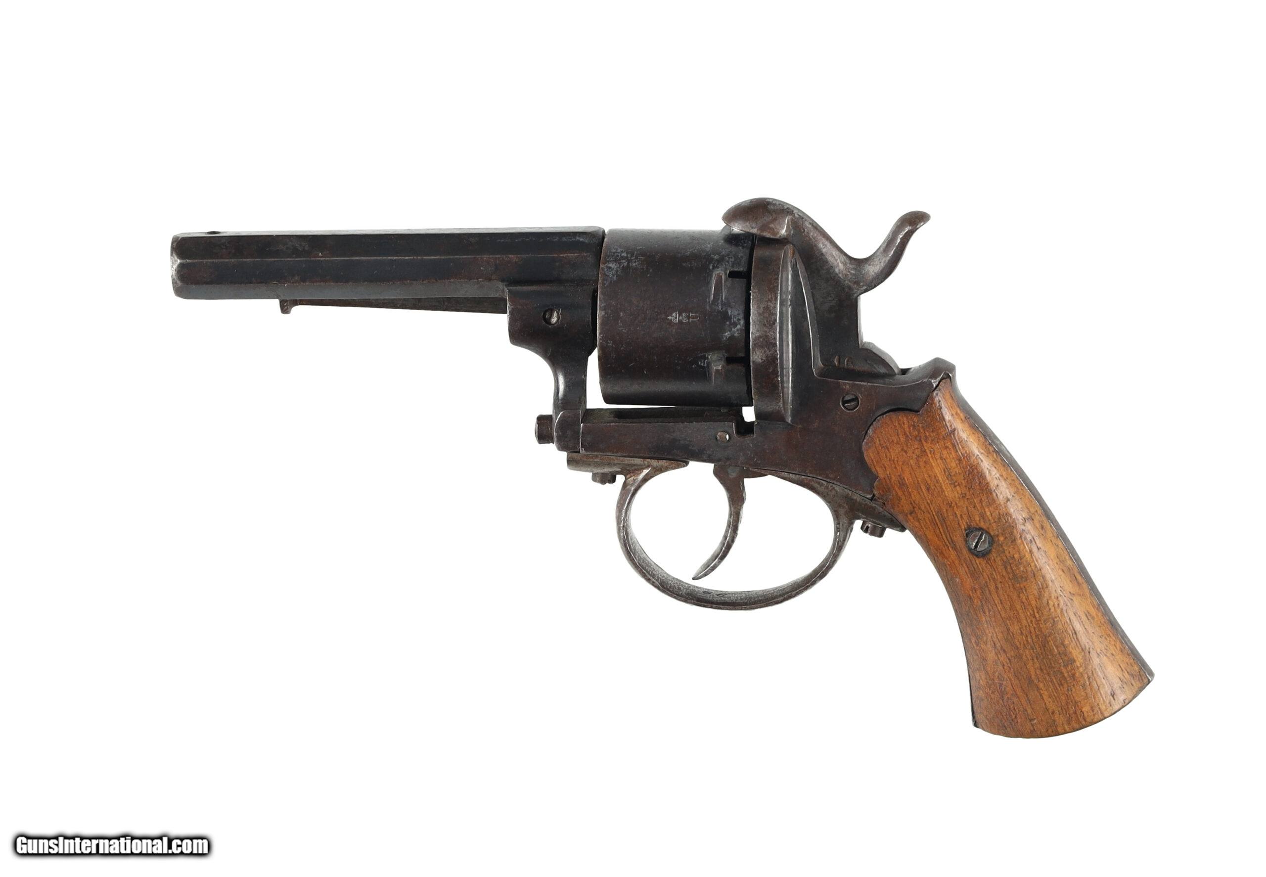 Description: This 9mm Pinfire revolver of unknown make or model is in good overall condition, with wear fitting its antique nature, and the only serious flaw being the missing front sight. The internals of this revolver seem to be in good function and the smoothbore barrel has no serious corrosion. This revolver bears German proofs so it could be assumed that it comes from one of the German guilds as it bears an uncanny resemblance to Belgian pistols built nearby around the same period. Manufactured in: Germany Hand: Right Hand Action Finish: Blue Metal Finish: Original Barrel Length: 3.35 Inches Barrel Condition: Fair Stock Finish: Original Stock Condition: Good Grip: Pistol SOLD Manufacturer: Unknown Model: Unknown Caliber Info: 9mm Pinfire Condition: Preowned Metal Condition: Good Action: Revolver Triggers: Single Finish: Original Weight: 1.0 lbs Case: NONE |