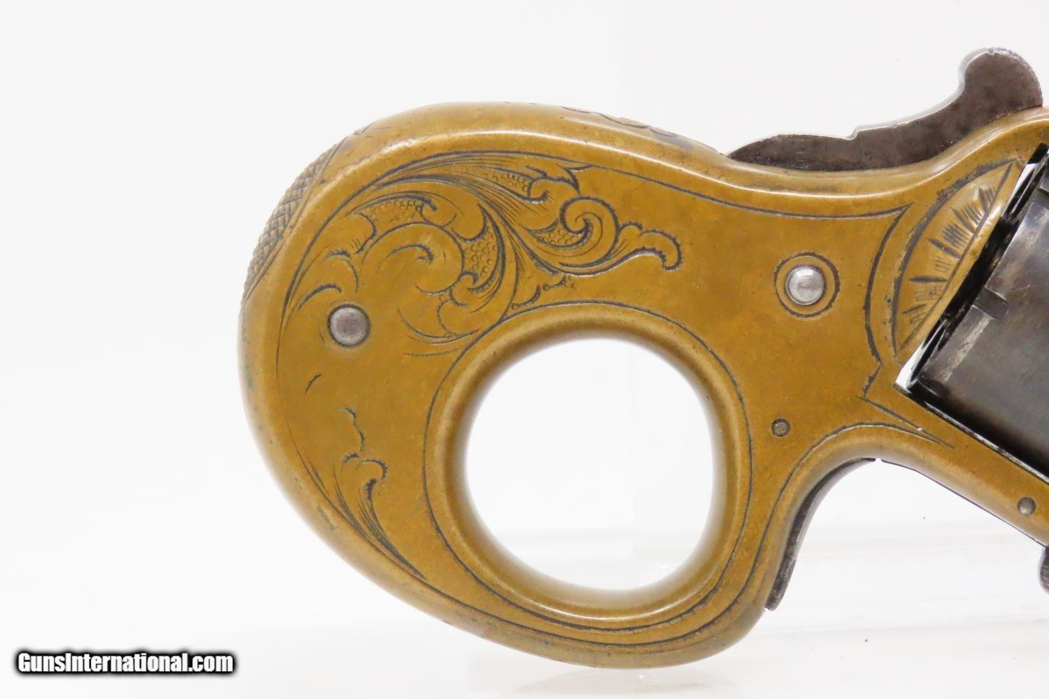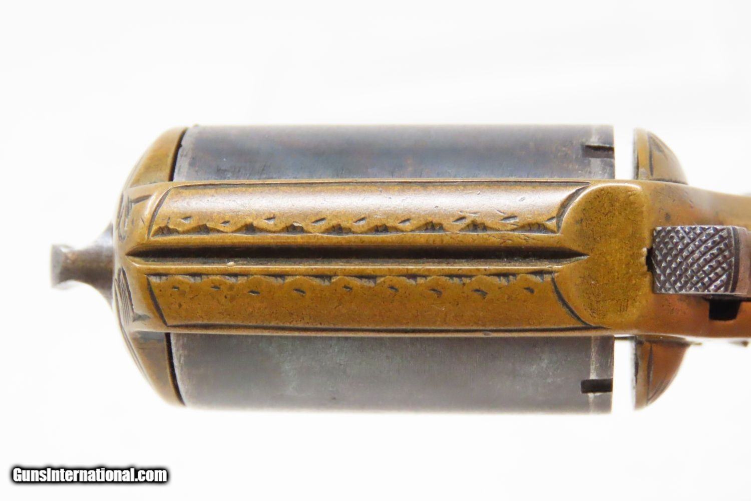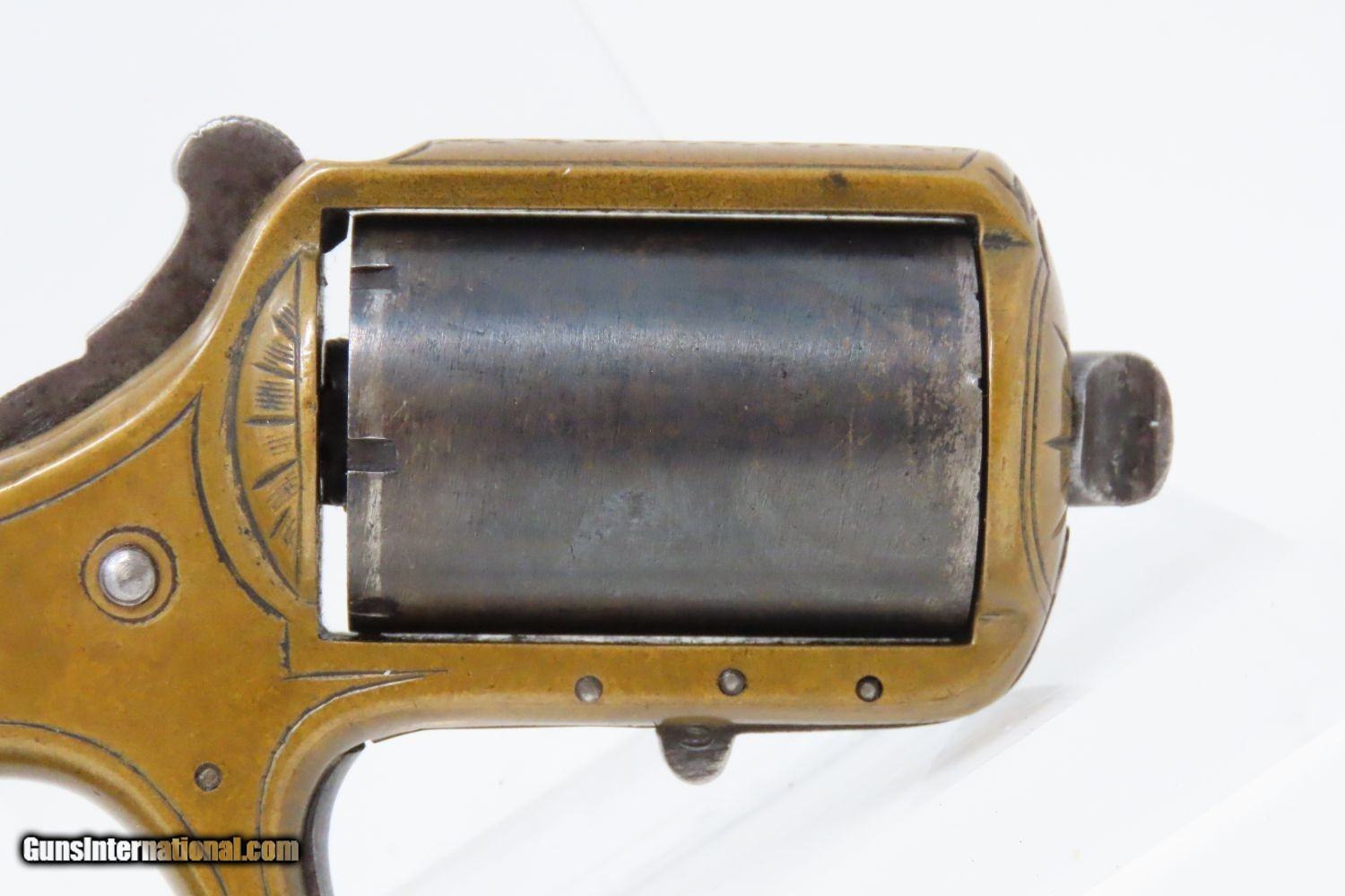 Description: “MY FRIEND” KNUCKLE-DUSTER Antique JAMES REID Catskills .22 Short REVOLVER 1870s 7-Shot Revolver with Heavy “KNUCKLER” Frame Here we present an antique James Reid Manufactory “My Friend” Knuckler Revolving Pistol, made circa 1876. Only 3,100 of these were produced from 1870 through 1882, making them quite scarce. The maker, James Reid, was born in Belfast, Ireland, was trained as a gunsmith in Glasgow, Scotland, and then migrated to the United States where he first set up shop in New York City. In 1865, he moved his family and then his shop to Catskill to get out of the city and into the country for health reasons. He kept a gristmill and his gun manufactory where he spent the next decade and a half producing his famous little gun, and was successful in spite of the fierce competition of 1870s small arms manufacturing. This was a time when small, single action pocket revolvers were so plentiful that Colt could hardly compete. But this pistol had the seven shots of .22 and the ability to be turned around and used to knock some teeth out. Not a bad feature on a revolver for a rough and tumble end of the 19th Century. Certainly no wonder why it would be called “My Friend”. The cylinder holds 7 shots of .22 rimfire. This one is one of the earlier pieces with a serial number of 4000, along with the rare and desirable “MY FRIEND” marking under the cylinder on the left side of the frame, as well as the safety feature built into the underside of the frame. This last feature is, in essence, a cylinder stop that prevents the revolving of the cylinder without first depressing the tab (visible on the bottom) to disengage the stop (which is a round piece that fits into the 6 O’Clock chamber muzzle). This is an interesting little device that is quite uncommon on these revolvers and it is plain to see why this was omitted down the road. It was simply unnecessary for a single action revolver and makes the operation of such a small handgun rather tedious. The overall condition is very good. The brass frame bears a nice patina, and the cylinder has good blue remaining. The chambers are smooth and in good condition. The engraving remains sharp. The action is excellent. This is a fantastic piece for the collection. This is a legitimate antique and not a reproduction. Barrel Length is 1-1/2 inches. Caliber: .22 Rimfire (Short, black powder) Overall condition as seen in photos. Very Fast. Very Safe. FREE SHIPPING WORLDWIDE. Delivered directly to your door by express mail! Guaranteed AUTHENTIC & Includes CERTIFICATE OF AUTHENTICITY. ancestryguns $3625 #215337 SOLD Antique: Yes |