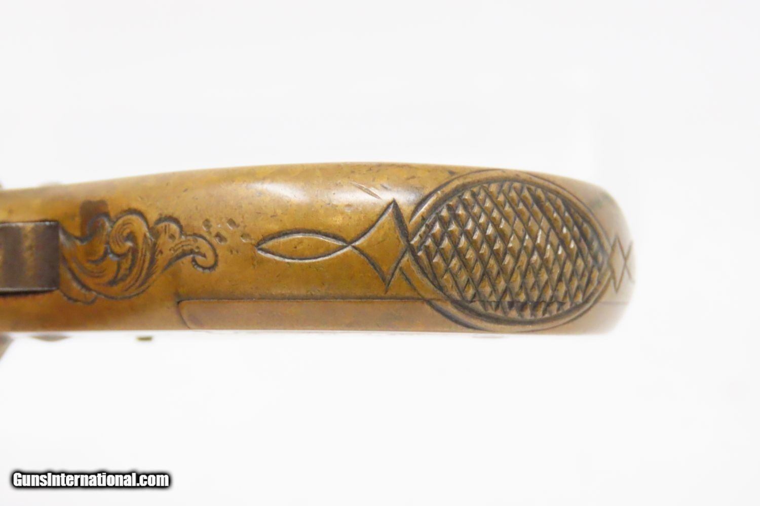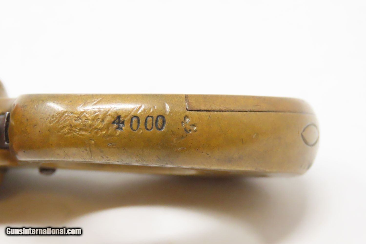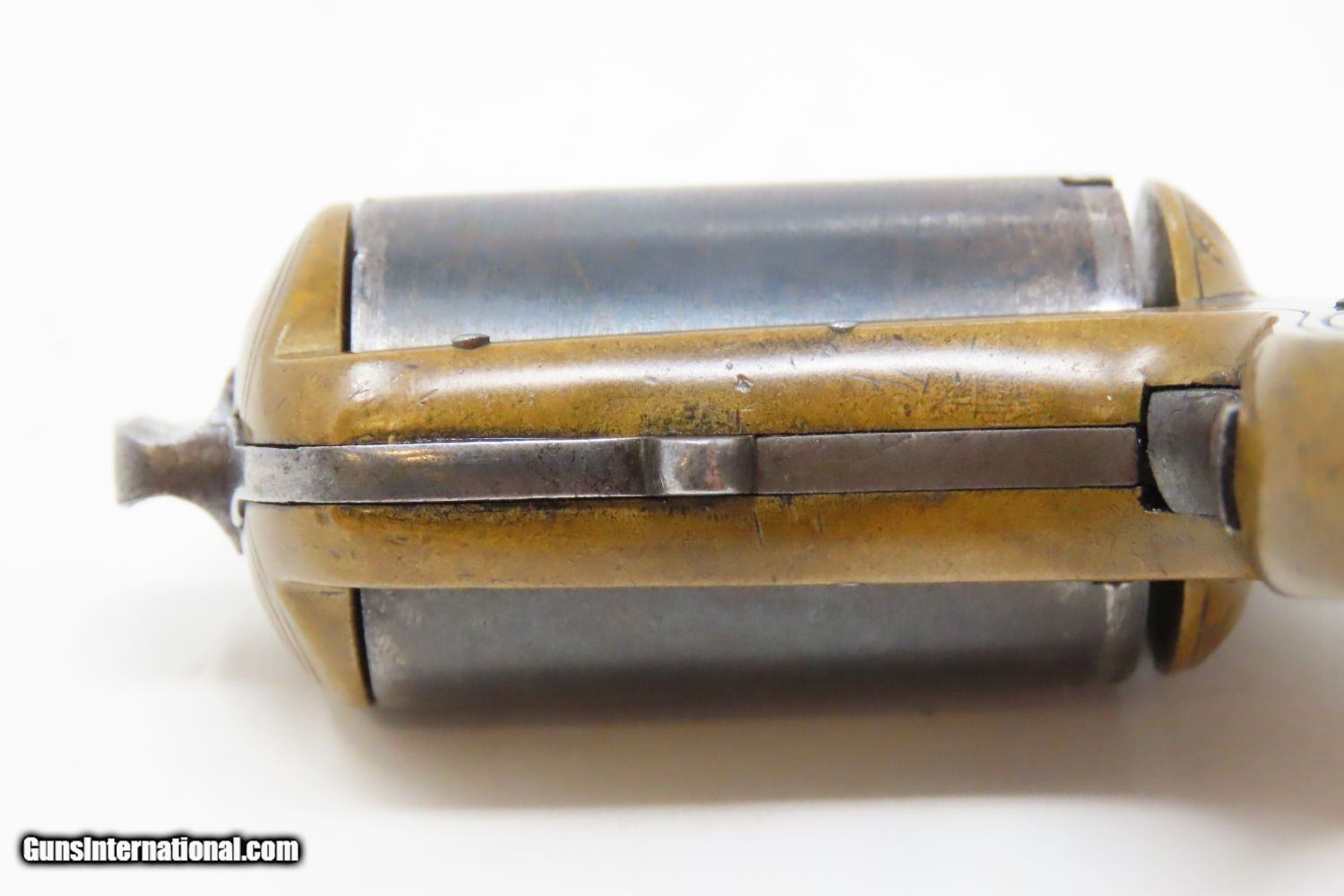 Description: “MY FRIEND” KNUCKLE-DUSTER Antique JAMES REID Catskills .22 Short REVOLVER 1870s 7-Shot Revolver with Heavy “KNUCKLER” Frame Here we present an antique James Reid Manufactory “My Friend” Knuckler Revolving Pistol, made circa 1876. Only 3,100 of these were produced from 1870 through 1882, making them quite scarce. The maker, James Reid, was born in Belfast, Ireland, was trained as a gunsmith in Glasgow, Scotland, and then migrated to the United States where he first set up shop in New York City. In 1865, he moved his family and then his shop to Catskill to get out of the city and into the country for health reasons. He kept a gristmill and his gun manufactory where he spent the next decade and a half producing his famous little gun, and was successful in spite of the fierce competition of 1870s small arms manufacturing. This was a time when small, single action pocket revolvers were so plentiful that Colt could hardly compete. But this pistol had the seven shots of .22 and the ability to be turned around and used to knock some teeth out. Not a bad feature on a revolver for a rough and tumble end of the 19th Century. Certainly no wonder why it would be called “My Friend”. The cylinder holds 7 shots of .22 rimfire. This one is one of the earlier pieces with a serial number of 4000, along with the rare and desirable “MY FRIEND” marking under the cylinder on the left side of the frame, as well as the safety feature built into the underside of the frame. This last feature is, in essence, a cylinder stop that prevents the revolving of the cylinder without first depressing the tab (visible on the bottom) to disengage the stop (which is a round piece that fits into the 6 O’Clock chamber muzzle). This is an interesting little device that is quite uncommon on these revolvers and it is plain to see why this was omitted down the road. It was simply unnecessary for a single action revolver and makes the operation of such a small handgun rather tedious. The overall condition is very good. The brass frame bears a nice patina, and the cylinder has good blue remaining. The chambers are smooth and in good condition. The engraving remains sharp. The action is excellent. This is a fantastic piece for the collection. This is a legitimate antique and not a reproduction. Barrel Length is 1-1/2 inches. Caliber: .22 Rimfire (Short, black powder) Overall condition as seen in photos. Very Fast. Very Safe. FREE SHIPPING WORLDWIDE. Delivered directly to your door by express mail! Guaranteed AUTHENTIC & Includes CERTIFICATE OF AUTHENTICITY. ancestryguns $3625 #215337 SOLD Antique: Yes |