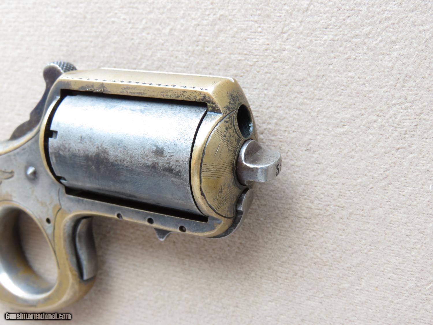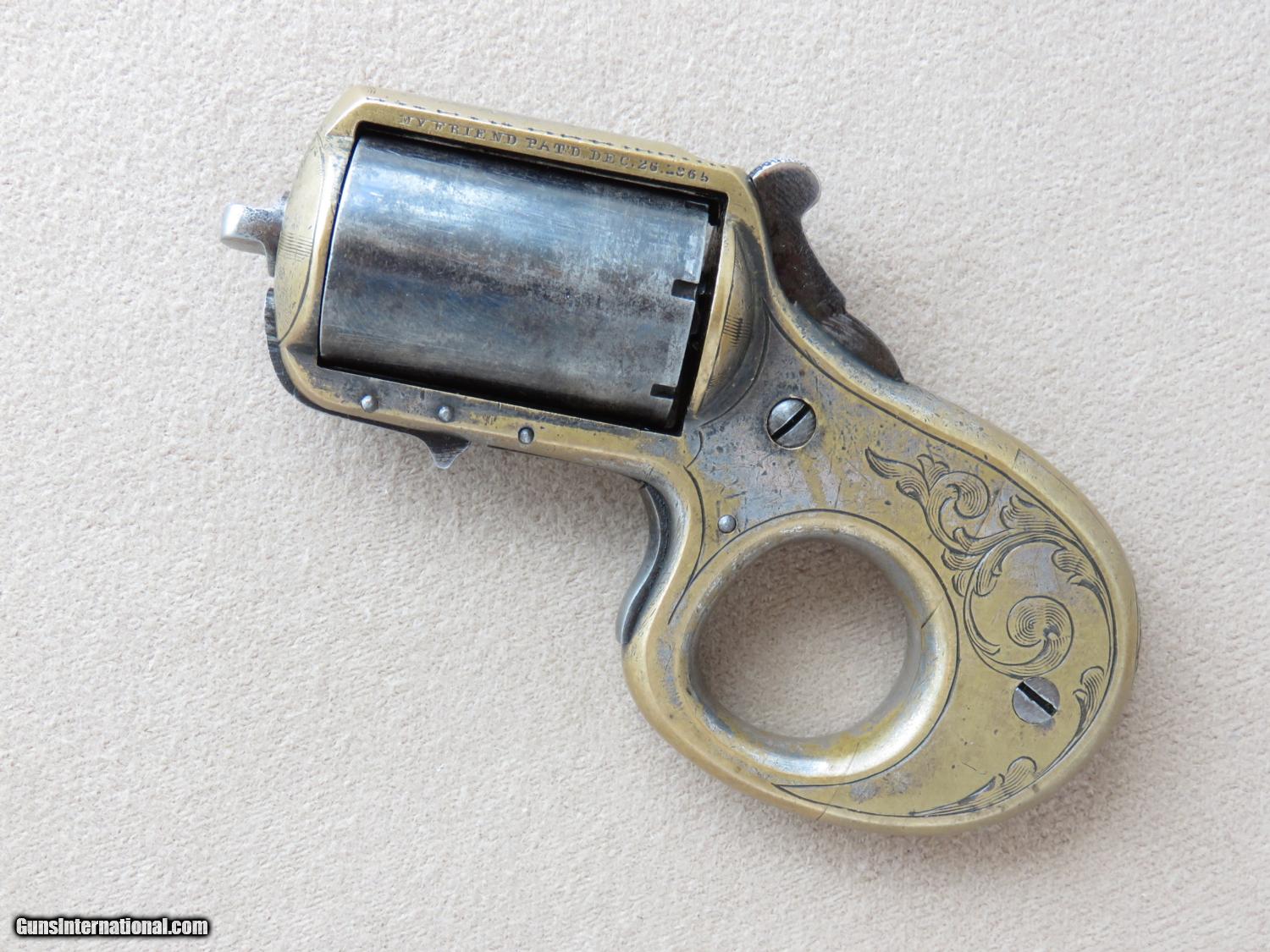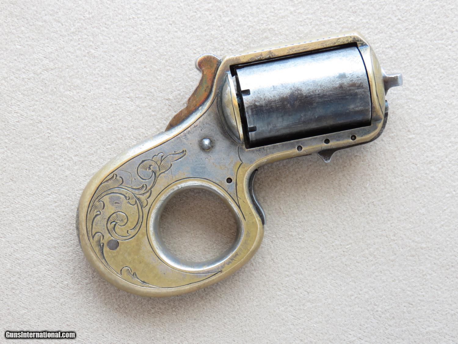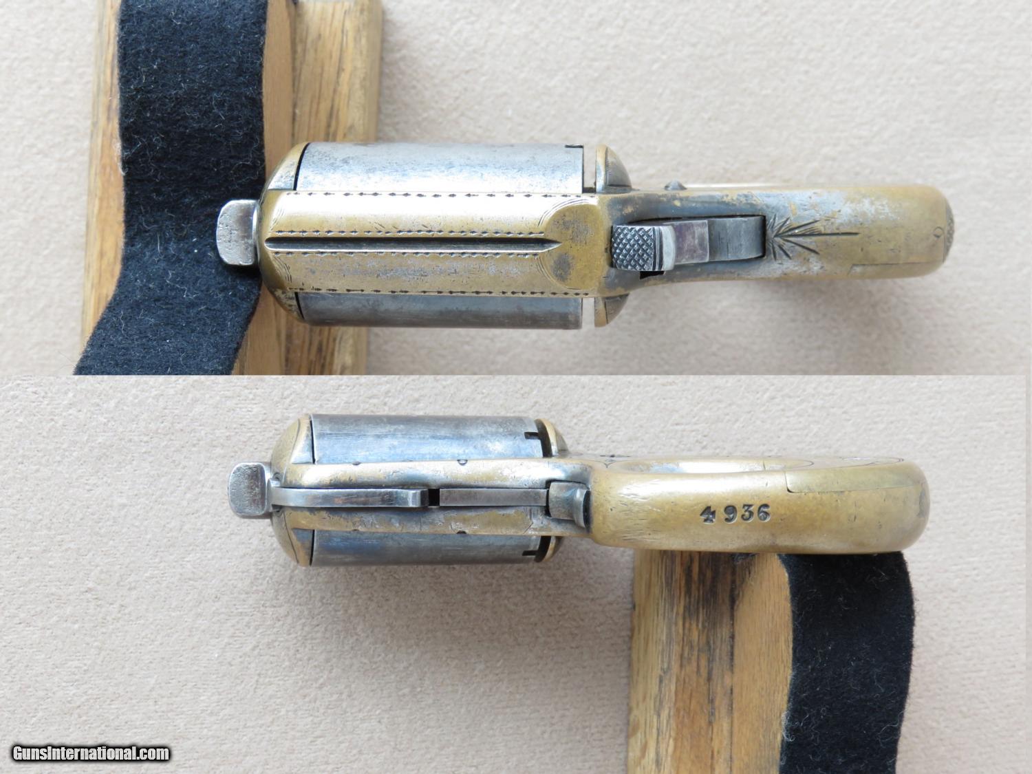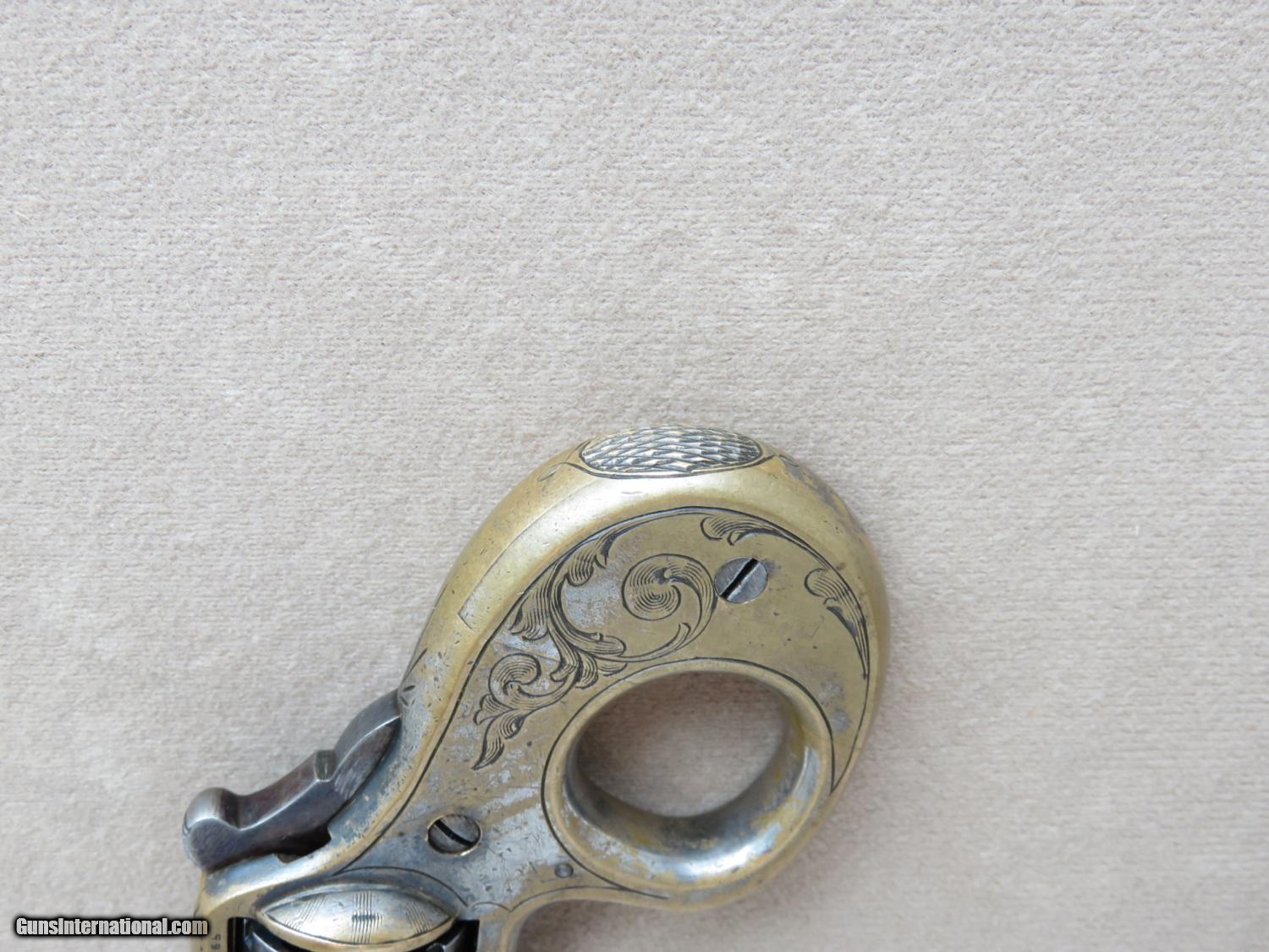 Description: Unique looking 7-shot personal protection derringer. It disassembles/assembles easily, and is fully functional, even the manual safety works. The gun is nicely engraved and it stands out sharply, even though the frame has lost most all of its original sliver finish, check out the checkered back-strap. The cylinder/barrel retains about 40% of its original blue fiinsh. It is all numbers matching. If all else fails, it turns into a brass knuckle. A very nice example of its type. PRICE: $1.050 2% discount for cash or check payment. We are Antique & Modern Firearms in Lexington, KY, dealer of fine firearms since 1974. PH. 859-276-1419 We Buy, Sell and Trade. SOLD Antique: Yes |
