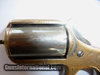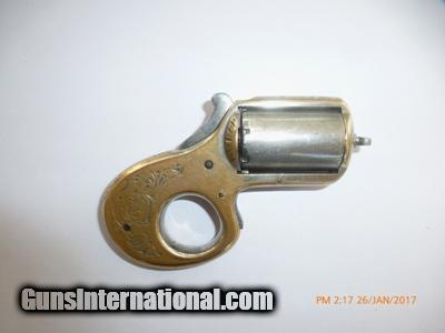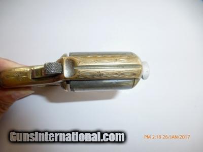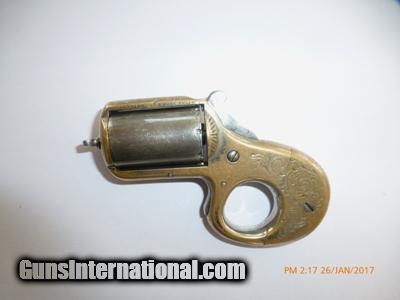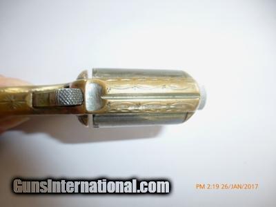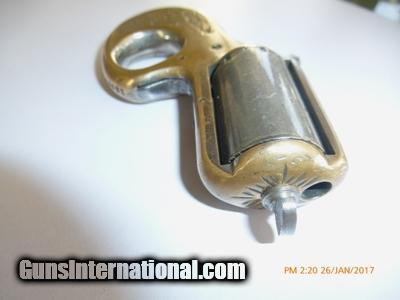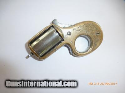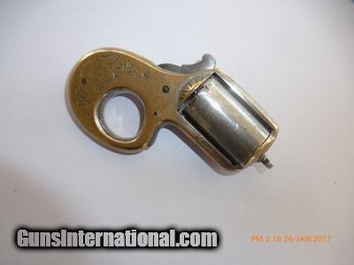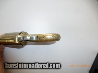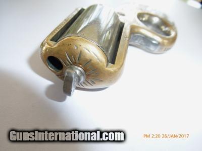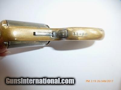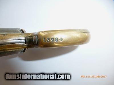 Description: Reid Knuckle-Duster Revolver 16-42 Reid Knuckle-Duster Revolver. Seven shot 22 rimfire caliber revolver; left side of frame marked MY FRIEND PATD. DEC. 26, 1865 over cylinder, made from 1868 to 1882.brass frame with engraving. Very distinctive American oddity, with frame being capable of being used as knuckles in a fight. This gun is in fine condition no corrosion steel cylinder, 25-30% nickel finish on frame, factory engraved. Serial number # 13284. Works fine, Hammer cocks and fires and cylinder turns. Fine, cool, old rare oddity. (16-42) $1,250.00 I take Visa/MasterCard, add 3%. Allow two weeks for all checks, whether bank, personal or certified to clear. It is also possible to wire funds to my account for instant credit for a $20.00 wire charge. 3 day- no questions asked return period for refund of price paid for gun. (Not including shipping or credit card charges.)Call or email with any questions or for more pictures. Guns are antique and should not be fired without examination by gunsmith. $50 shipping for long guns, $30 for hand guns to lower 48 states, about $50-$75 to most European countries and $70-$80 to Australia for antique handguns, carbines $75-$125. We can generally get insurance if you want through shipper but coverage is limited. Notify me if you want it. You can send 20% down- balance in 90 days for installment payment plan. No refunds on installment plans. I have shipped to Norway (long gun w/fragile stock) see feedback, England (Winchester1876, Rem. Dbl. Derr.), Northern Ireland, France, Australia and Sweden. Email if you are not U.S. for estimated shipping costs, payment methods, etc. I am always buying and trading for antique and collectible guns, Indian items, rare ammo, etc. Email what you have got for sale or trade. SOLD Antique: Yes Serial Number: 13284 |