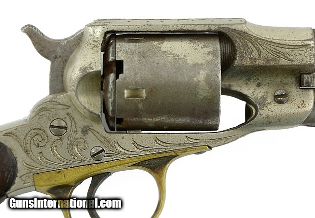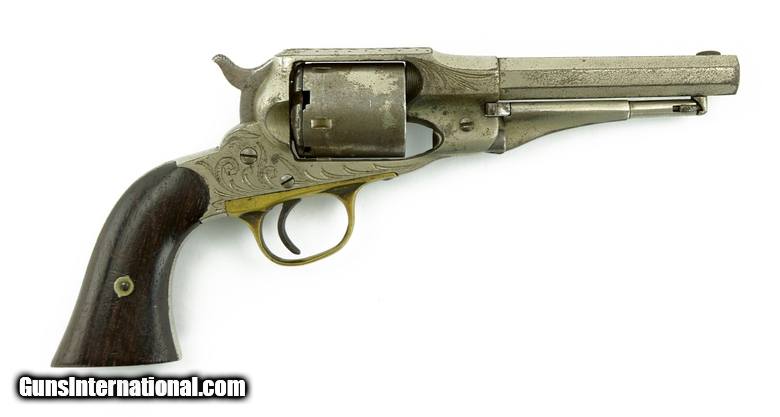 Factory Engraved Remington New Model Police Conversion. Very fine original nickel finish on the frame and barrel rating approximately 85%. Cylinder has nickel flaking and only rates at 20% or so. Grips are very good.