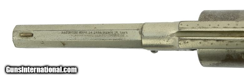 Description: Factory Engraved Remington New Model Police Conversion. Very fine original nickel finish on the frame and barrel rating approximately 85%. Cylinder has nickel flaking and only rates at 20% or so. Grips are very good. SOLD Antique: Yes |