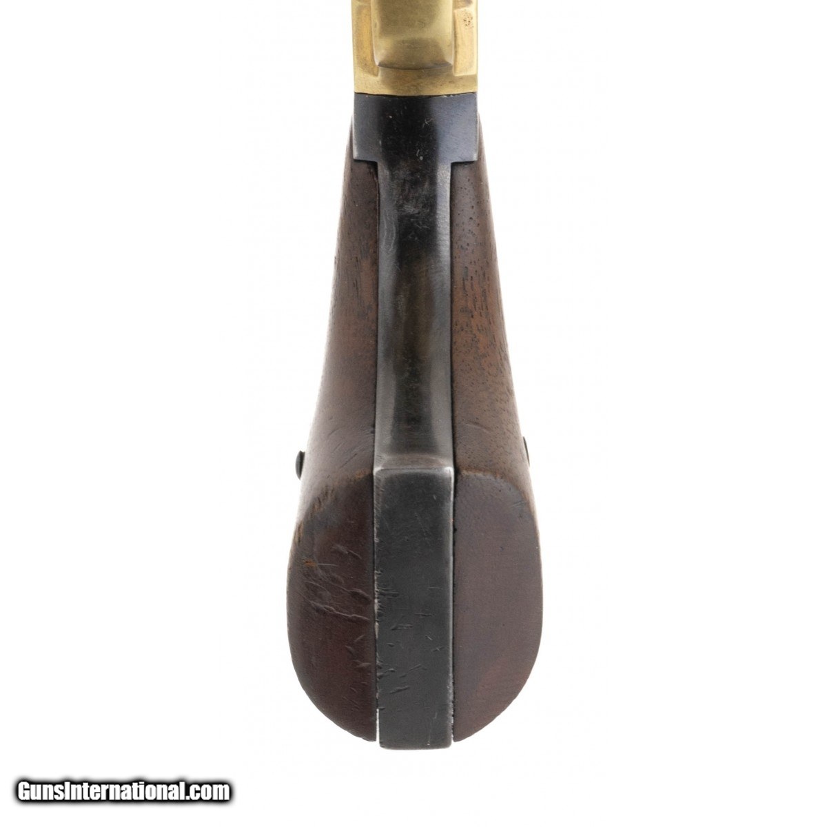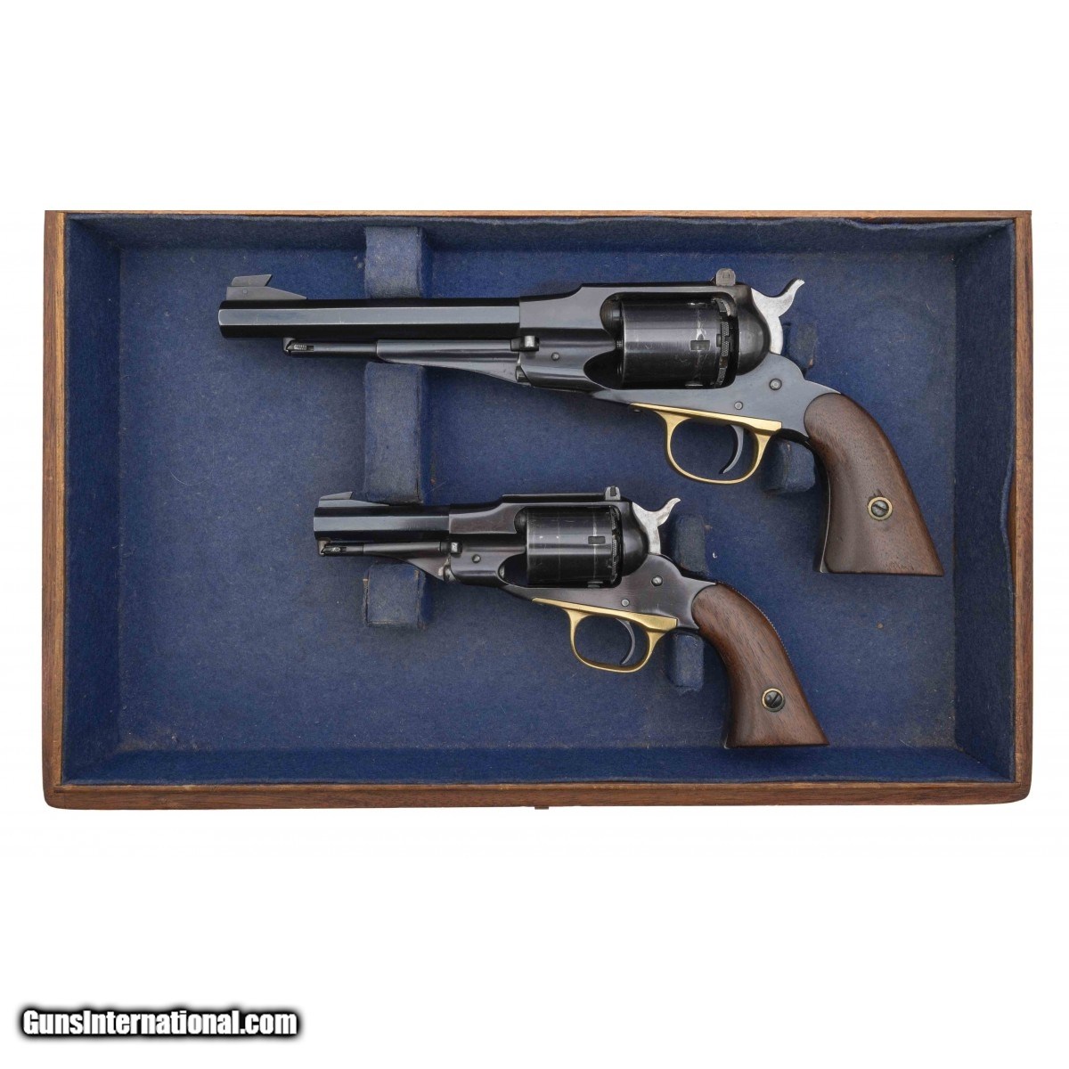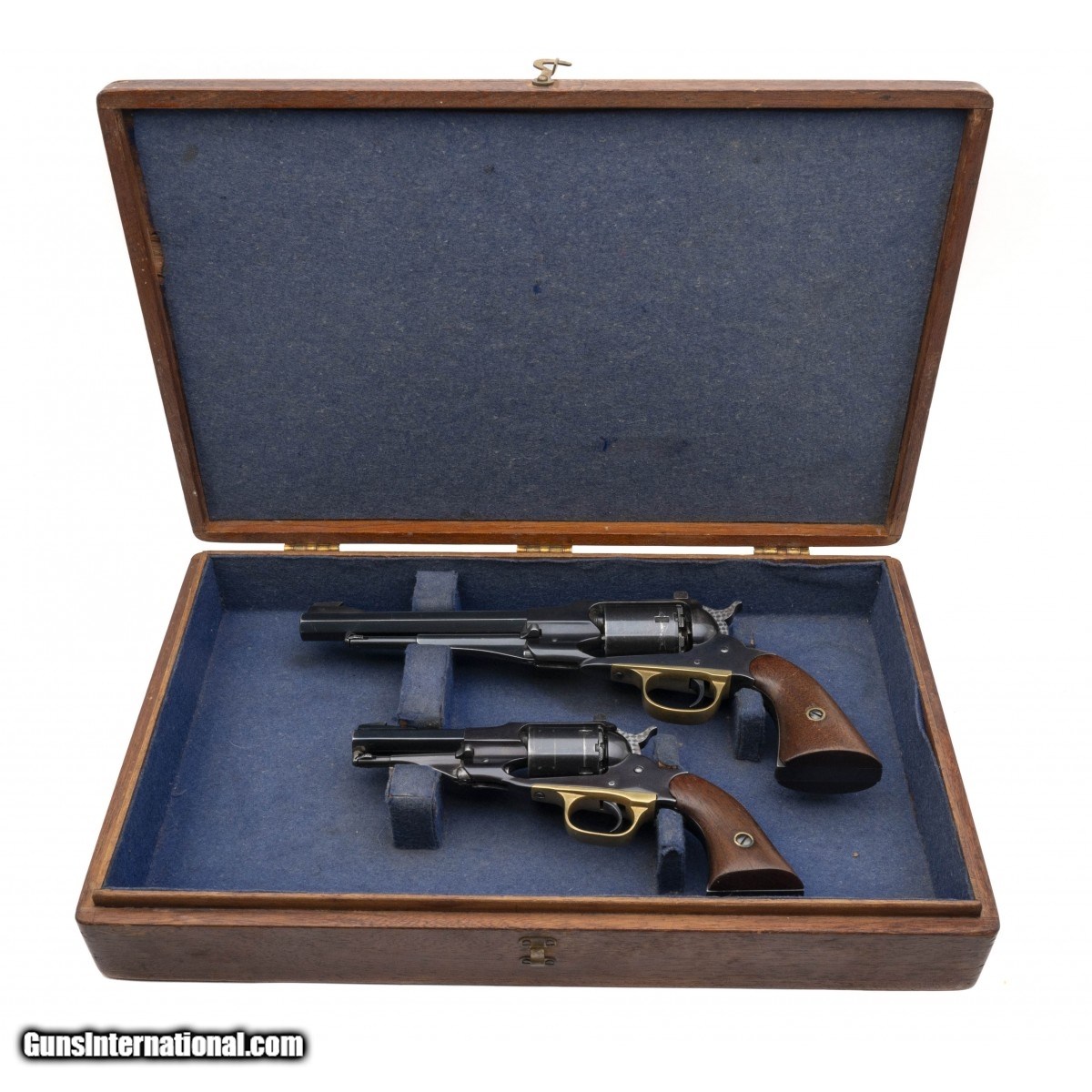Description: " A neat pair of antique percussion revolvers, an 1858 New Model Navy and a New Model Police. Both guns have been converted to .22LR, with target sights, jeweled hammers and checkered grip frames, then reblued. The guns come cased in a custom wooden presentation case. A great looking set, in excellent condition. SOLD Antique: Yes |
