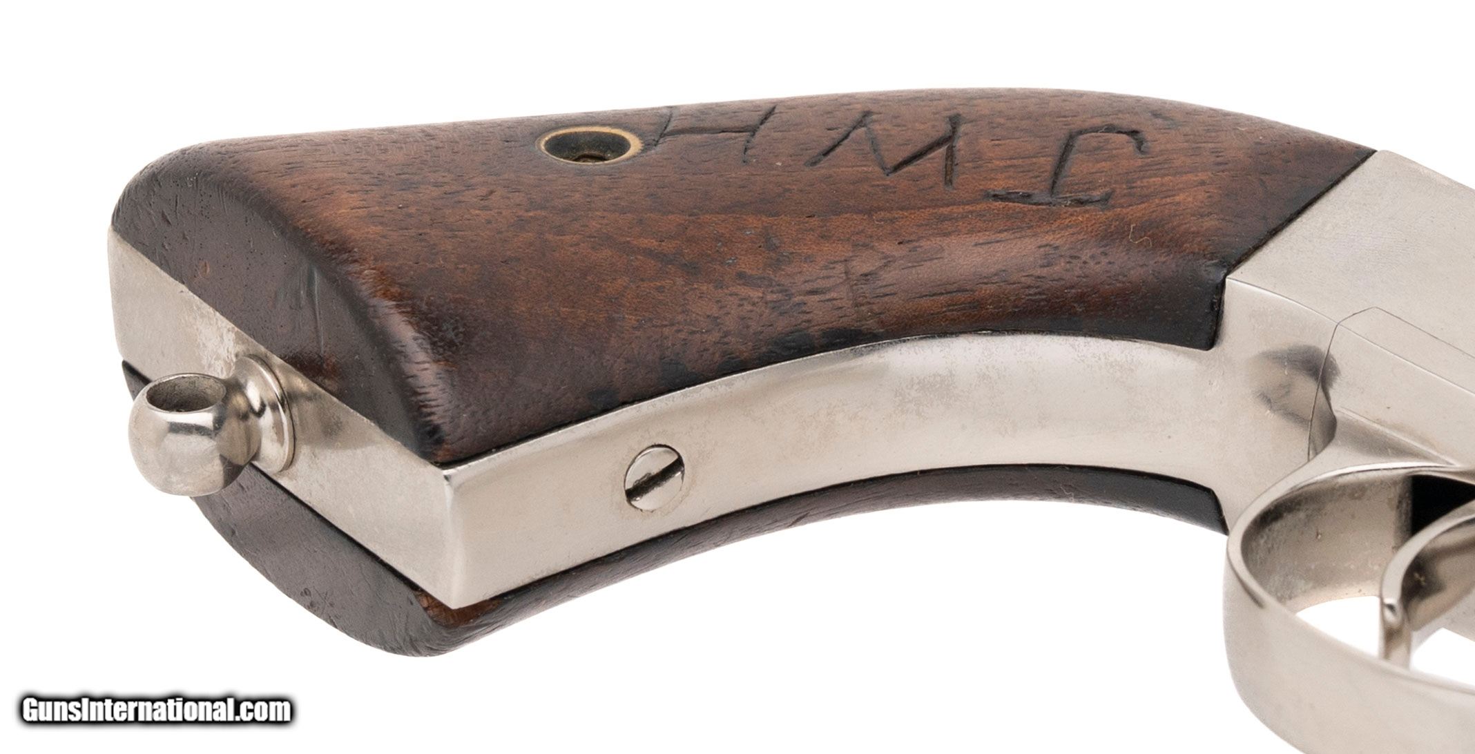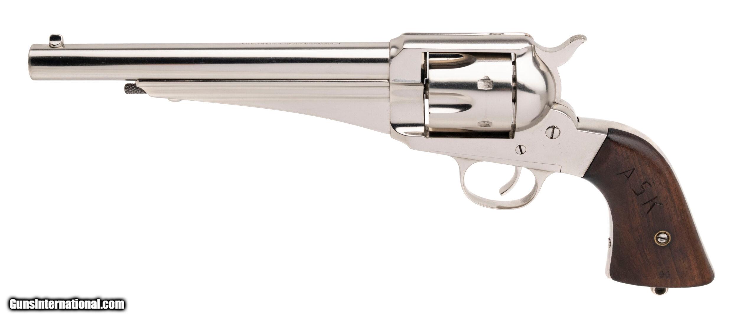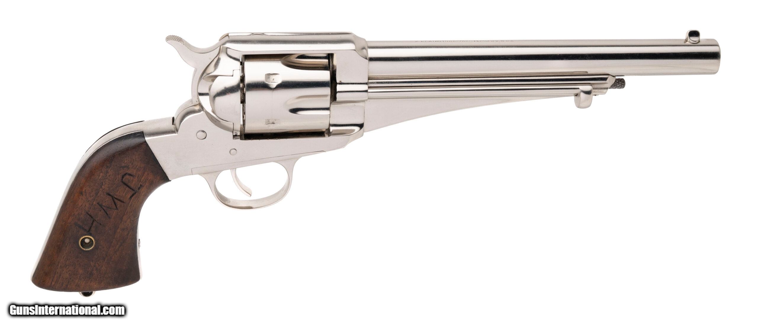 Description: "Serial number 226. 44 Remington caliber with a 7.5" barrel. This gun is in excellent condition as refinished. The grips are very good. Initials are carved in both sides of the grips. The action works properly. Very attractive example of a Remington 1875. SOLD Antique: Yes |