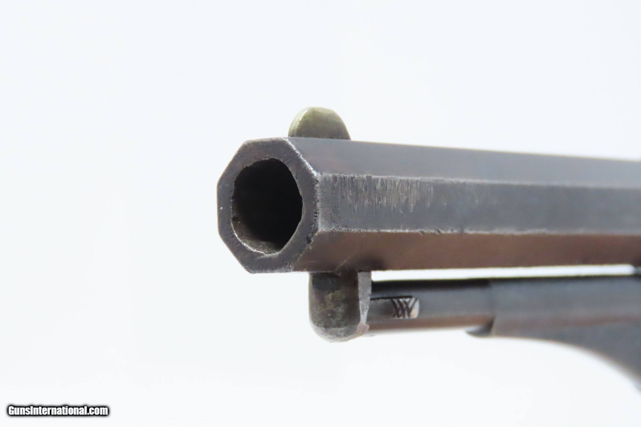 Description: 1870s Antique REMINGTON “New Model” POLICE .36 Caliber PERCUSSION Revolver UNCONVERTED Percussion Five Shot Revolver! Here we present an antique Remington New Model Police Revolver in .36 Caliber, made circa 1870 in Ilion, New York, with a production run between 1865 to 1873. This nice example was manufactured by Remington & Sons in the late 1860s to early 1870s with an estimated total of 18,000 manufactured. These revolvers were scaled down versions of the Remington Belt and Navy Models. Most of the New Model Police Revolvers were either manufactured to chamber metallic cartridges or factory altered for cartridges. Original percussion New Model Police like this example is very scarce. The top of the barrel is roll-stamped “PATENTED SEPT. 14, 1858/REMINGTON & SONS, ILION NEW YOUR U.S.A./NEW MODEL” in three lines. The overall condition is very good. Strong action. Original finish/patina. The bore is in nice shape for its age and features strong rifling. Both grips are in good shape with nicer grain structure. Sharp markings. The left side of the frame is cracked around the loading lever—it is interesting to ponder just how this might have happened. The loading lever remains functional despite the flaw. Own the original! This is a legitimate antique and not a reproduction. Barrel is 4-1/2 inches. Caliber: .36 Percussion Overall condition as seen in photos. Very Fast. Very Safe. FREE SHIPPING WORLDWIDE. Delivered directly to your door by express mail! Guaranteed AUTHENTIC & Includes CERTIFICATE OF AUTHENTICITY. ancestryguns $1885 #217445 SOLD Antique: Yes |