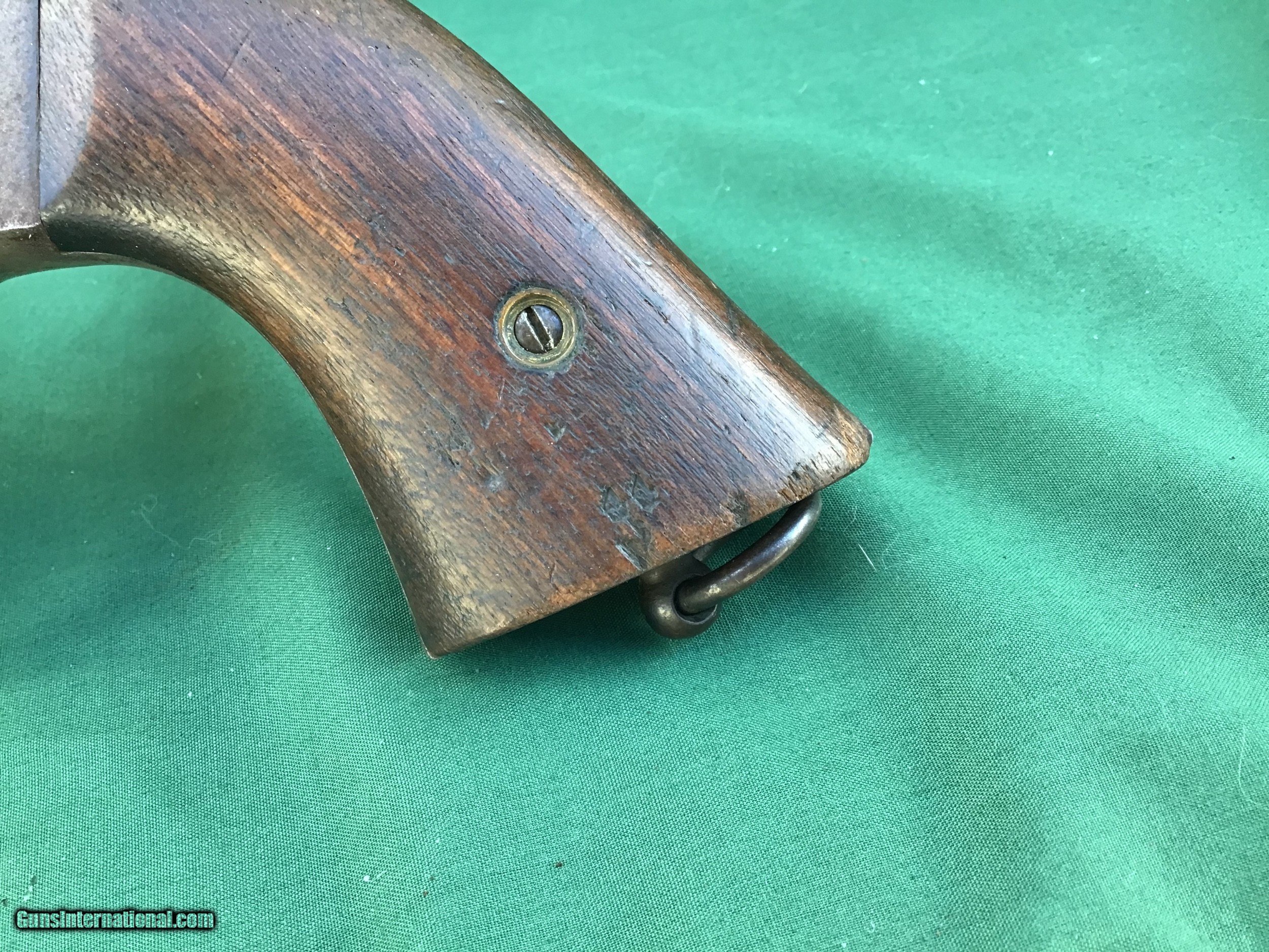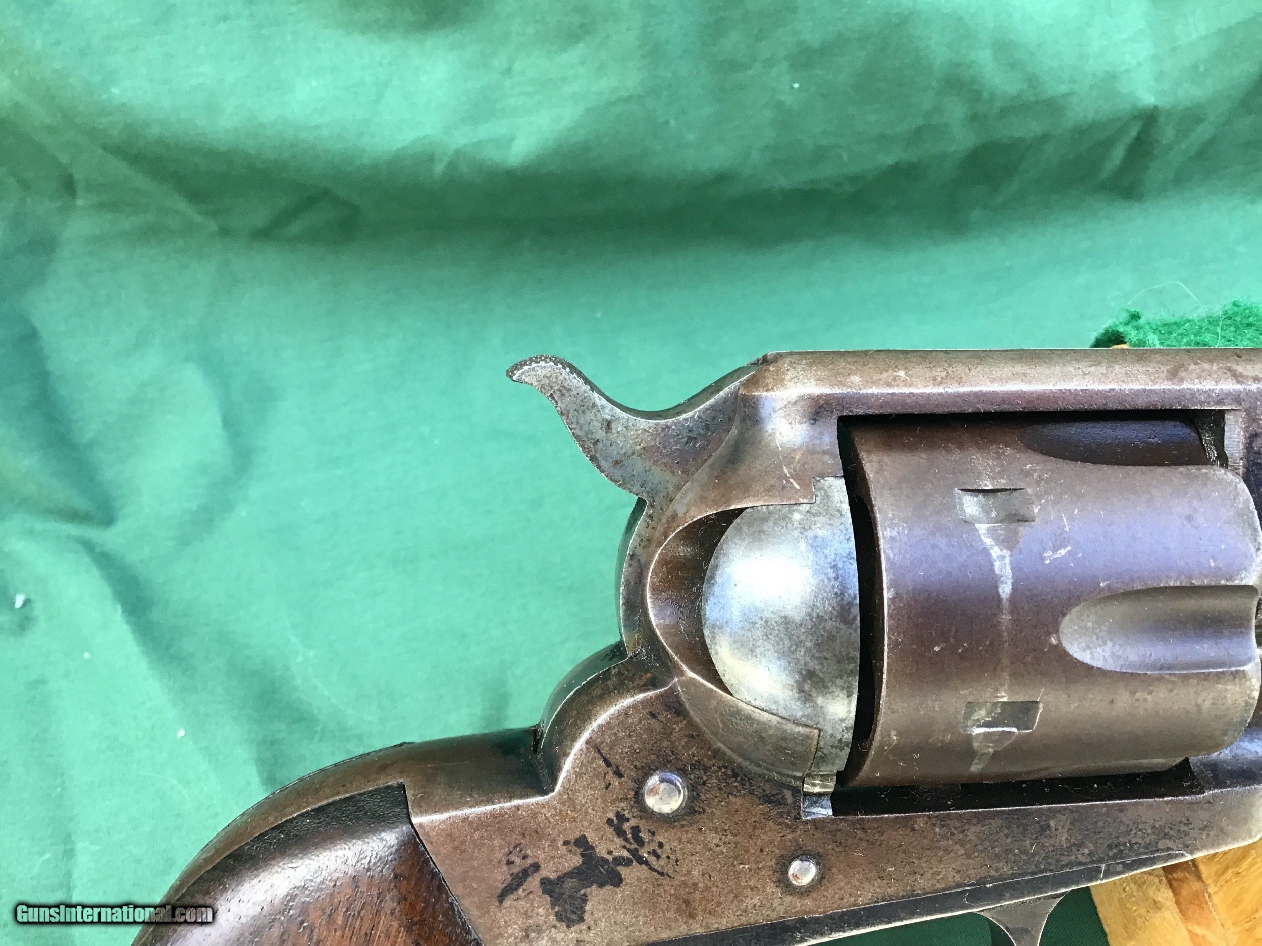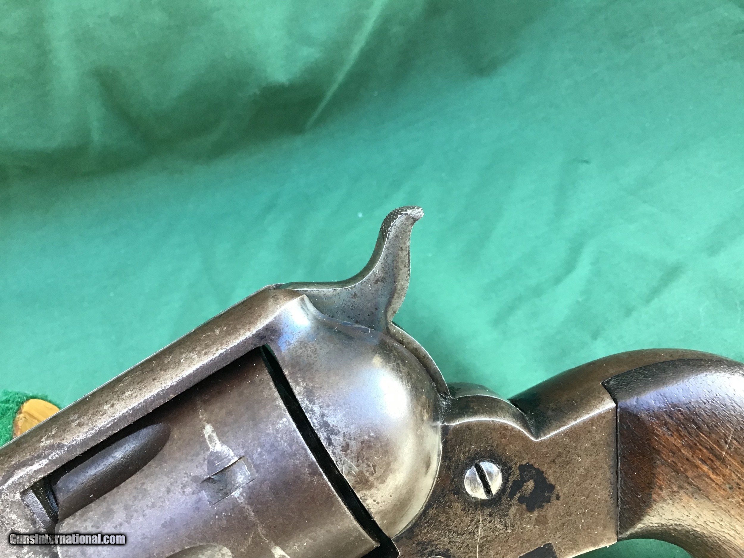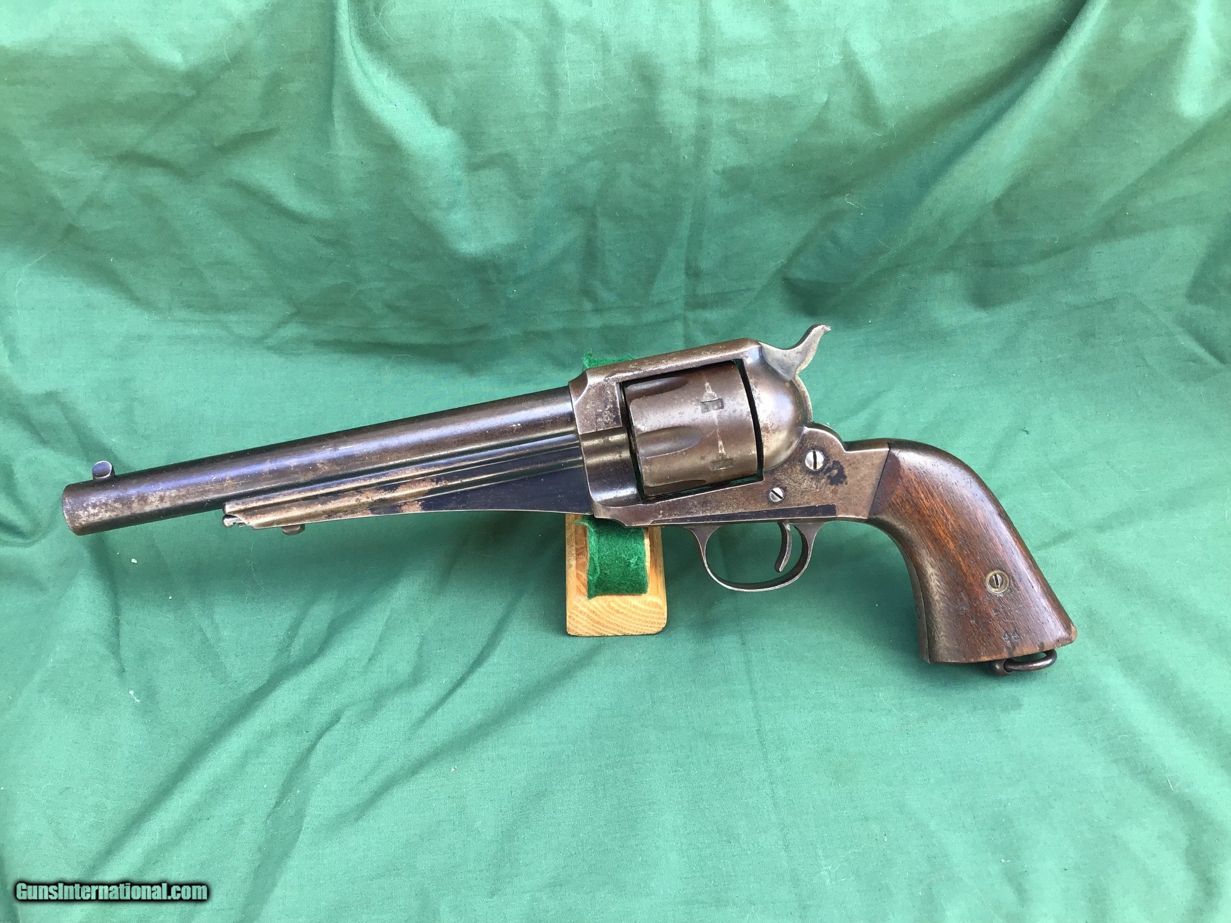 Description: Rare blued 1875 Remington Revolver. Great bore, 44 Remington. Left grip is marked 44. The revolver is marked with batch number / serial number 38 on grip frame and both grips (in pencil). 7 1/2" barrel retains 75 to 80% original blue. Very nice barrel address marking. This revolver indexes very nicely. Some nice case colors showing on hammer. Over 90% of these 1875 Remington's were nickel plated. Very rare to see a blued one in this kind of condition. Antique, but please know your state laws. Sold as a Collectors Item only. Please feel free to ask questions. SOLD Antique: Yes |