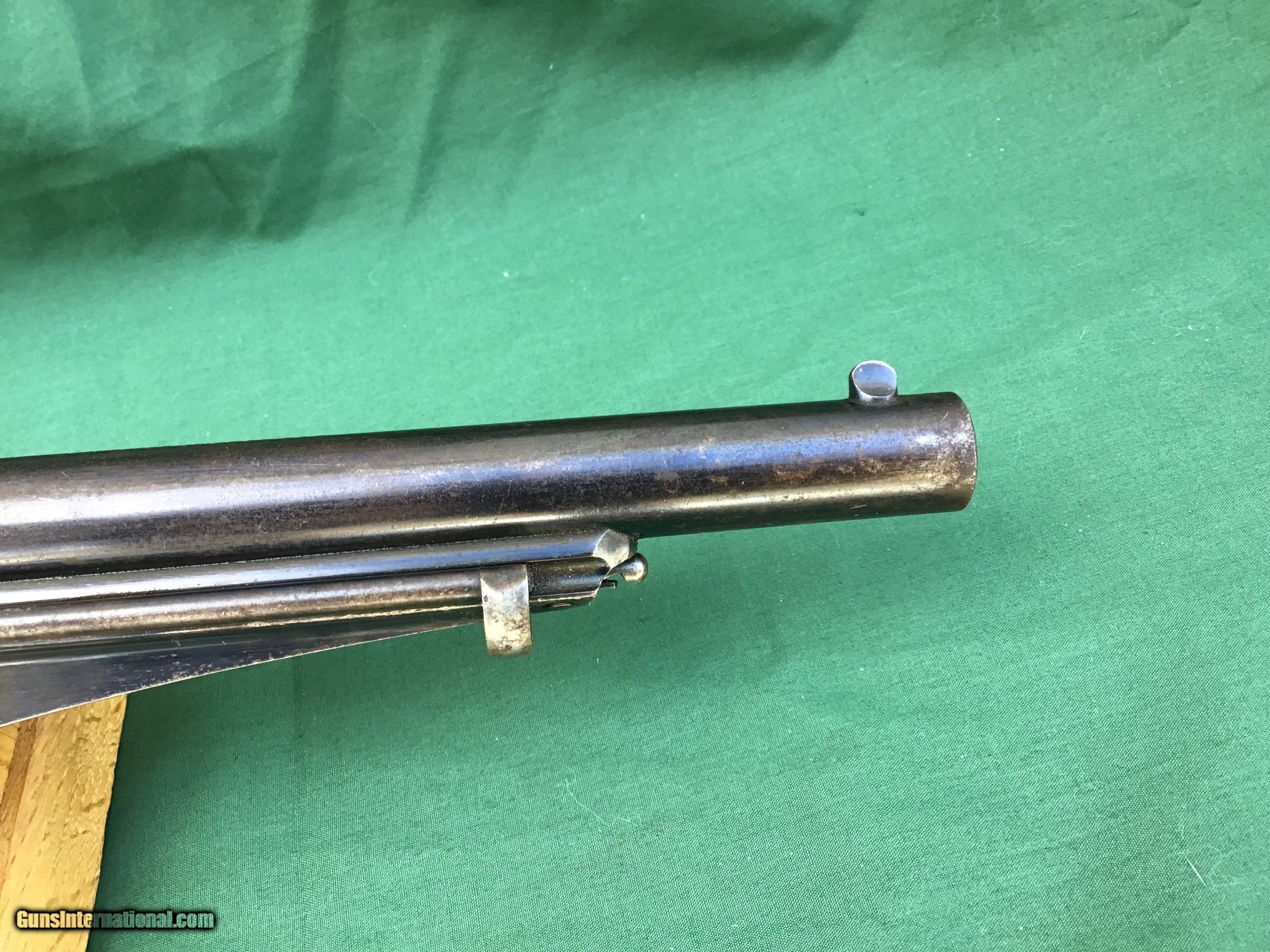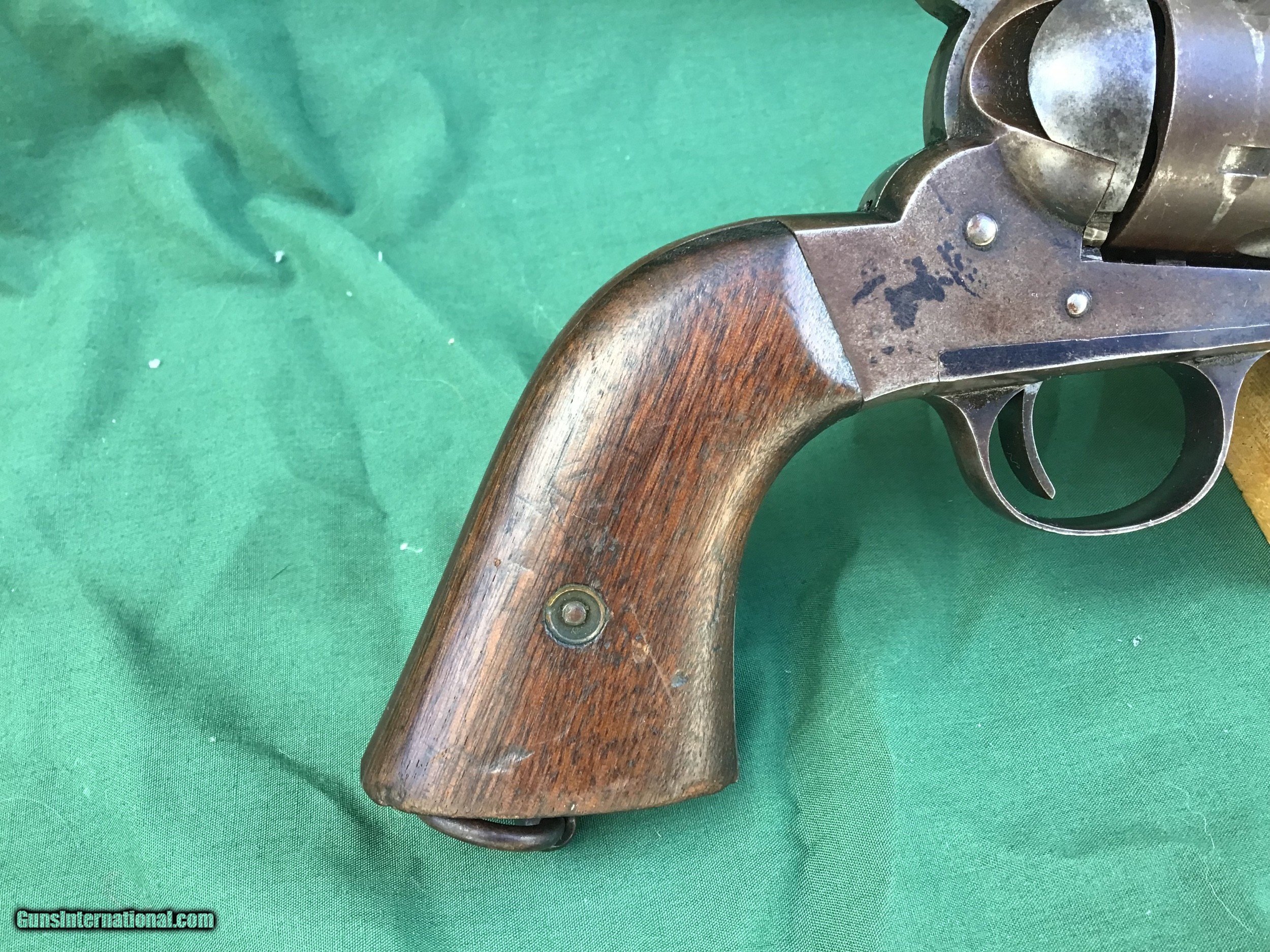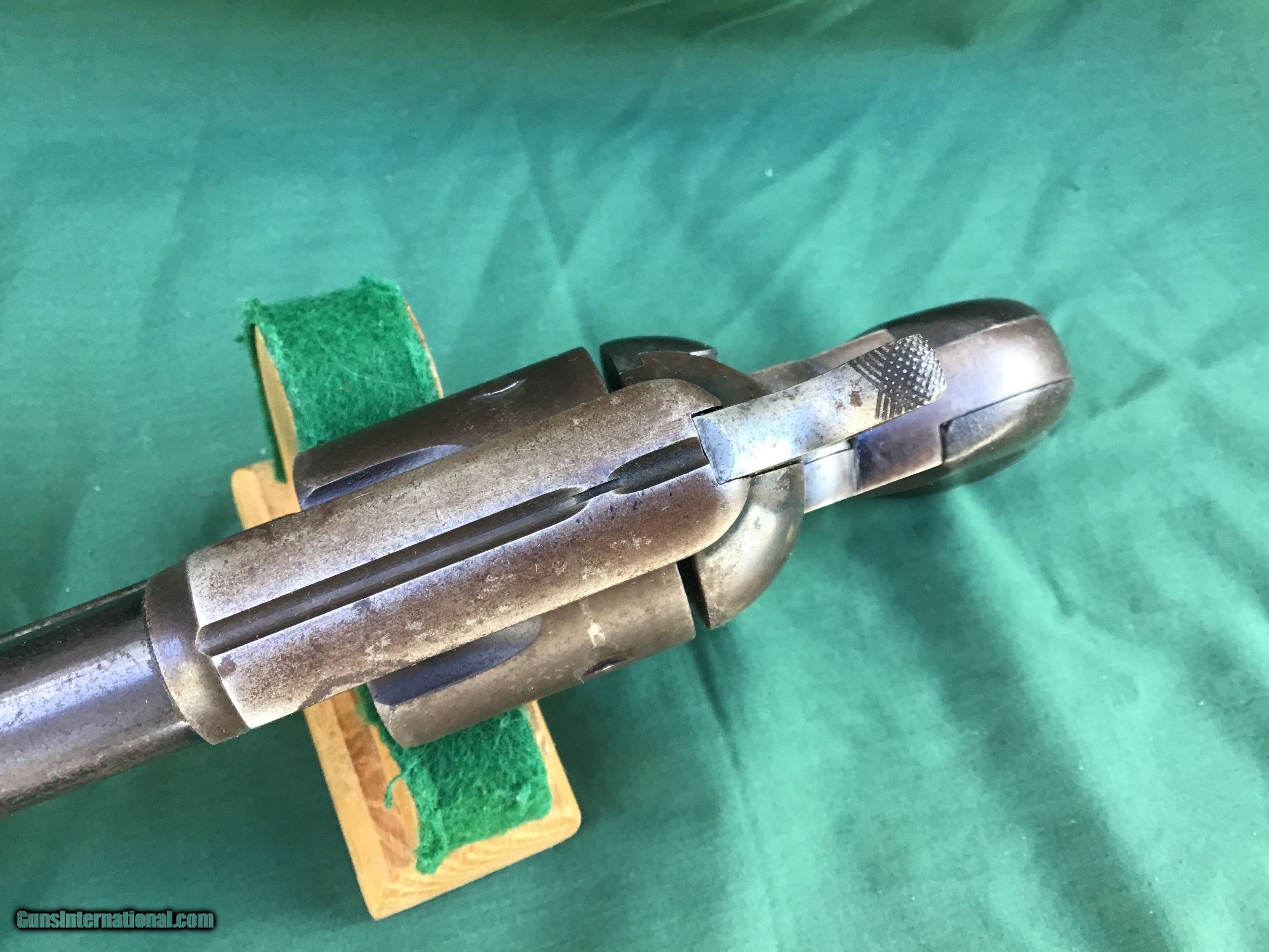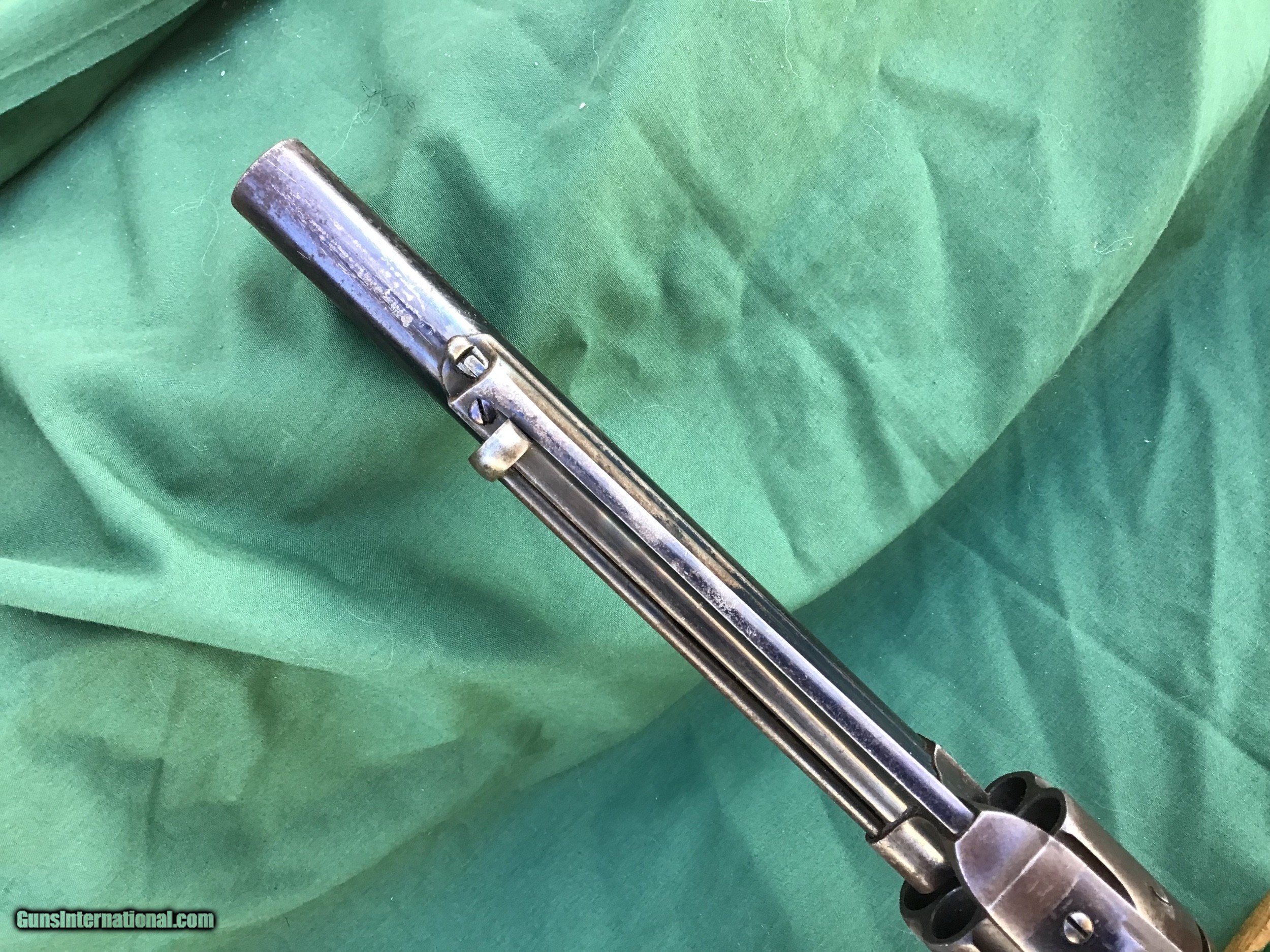 Description: Rare blued 1875 Remington Revolver. Great bore, 44 Remington. Left grip is marked 44. The revolver is marked with batch number / serial number 38 on grip frame and both grips (in pencil). 7 1/2" barrel retains 75 to 80% original blue. Very nice barrel address marking. This revolver indexes very nicely. Some nice case colors showing on hammer. Over 90% of these 1875 Remington's were nickel plated. Very rare to see a blued one in this kind of condition. Antique, but please know your state laws. Sold as a Collectors Item only. Please feel free to ask questions. SOLD Antique: Yes |