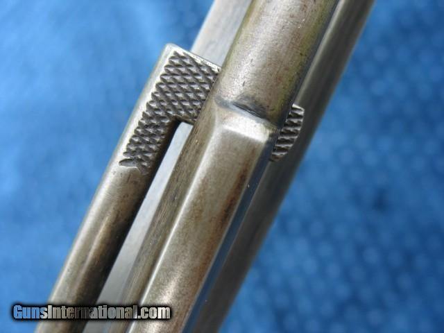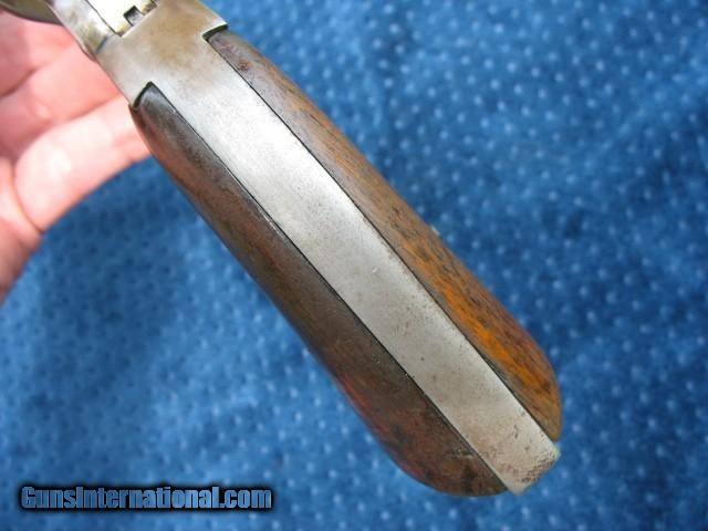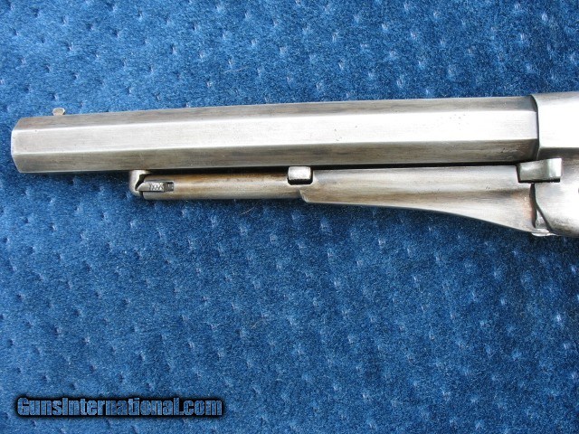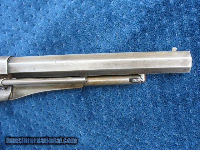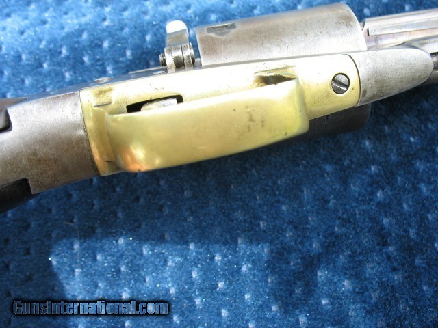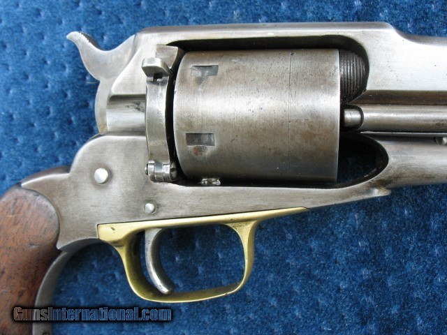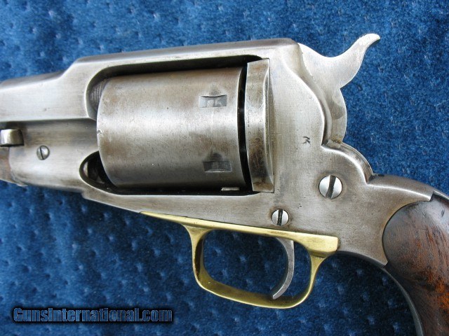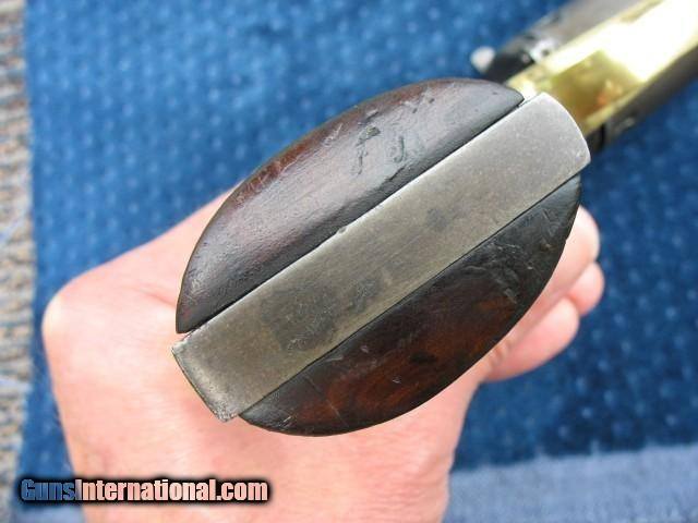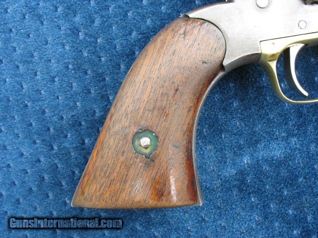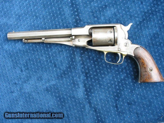 Description: SOLD. Antique Remington Navy Factory conversion to .38 Long Colt Center Fire. Here is a nice and crisp Remington Navy factory conversion to .38 Long Colt center fire. Has the standard 7 3/8” barrel. These Navy conversions are the very high quality conversions made with the loading gate and ejector housing and rod. Unlike many of the most common found Army conversions that range from good quality to very poor “gun smith” or “ black smith” conversions.. Very few of these high quality Navy conversions are found for sale as a very limited number of them were manufactured. My conversion book by the late Bruce McDowell says less than 1,000.. Even though this gun has no finish it is an extremely crisp and tight example. The mechanics are excellent.. Crisp and tight as a new gun.. NO cylinder movement at all at lock up or with the hammer down in the fired position. It indexes perfectly with a positive half cock position for loading and unloading. Very crisp and as new action.. The bore is minty bright and shiny.. No rings or bulges. The chambers are mint bright and shiny also. The loading gate is all intact and functions perfectly. The ejector rod is factory and intact and functions perfectly also. Nothing has been broken and homemade as is often found. The metal over all has been cleaned and is a soft gray with no pitting.. The front sight has been narrowed a bit for a better sighting picture. It is very precise when sighting down the barrel and sights better than the wider front sights do by far.. It is still the original front sight. Of course these sights are threaded in the barrel so if you desire to change it would be an easy job. The grips are in very good condition with some original varnish still remaining.. No cracks but one tiny chip on the upper right side at the frame.. Shows some edge and corner wear but very nice grips. The screw heads are sharp and crisp and not burred up from tinkering. The barrel address is weak from wear and cleaning but these addresses on these Remington's are most always found weak from a tipped die stamp so nothing out of the ordinary. These factory Navy conversions are quite rare and I have had but 4 or 5 for sale in well over 30 years of collecting and dealing. These are very high quality as I mentioned and leaps and bounds above the quality of most of the Army conversion models commonly found on the market today.. Call 765-728-8049 with any questions or more photos. $35 insured USPS shipping. SOLD Antique: Yes |