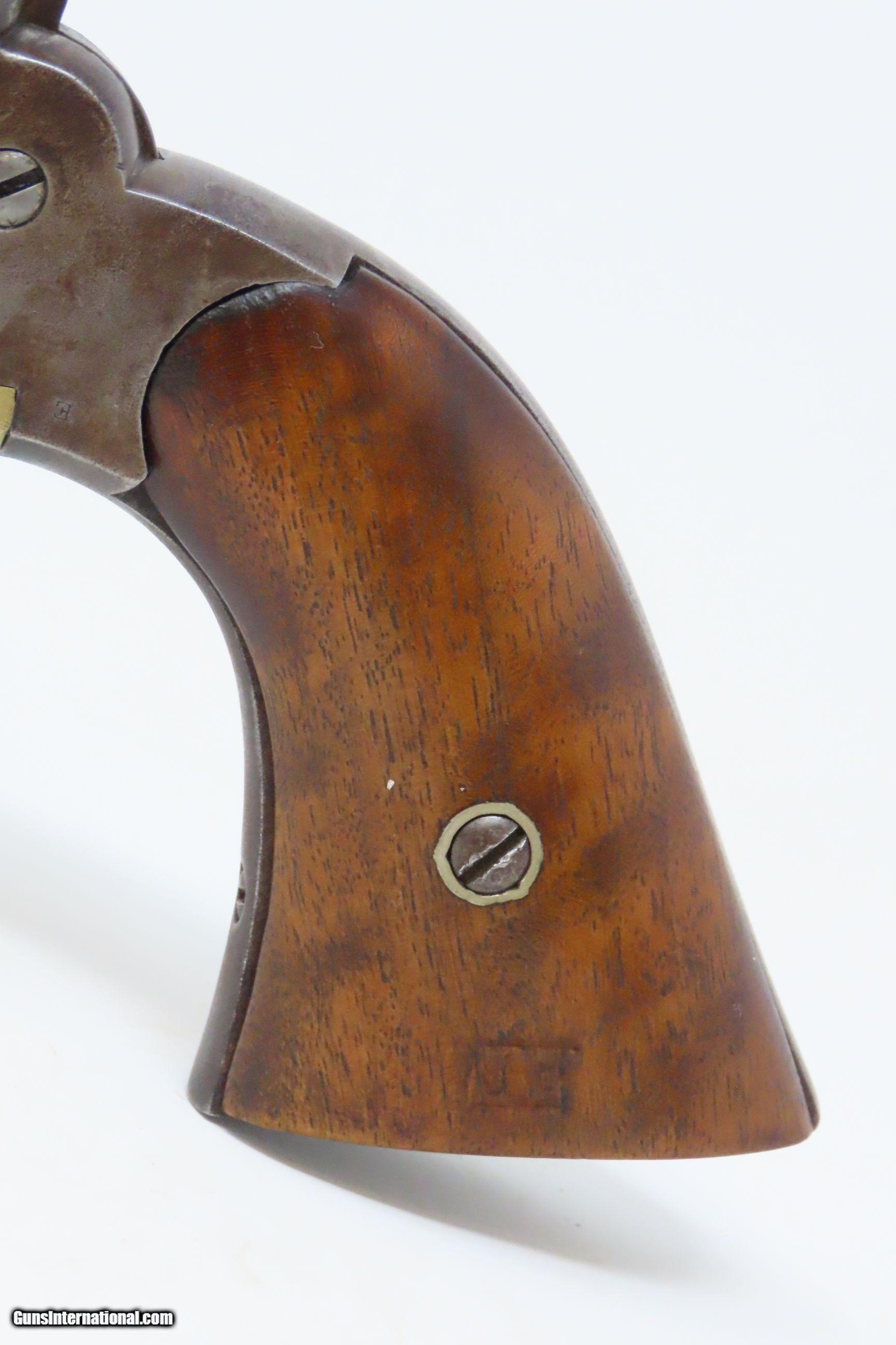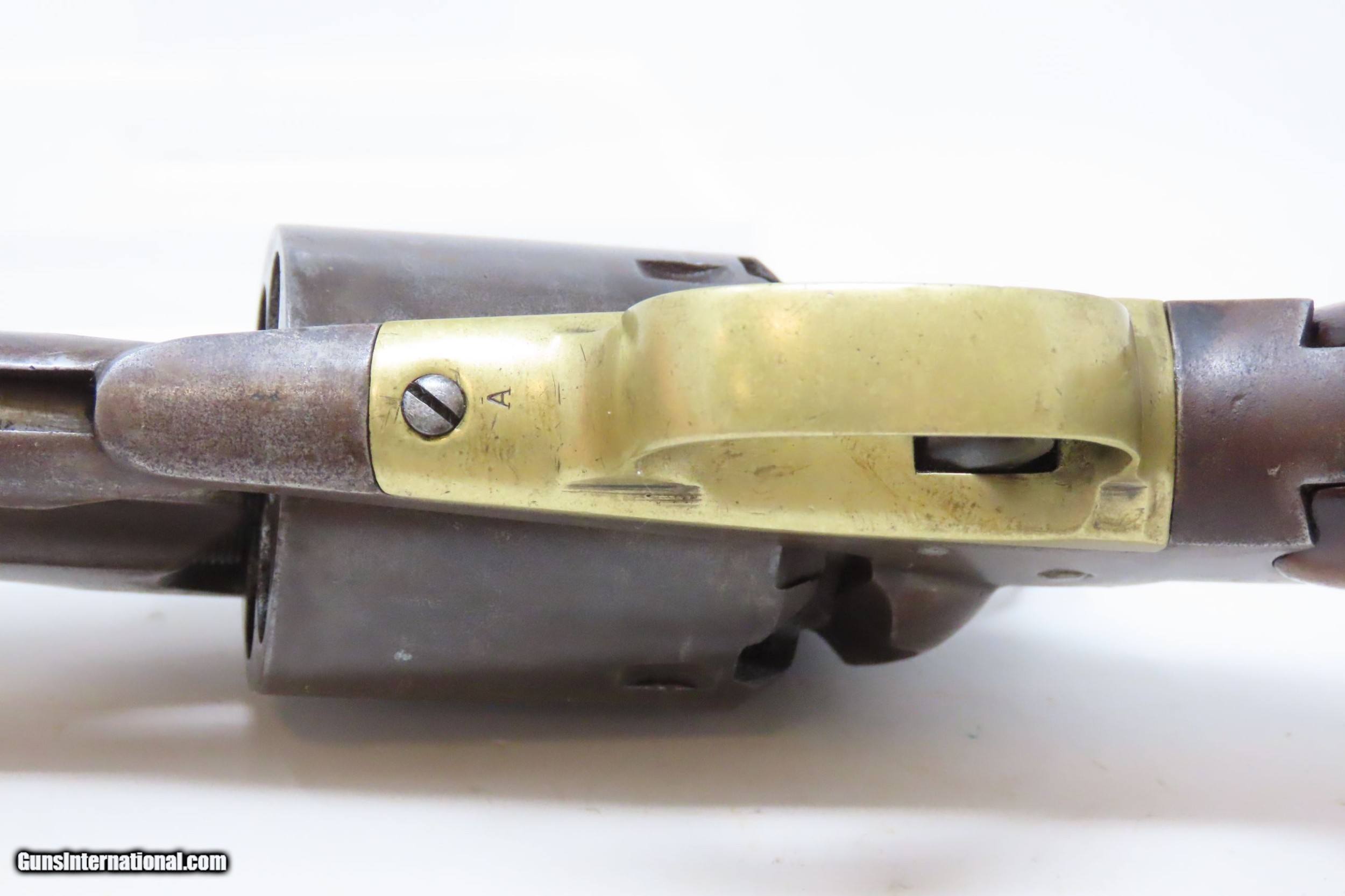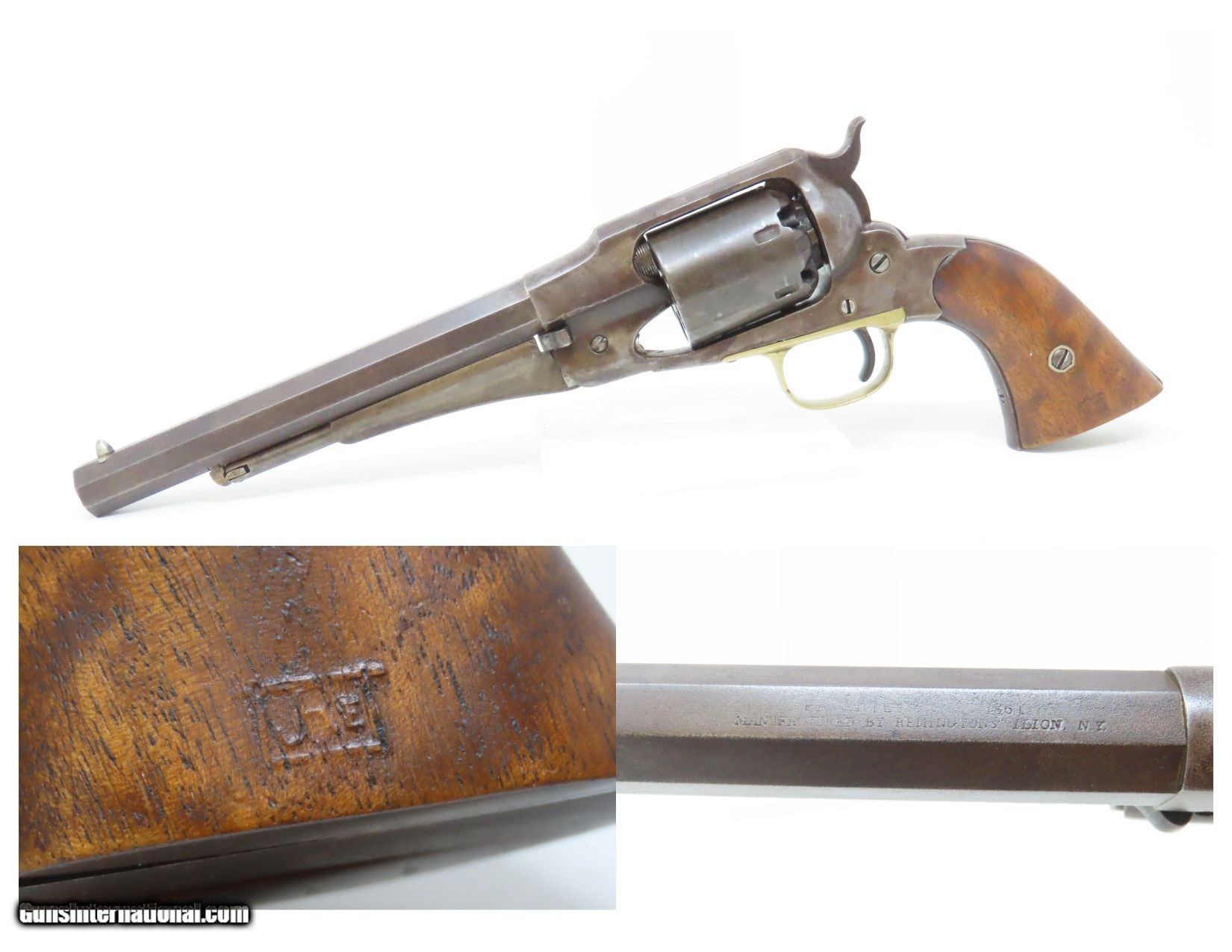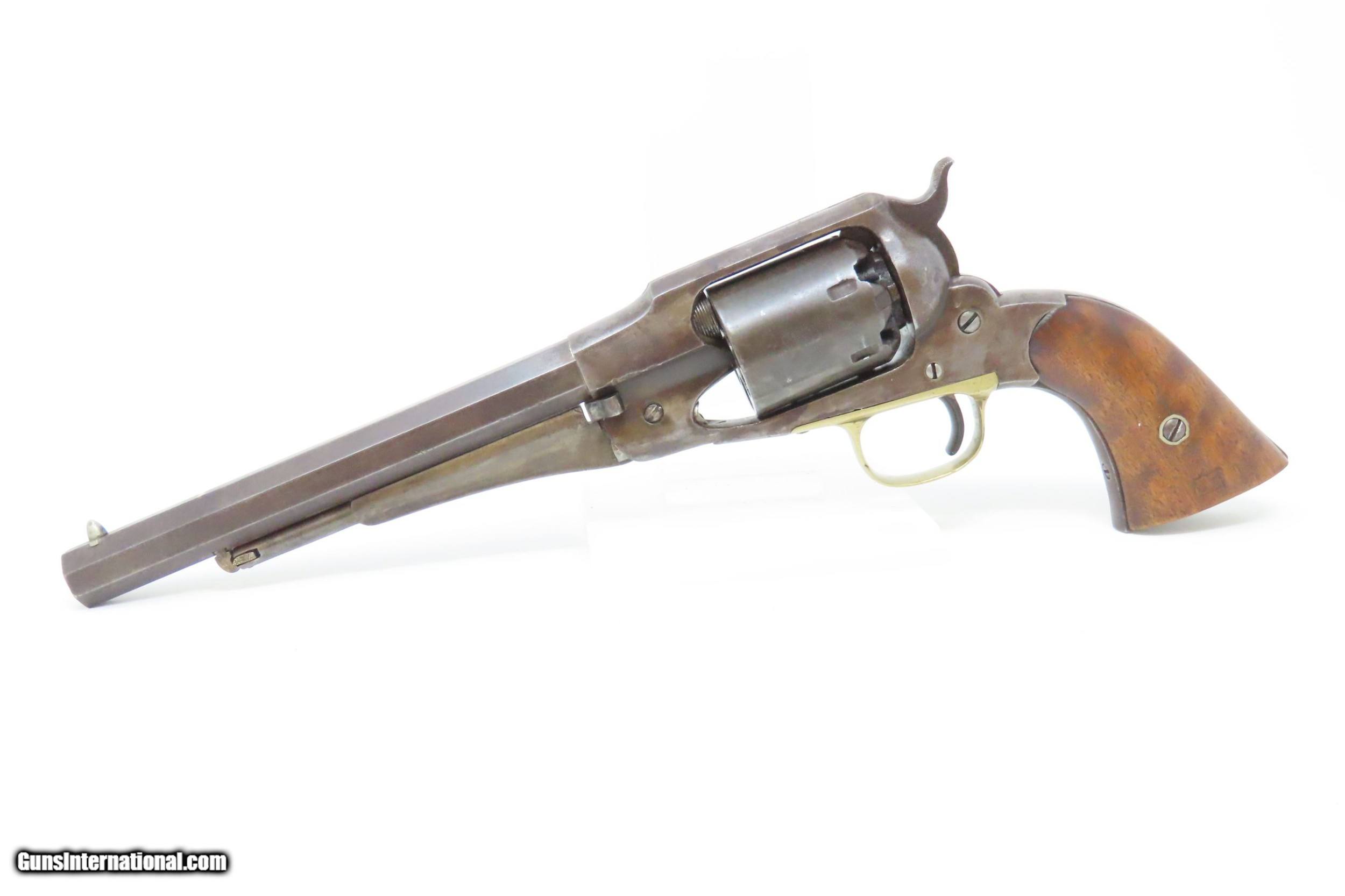 Description: CIVIL WAR Antique US MILITARY Contract Percussion REMINGTON New Model ARMY Made and Shipped Circa 1863-65! Here we present an antique U.S. Remington New Model Army Percussion Revolver, likely issued to a Union soldier circa 1863-65, during the American Civil War. The New Model Army was manufactured from 1863 to 1875 with a total production of approximately 132,000 and represented the last of Remington's .44 caliber percussion revolvers. The Remington New Model Army represents the second-greatest number of issued handguns found on Civil War battlefields, second only to the Colt 1860 Army. The New Model Army was the primary revolver issued to Union cavalry after the fire at the Colt's factory in 1863. The Union government acquired a total of some 122,000 of these New Model revolvers for military use, with nearly 110,000 New Models purchased by the U.S. government during the Civil War, at a cost of around $11 each. The State of New Jersey also purchased several thousand for Civil War issue. The New Model 1863 Army represents Remington’s highest production martial pistol. It featured a strong, solid-frame design with the groove in the top for a rear sight, as opposed to Colt’s open-top design. Though Colt got the lion’s share of the government contracts, many consider the Remington New Model Army the superior firearm. William F. "Buffalo Bill" Cody used an ivory-handled New Model Army .44, serial number 73,293, from 1863 until 1906, when he gave it to his ranch foreman with a handwritten note which said that, "It never failed me”. The overall condition is good. Mostly darker patina throughout. There is what appears to be a shallow ding across the top barrel flat that was brazed to fill it. The action is strong. The bore is in good condition for age with good rifling. The numbers match on the trigger guard and grip frame and barrel. Inspection markings. The grips are a bit shy and the left grip has what appears to be a brand (as in a ranch) which appears to be a “Boxed JRE”. Own the original! This is a legitimate antique and not a reproduction. Barrel is 8 inches. Caliber: .44 Percussion Overall condition as seen in photos. Very Fast. Very Safe. FREE SHIPPING WORLDWIDE. Delivered directly to your door by express mail! Guaranteed AUTHENTIC & Includes CERTIFICATE OF AUTHENTICITY. ancestryguns $2000 #217979 SOLD Antique: Yes |