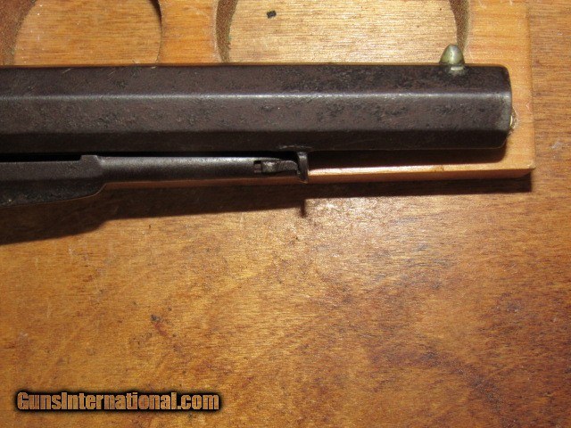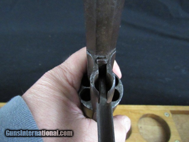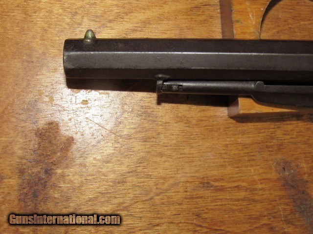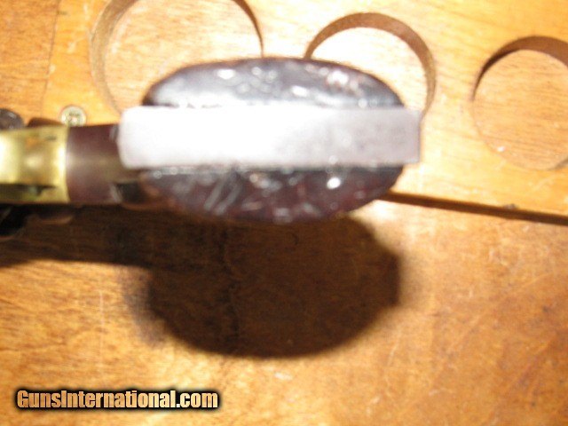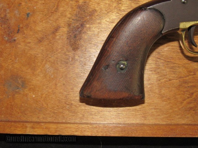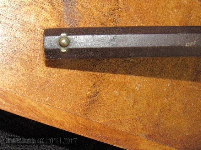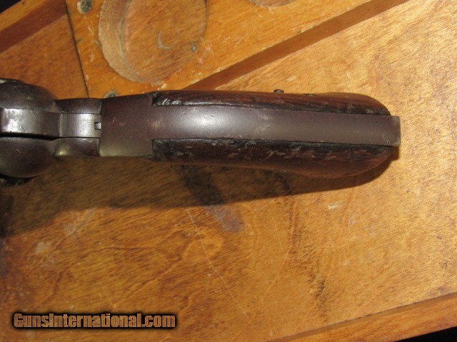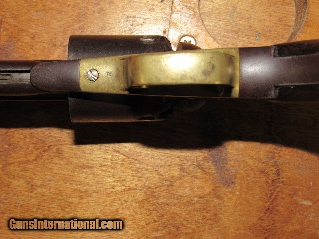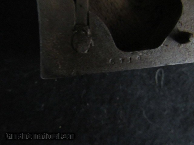 Description: This is a Remington transitional model Army revolver, serial number 6719, made Dec. 1862 and, although not a direct hit, falls into the range of some revolvers issued to the 4th Wisconsin Cavalry. 6-shot, 44 caliber percussion, single action, 8" octagon barrel, blued and walnut finish with brass trigger guard. Serial number matches on the bottom of the barrel (although faint from wear), left side of frame under grip, and on the little tab of the trigger guard. Top of the barrel is marked in two lines "PATENTED DEC. 17 1861" and "MANUFACTURED BY REMINGTONS' ILION NY" which are still quite legible. Sub inspector marks include an R on the trigger guard in front of the trigger bow, J on the left side of frame behind recoil shield, PS on the left side of the barrel where it meets the frame and also on the left side of frame at breech. Traces of the inspector cartouche show on the left side of the grip but is not legible due to wear. CONDITION: All blued surfaces have turned a dark chocolate color. Brass trigger guard is a mellow ochre. Grips show wear and scuffing with small losses at front toes. Left grip has 3 worn kill marks near frame. Bore is very good with nice rifling but typical black powder pitting. Original cone front sight present. Action does not hold at half cock due to hammer notch wear but does hold at full cock and will fire. Cylinder has some wobble; all 6 original nipples are intact. Loading lever has side to side play. Cylinder pin is broken off just ahead of frame, but can be pulled out with pliers. Overall grades NRA Antique Good and is a representative transitional Remington Army Civil War revolver that no doubt saw action in the conflict. TERMS: No international sales. Antique so it can ship directly to you assuming your local laws allow it. Please be aware of what is legal in your state and complete your purchase within the law. 3 day non-firing inspection and sold as a collector item only. Not warranted safe to fire until checked out by a competent gunsmith. Buyer pays return shipping. Payment by bank check, personal check or money order. All major credit cards accepted with 4% convenience fee added. Shipping by UPS Ground with tracking. Always interested in used long guns and used antique handguns so please contact me if you have anything for sale or trade. 315.251.4799 with questions or concerns. FREE SHIPPING! I work a full time job during the day, so if I don't respond to an email or text right away, please understand that I have received it and will address it as soon as I can. If you like my price, "buy it now" to secure the item! Reasonable offers are welcomed and will be considered, but again, I may not be able to respond right away. Thank you for looking; God Bless; be safe. SOLD Antique: Yes Handgun Caliber: .44 Manufacturer: Remington Model: Army Serial Number: 6719 Barrel Length: 8" Octagon Condition: Good Metal Condition: Good Wood Condition: Good Bore Condition: Very Good Action: Single Action Revolver Triggers: Standard/plain Stock: Walnut Manufacture Date: 1862 Item Location: New York |