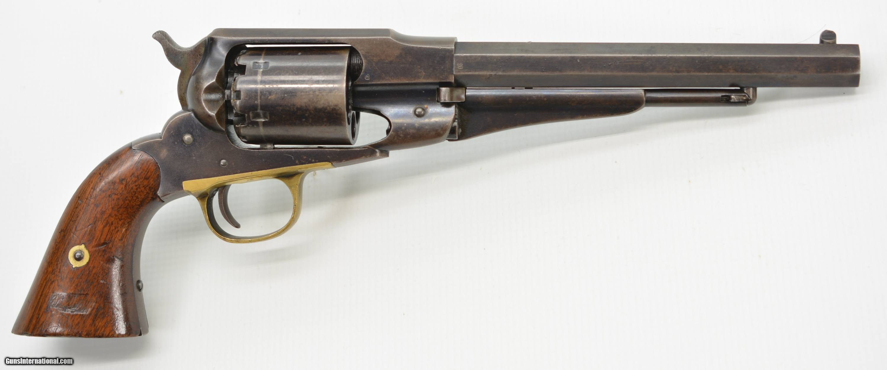 Description: Serial number on the barrel is 109390 and the serial number on the frame is 120995, .44 caliber, 8" inch octagon barrel with an excellent, bright bore. This revolver has about 75-80% of the original blue remaining with the balance turned to a smooth plum-brown patina that exhibits some fading and silvering along the exposed edges. The cylinder has a blue and plum-brown patina with a gray turn-ring, and some very mild pitting on the front face. The brass trigger guard has a fairly bright yellow-ochre patina and the walnut grips (which retain an added military oil finish) are in very good condition with scattered small handling marks and surface blemishes, heaviest on the butt of the right side panel, and small chip at the toe on the left. The government cartouche is still rather crisp on the left side, but is somewhat obscured by a large bruise on the right. The mechanism is tight and functions flawlessly. This is a great Civil War era revolver with quite a lot of original finish remaining with what we assume is a replacement barrel. Antique SOLD Antique: Yes Manufacturer: Remington Model: New Model Army Serial Number: 98965 Caliber Info: .44 Cal Gauge Info: .44 Cal |