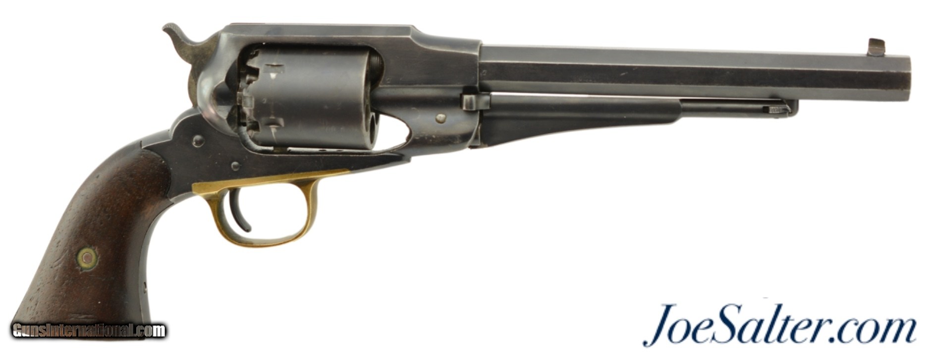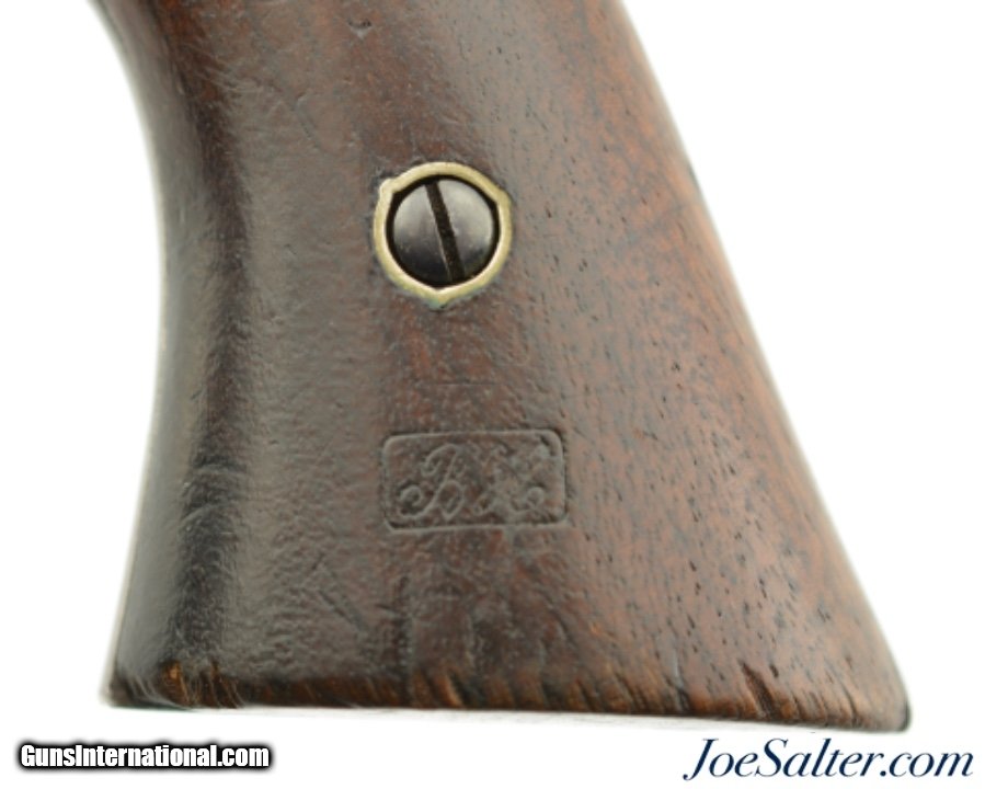 Description: Serial #66149, .44 Caliber, 8" octagon barrel with a good bore that has some minor freckling within the grooves. This is a handsome revolver that retains nearly all of a period added blue re-finish that has left the edges and markings sharp, with silvering along the high edges and projections, and some minor impact marks scattered about, most noticeably on the cylinder. A mild yellow-ochre patina is present on the trigger guard, and a replacement front sight blade is installed. The walnut grips are in good-very good shape with numerous handling marks present, and a crisp inspector cartouche is visible on the left side. The lock-up is solid, and the action functions flawlessly. This is a good-very good example of a desirable Civil War revolver, and would make a nice piece for display. Antique SOLD |