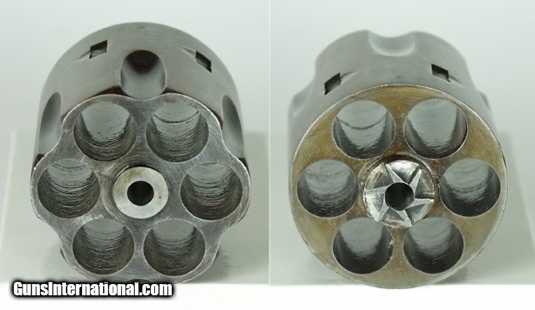 The single action mechanism functions as it should with distinctly audible sounds. The hammer half cock notch was never broken, and retains its safety cock feature. As the cylinder is turned to the next rachet position, the hand clicks, and a chamber is lined up with the gate loading port. As the hammer continues to be slowly drawn to full cock, the lock bolt falls a bit early, followed by a loud click when it engages with the cylinder locking notch. The cylinder lock-up is incredibly tight, with no rotational wiggle at all. The bore in this gun is also incredibly bright and shiny, with 5 wide lands and grooves. On a scale of 1 to 10, this M1875 is easily rated a 10 bore.
