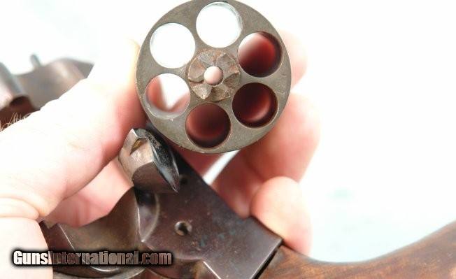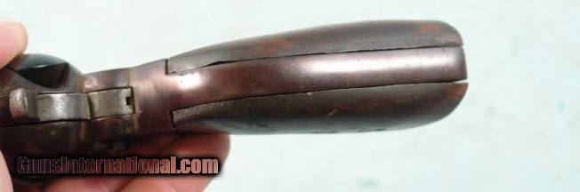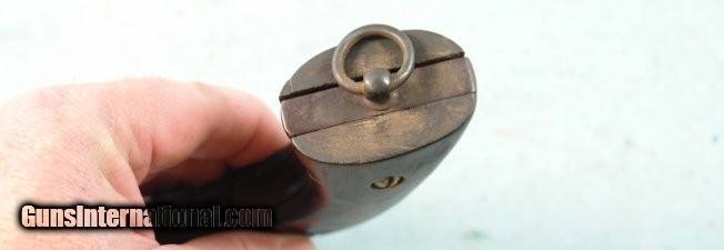 Description: EARLY REMINGTON MODEL 1875 SINGLE ACTION .44 REM. CAL. 7 ½” ARMY REVOLVER MISSING PARTS. Early type 1 with the full serial stamping in the “14XXX” on the left grip flat. Circa 1878-79 production. Original except grips which are old replacements. Missing parts including the ejector assembly and trigger and trigger guard, mainspring and cylinder operating assembly. Remaining parts with wear and reblued. Barrel and cylinder dark needing cleaning. Good barrel address. Early Frontier era 1875 with the early type “pinch” front sight. SOLD Antique: Yes Handgun Caliber: .44 |