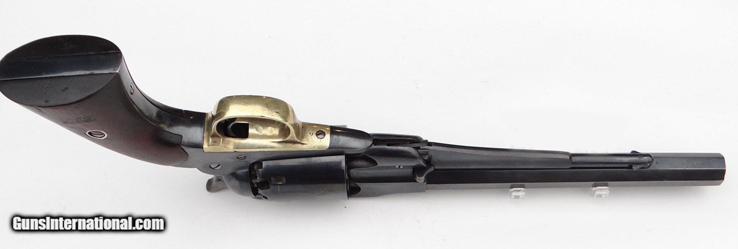 Description: An exceptional original condition, possibly unfired example, of the famous Remington Model 1858 Army percussion revolver, "New Model," in .44 caliber with 8" barrel. The Remington Army along with the 1860 Colt Army were considered the two best sidearms of the US Army during the American Civil War, 1861-1865. During the 19th century and even today many consider the Remington Army the finest handgun of the Civil War. Remington revolvers served throughout the war. After a major fire at the Colt revolver factory in 1864 demand for Remington revolvers increased and E. Remington & Sons worked hard to fill government orders. After the Civil War, Remington Army revolvers continued in service on the western frontier until replaced by Colt Model 1873 Army cartridge revolvers in 1874. Most Remington Army revolvers saw hard use in both military and civilian hands. A small number survived in fine to excellent condition. This Remington Army would be rated as one of the best of that small US Army issued group. It may be unfired since the interior of the cylinder chambers show nearly all their original blued finish. CONDITION: This Remington is in excellent original condition retaining 97% strong factory blued finish with a bit of high edge wear, a few spots of storage rust, and some light handling marks. All markings and US inspector's marks are sharp. The bore is excellent and shiny showing little or no use with a few pin-head spots of storage rust/dirt. Mechanical functions and lock-up are excellent. The cylinder arbor head retains nearly all its blued finish. The hammer retains all its casehardened finish and the trigger retains nearly all its blued finish. The screws are excellent. The original walnut grips retain nearly all their original finish with 'OWA' inspector's mark on the left grip and small inspector marks on the bottom of the grips. An exceptional example of the famous Remington .44 Army revolver for the Civil War and/or Remington collector which would be verfy difficult to up-grade. SOLD Antique: Yes Manufacturer: Remington Model: Remington 1858 Serial Number: 103826 Caliber Info: .44 Condition: Excellent Metal Condition: Excellent Wood Condition: Excellent Bore Condition: Excellent Finish: blue Manufacture Date: 1864 |