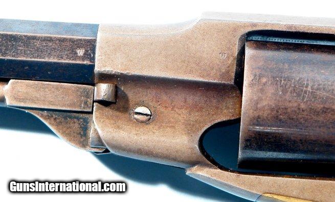 Description: FINE REMINGTON-BEALS U.S. MARTIAL .36 CAL PERCUSSION ARMY-NAVY REVOLVER. Rare with 400 made for the U.S. Army in 1861 and with low survival rate. 7 ½” octagon barrel addressed “BEALS PATENTSEPT. 14. 1858/MANUFACTURED BY REMINGTONS ILION. N.Y.”. All original and matching serial numbers in the 15,xxx range. Superior condition for one of these with 80-90% blue on the barrel and cylinder and the loading lever with 20-30% niter blue. Hammer with most of the case colors slightly muted. Frame a deep grey patina. Excellent barrel address and U.S. Ordnance inspection marks on the barrel, frame and cylinder. Excellent grips with the original finish (no cartouche). Working order and excellent bore and chambers. Old collection provenance. SOLD Antique: Yes |