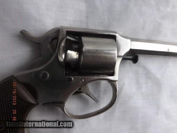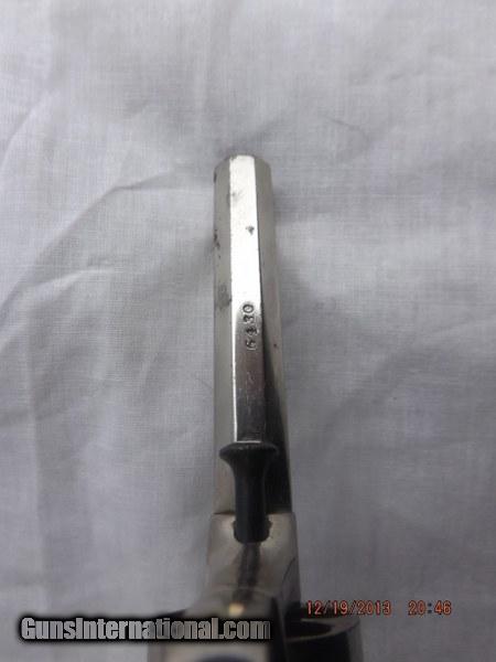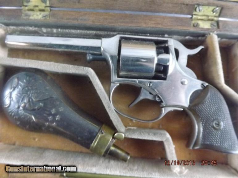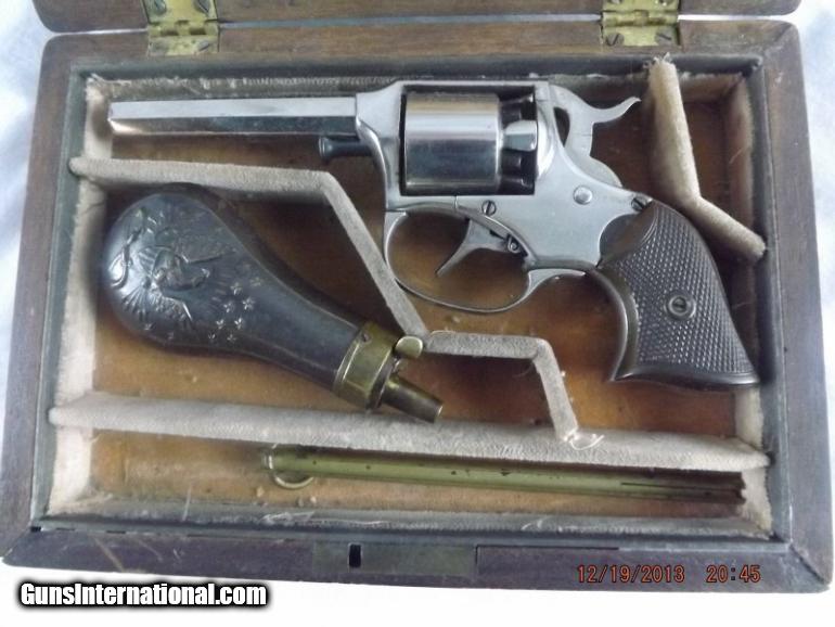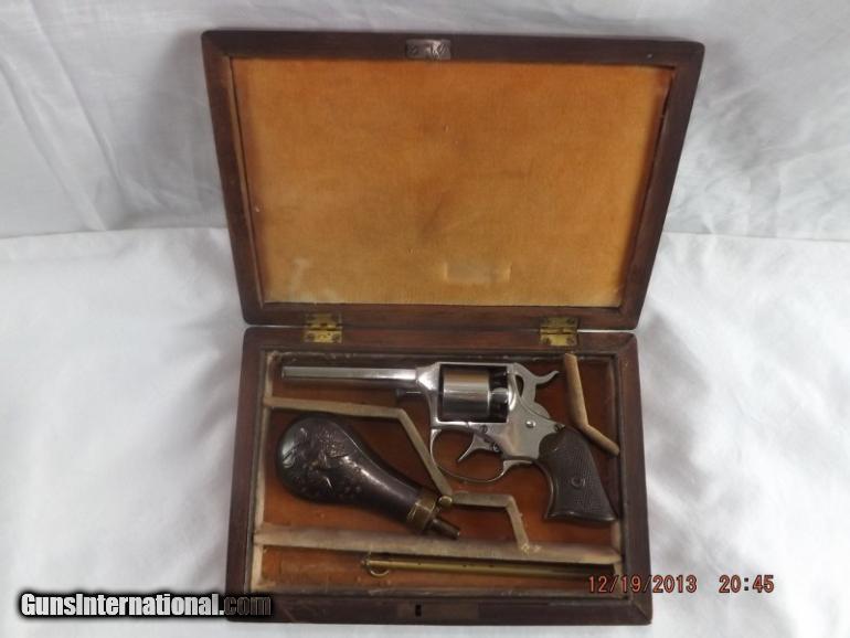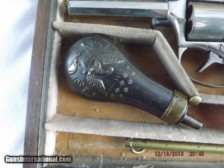 S/N 6430 These were made from 1860 until 1873 when the factory began converting them to metalic cartridge guns. These percussion guns are sometimes called "Mushrooms" by collectors because of the shape of the cylinder. This little beauty retains almost all of it's original nickel finish with a few small spots missing on the barrel and around the nipples. Checkered hard rubber grips are in perfect condition. Comes in a nice vintage wooden case complete with a scarce original small Eagle powder flask and a brass capper. Hard to find in this condition.