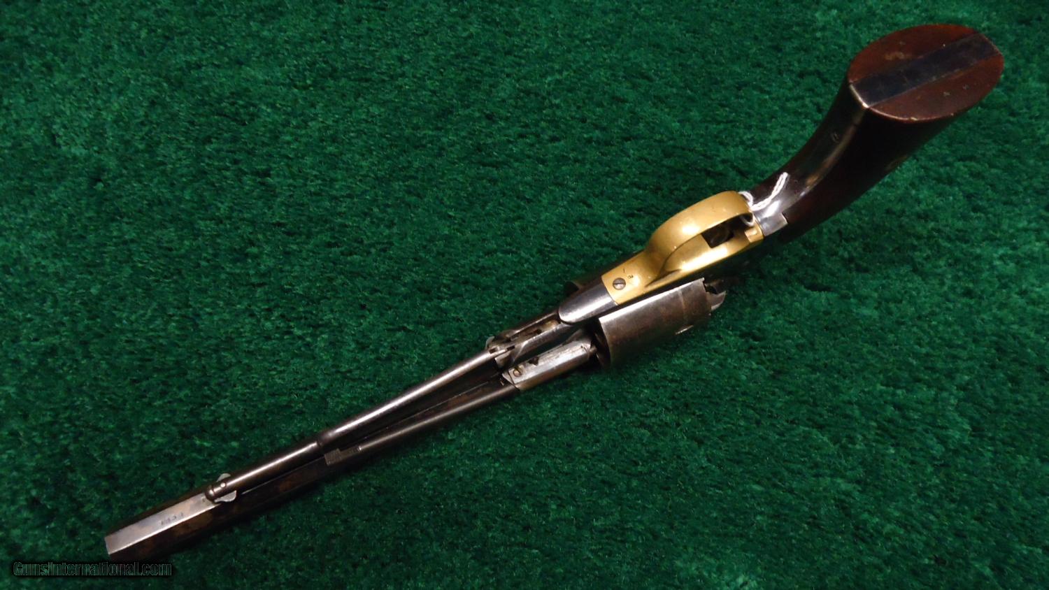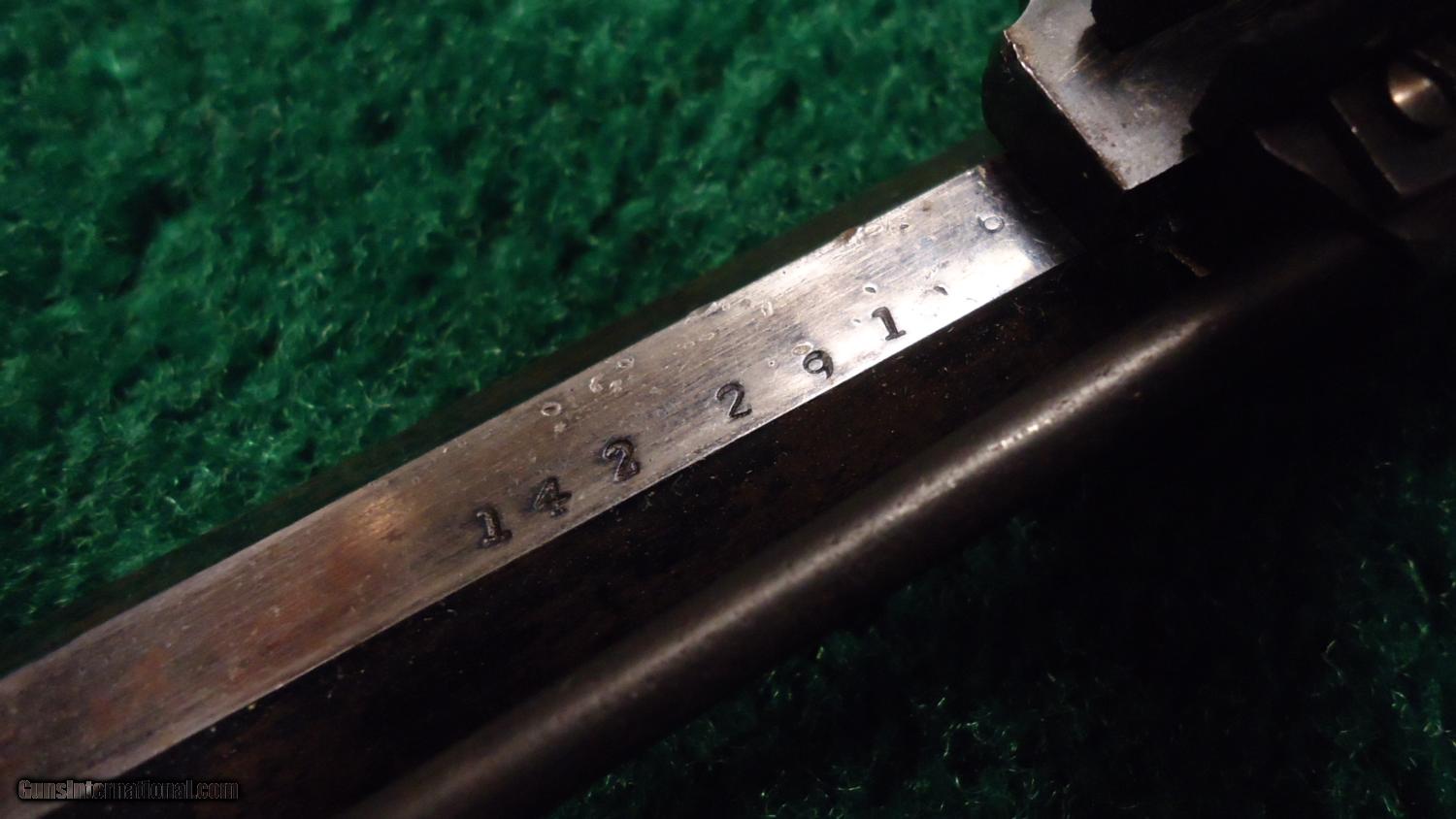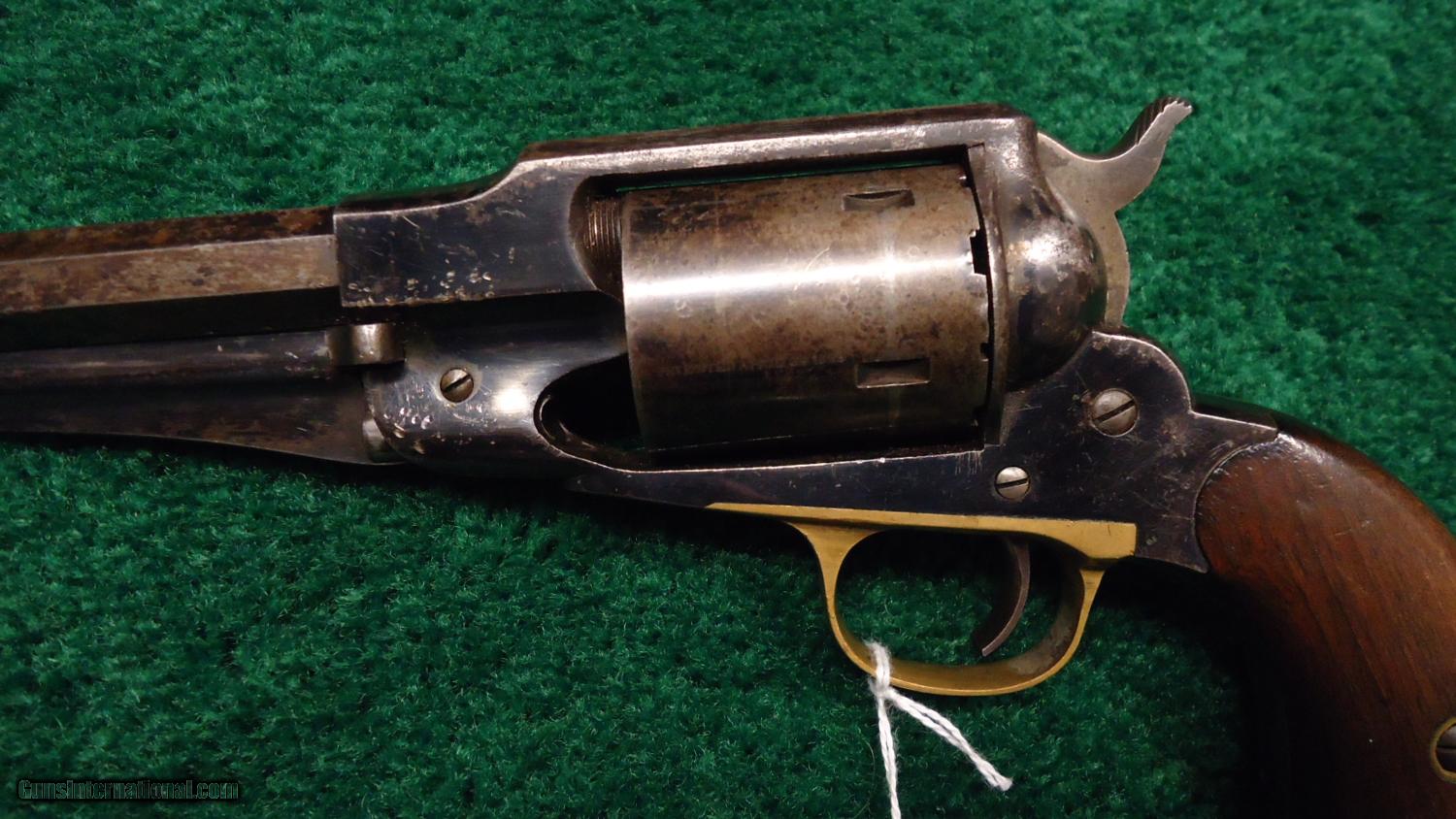 Description: This is the Remington New Model Army Conversion. 44 cal and 8" bbl. A faint Military cartouche remains on the left hand stock. A pretty good condition old revolver with most frame blue remaining, quite a bit of finish on the cylinder and some flaking to the finish on the bbl. Metal is nice and smooth. The brass trigger guard is very nice as are the grips. Standard wear but no chunks missing. Action works well and the bore is VG+. An interesting old Remington. Leroy Merz Antique Firearms specializes in antique and vintage Winchesters and other fine American firearms. Since 1965 Mr. Merz has taken part in the world of firearms and has been a contributor to many well known reference books. Just recently we mailed the 125th edition of our privately-published catalog. We have hundreds of additional guns in every price range at our home online. Search for Merz Antiques in google. SOLD Antique: Yes |