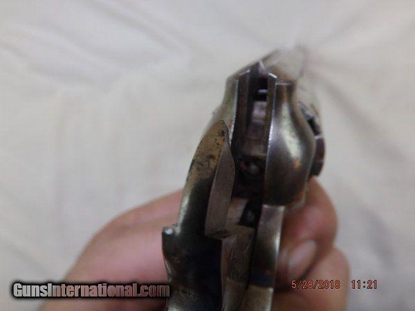 Description: Remington New Model Single Action Belt revolver in the rare nickel finish. Serial Number 42604. Factory Conversions to .38 Rimfire were produced from 1870 to 1886. Flaydermans says there were approximately 2500 to 3,000 made, Fjestad says around 5,000. Either way, they're still pretty scarce. 6 1/2" barrel. Works perfectly and locks up tight. Retains over 80% of it's original Nickel finish with most of the loss on the grip straps. There are a couple of spots of light pitting. The brass trigger guard retains about 20% of its silver plating. The original numbered grips have a small chip missing from the toe of the right grip and retain about 75% of their original finish. SOLD Antique: Yes |