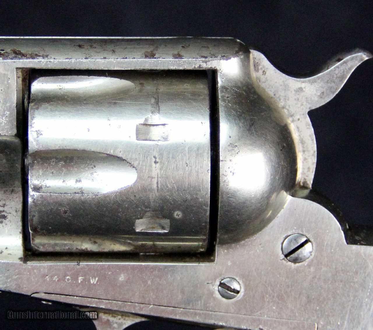 Description: .44wcf, NVSN, 5 3/4 inch barrel, nickel finish, 2 piece walnut grips, lanyard ring, hammer spur is smooth, circa 1890's. Condition: very good rifling with black powder oxidation, 90% nickel overall, very good grips are probably from an 1875 as they are marked "44", excellent mechanically, excellent marks. SOLD Antique: Yes |