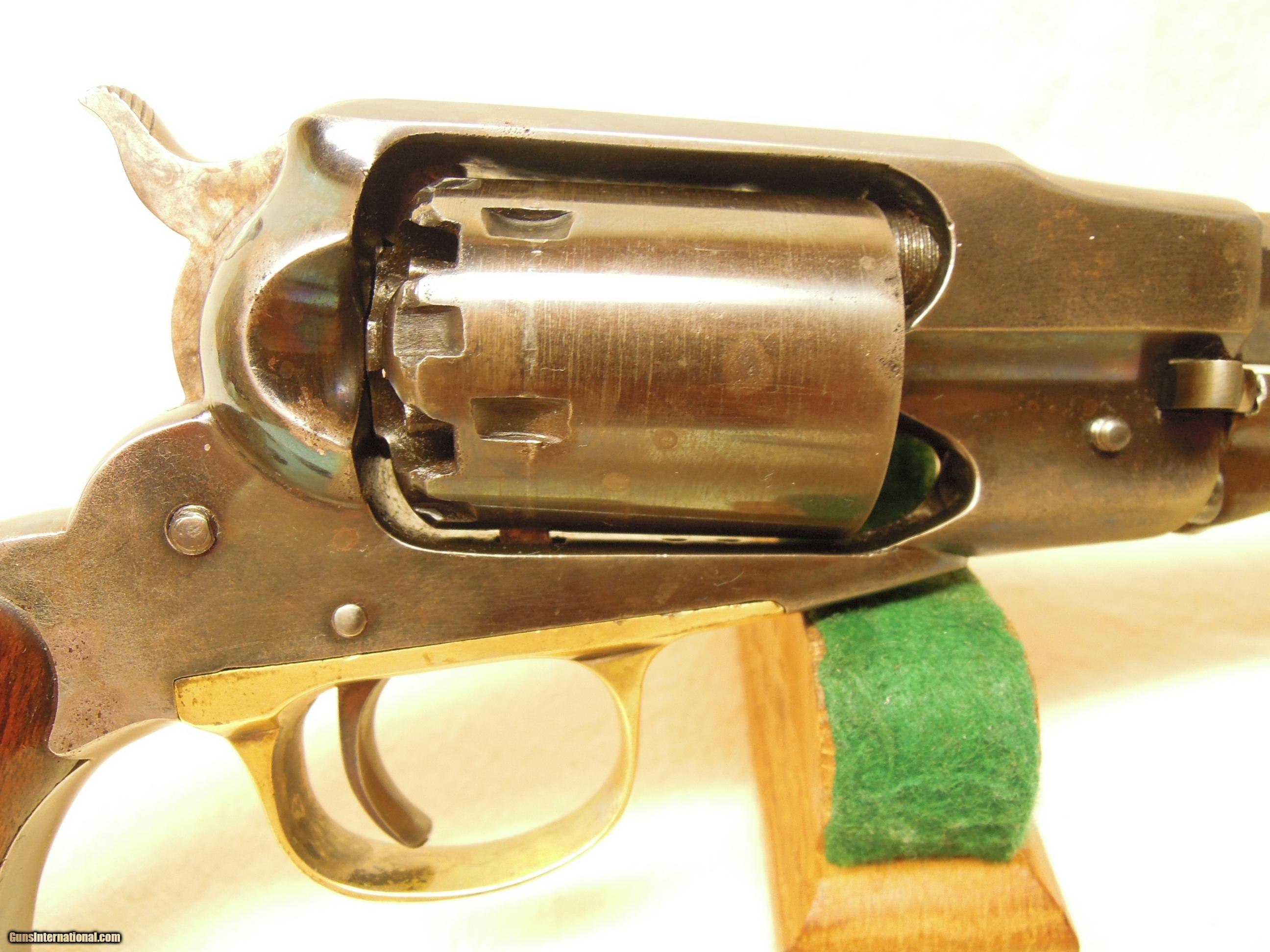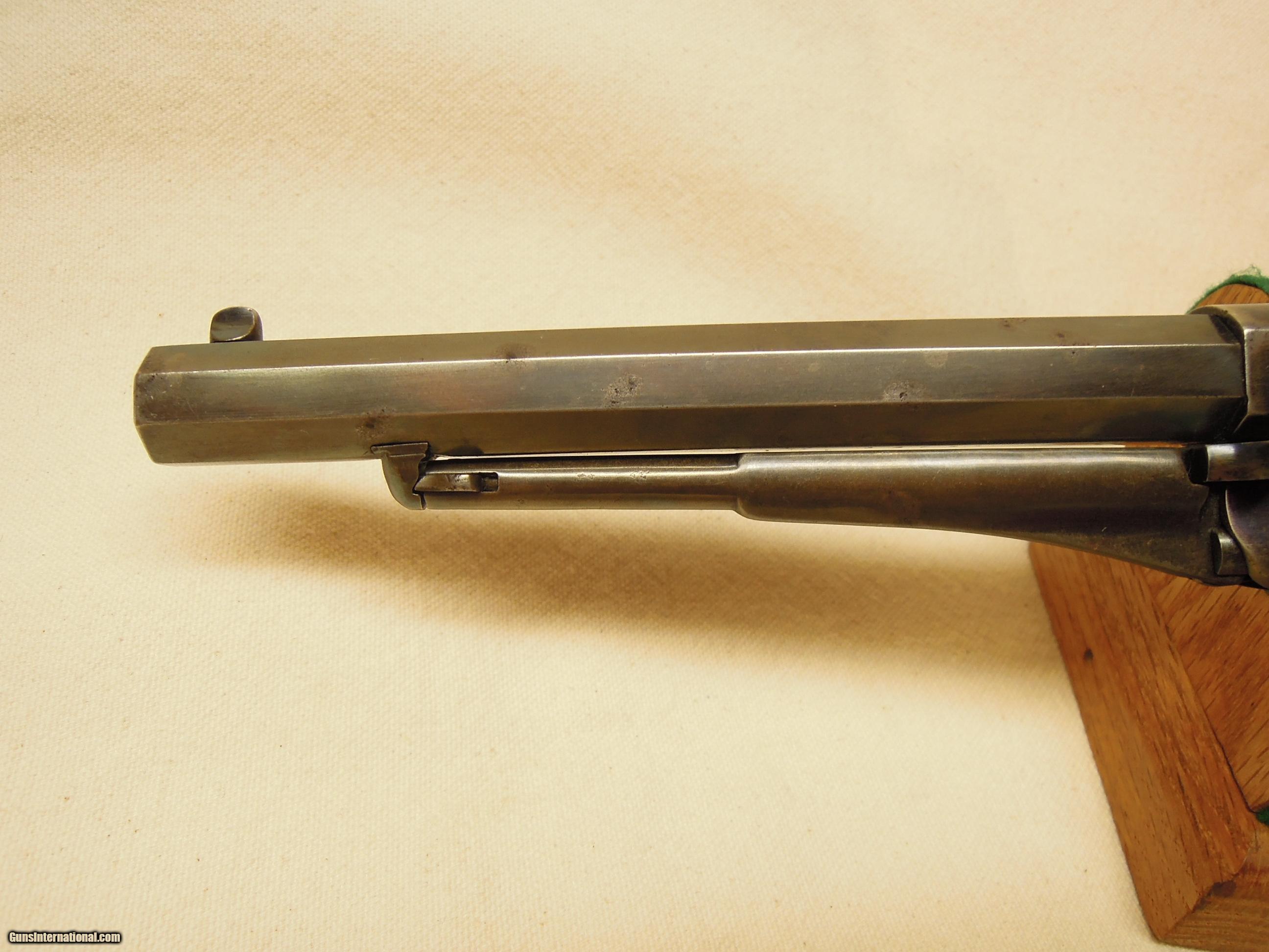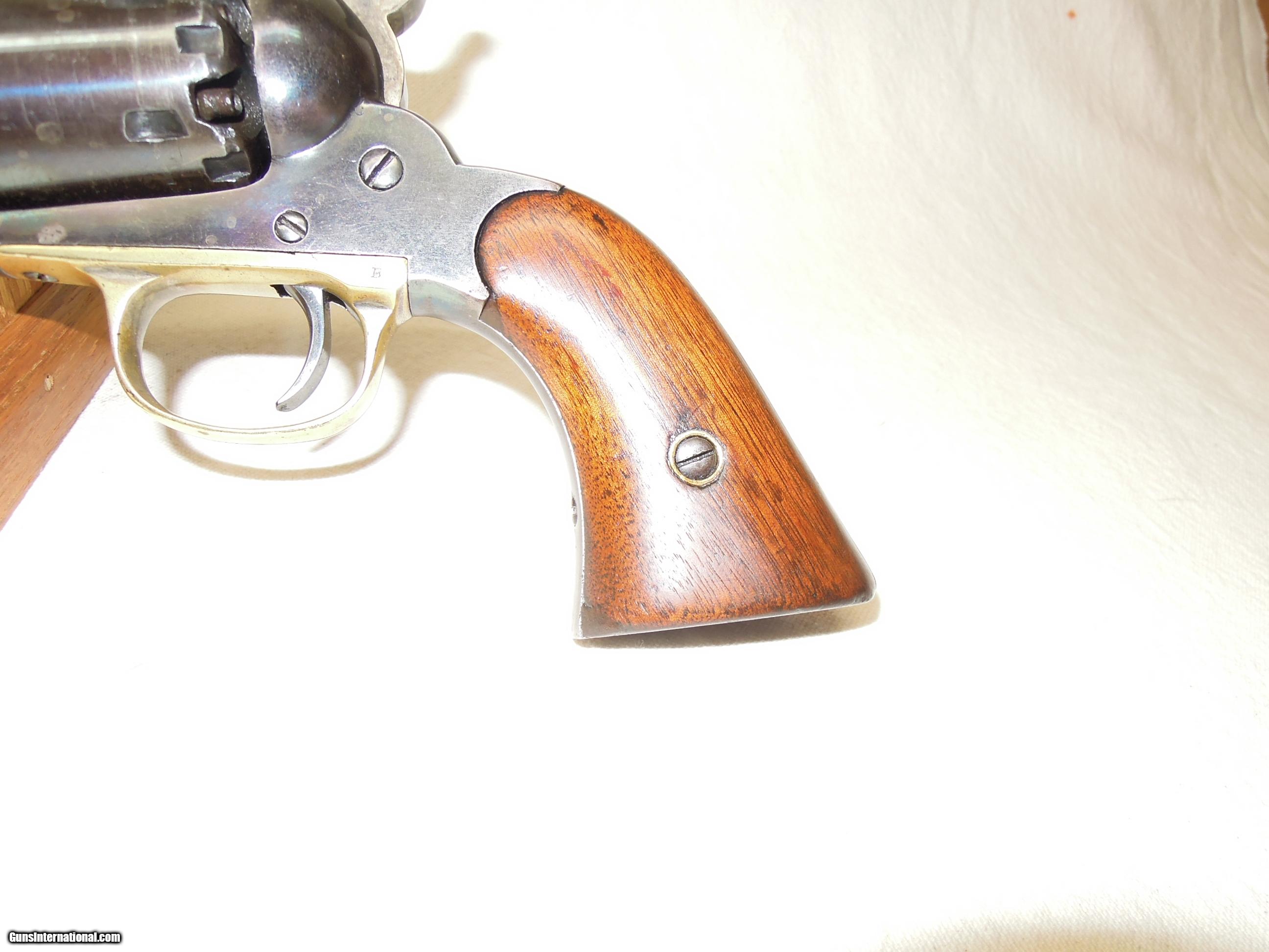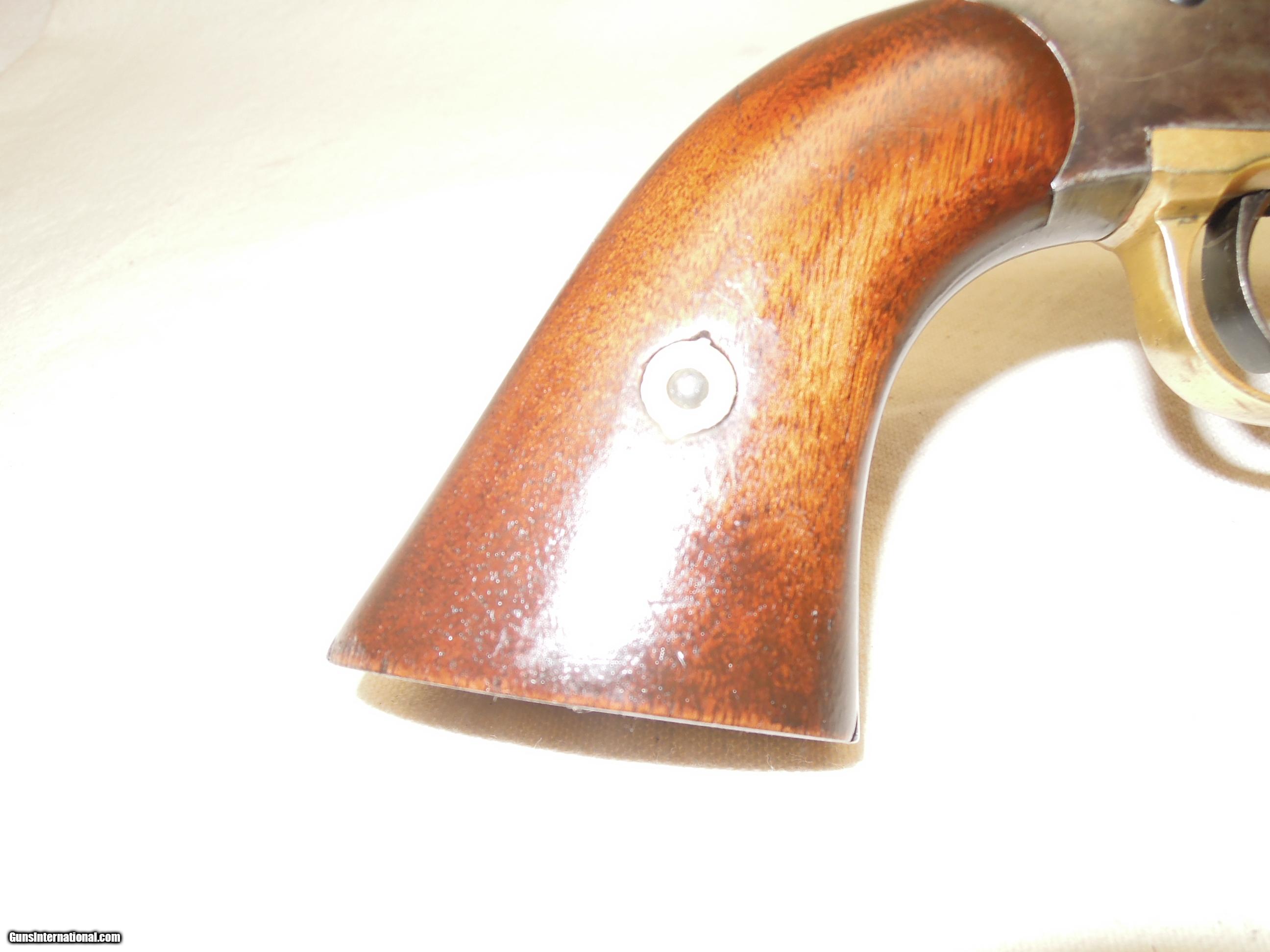 Description: Remington New Model Navy Revolver - Cal. .36 - 7 3/8" Bbl. - SN 35048(1865 Approx.) - serials matching on barrel, frame, and trigger guard - "P" insp. stamp on guard - no markings on the cylinder. May or may not be a Martial Navy as these were not stamped with the anchor until after the war. Bore is excellent - bright with sharp rifling - shows some very mild light roughness near the muzzle - perfect chambers and nipples. Excellent action with perfect timing and lock-up . Metal is excellent overall with sharp edges and markings - barrel and frame show a few areas of minor spotting and part of frame, barrel, and loading lever show evidence of touch-up - the cylinder also has some minor spotting and finish touch-up. Metal overall retains 85% -90% finish with some thinning but no rust or corrosion . Walnut grips are refeinished and may be replacements - the right grip has evidence of a repair around the screw escutcheon and the left grip has a small chip repair at the toe - about 95% finish remains. About 28,000 of this model were produced from 1863 to 1878 and it was a popular Civil War sidearm and a popular early West percussion revolver. This is a crisp New Model Navy in VG+ to about Fine condition overall with perfect mechanics and except for grips and blue touch-up, all original and unaltered. A very nice representative excample of a scarce Remington Navy revolver. SOLD Antique: Yes Manufacturer: REMINGTON Model: NEW MODEL NAVY Caliber Info: .36 |