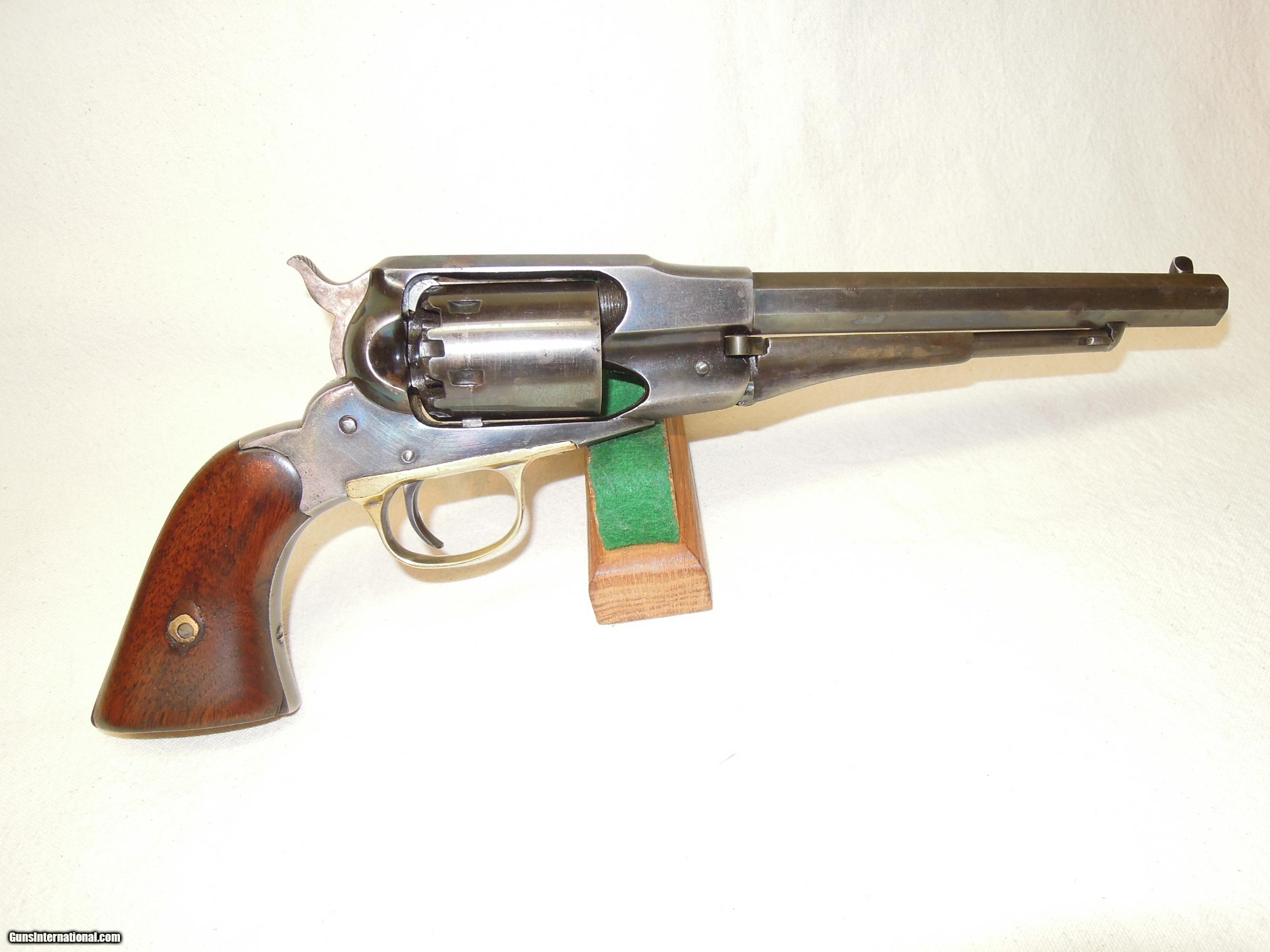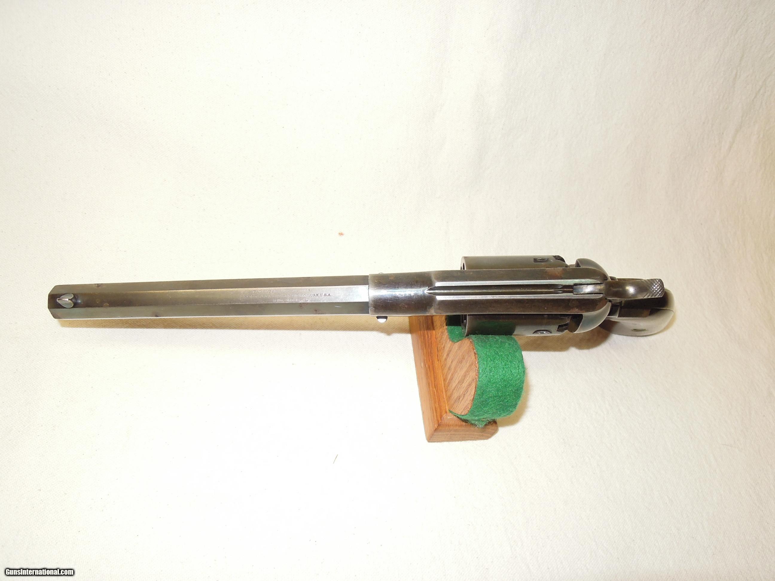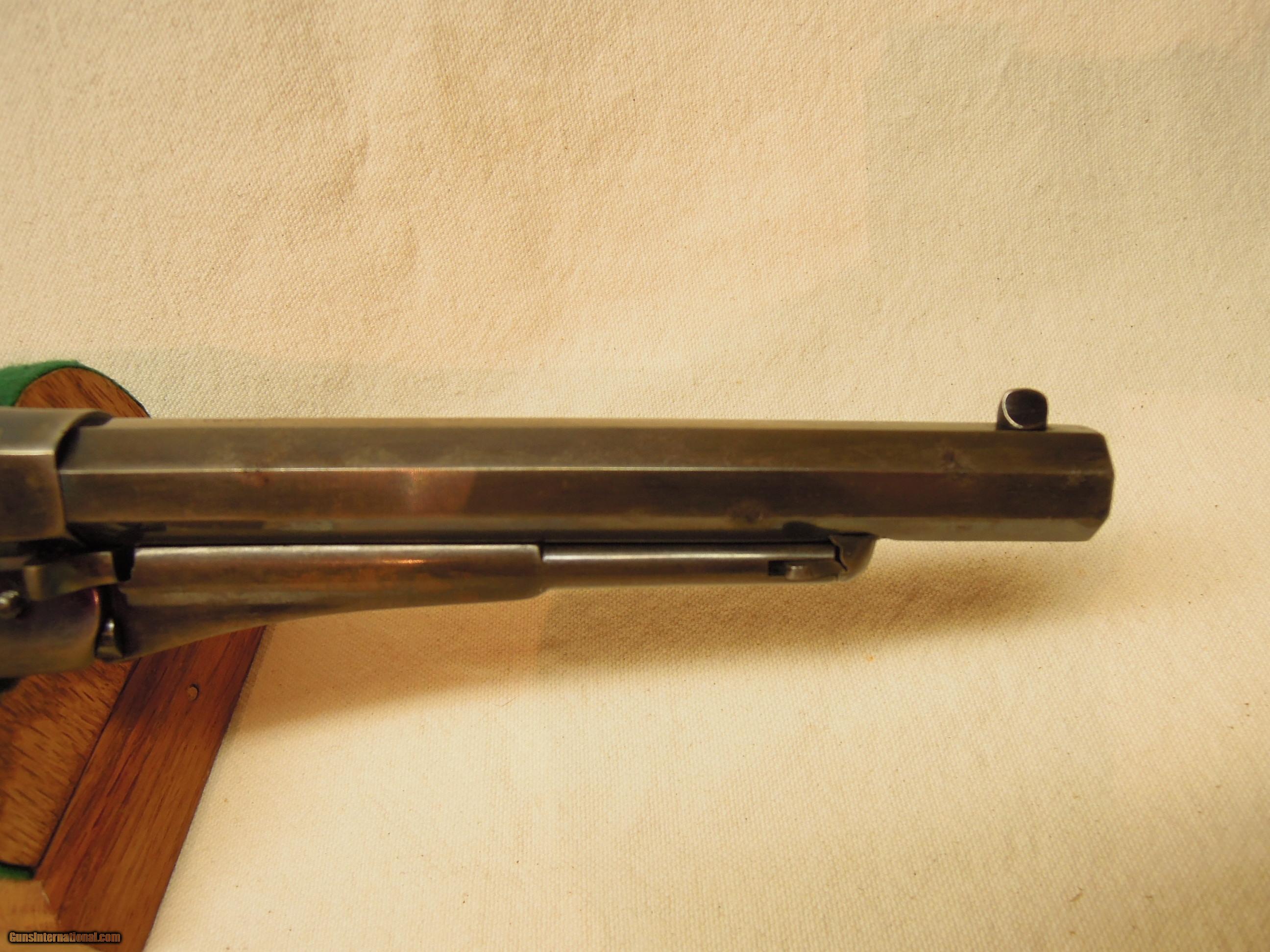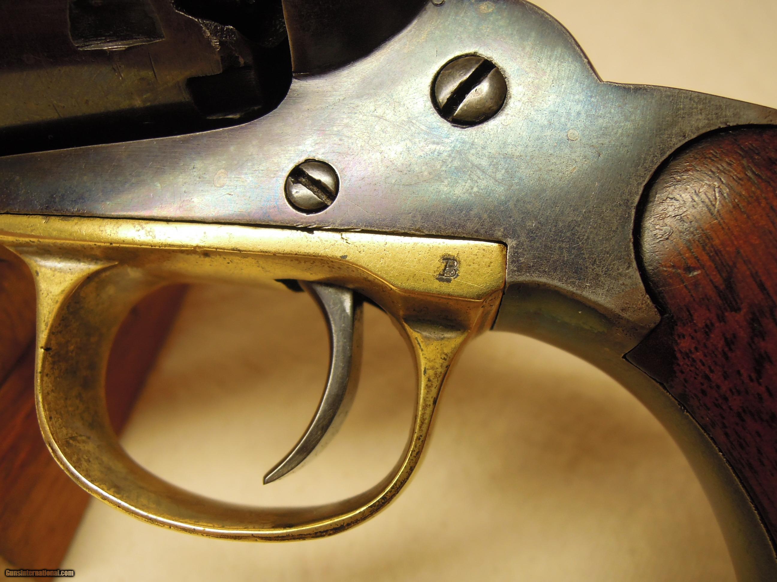 Description: Remington New Model Navy Revolver - Cal. .36 - 7 3/8" Bbl. - SN 35048(1865 Approx.) - serials matching on barrel, frame, and trigger guard - "P" insp. stamp on guard - no markings on the cylinder. May or may not be a Martial Navy as these were not stamped with the anchor until after the war. Bore is excellent - bright with sharp rifling - shows some very mild light roughness near the muzzle - perfect chambers and nipples. Excellent action with perfect timing and lock-up . Metal is excellent overall with sharp edges and markings - barrel and frame show a few areas of minor spotting and part of frame, barrel, and loading lever show evidence of touch-up - the cylinder also has some minor spotting and finish touch-up. Metal overall retains 85% -90% finish with some thinning but no rust or corrosion . Walnut grips are refeinished and may be replacements - the right grip has evidence of a repair around the screw escutcheon and the left grip has a small chip repair at the toe - about 95% finish remains. About 28,000 of this model were produced from 1863 to 1878 and it was a popular Civil War sidearm and a popular early West percussion revolver. This is a crisp New Model Navy in VG+ to about Fine condition overall with perfect mechanics and except for grips and blue touch-up, all original and unaltered. A very nice representative excample of a scarce Remington Navy revolver. SOLD Antique: Yes Manufacturer: REMINGTON Model: NEW MODEL NAVY Caliber Info: .36 |