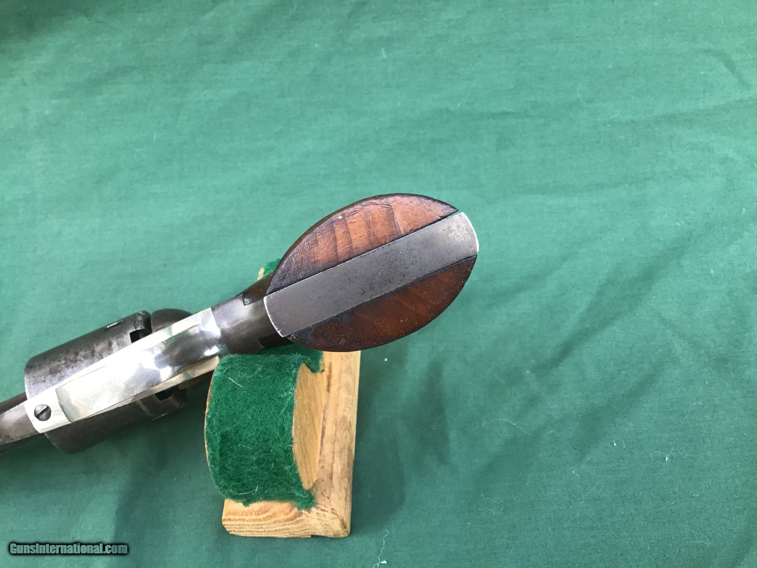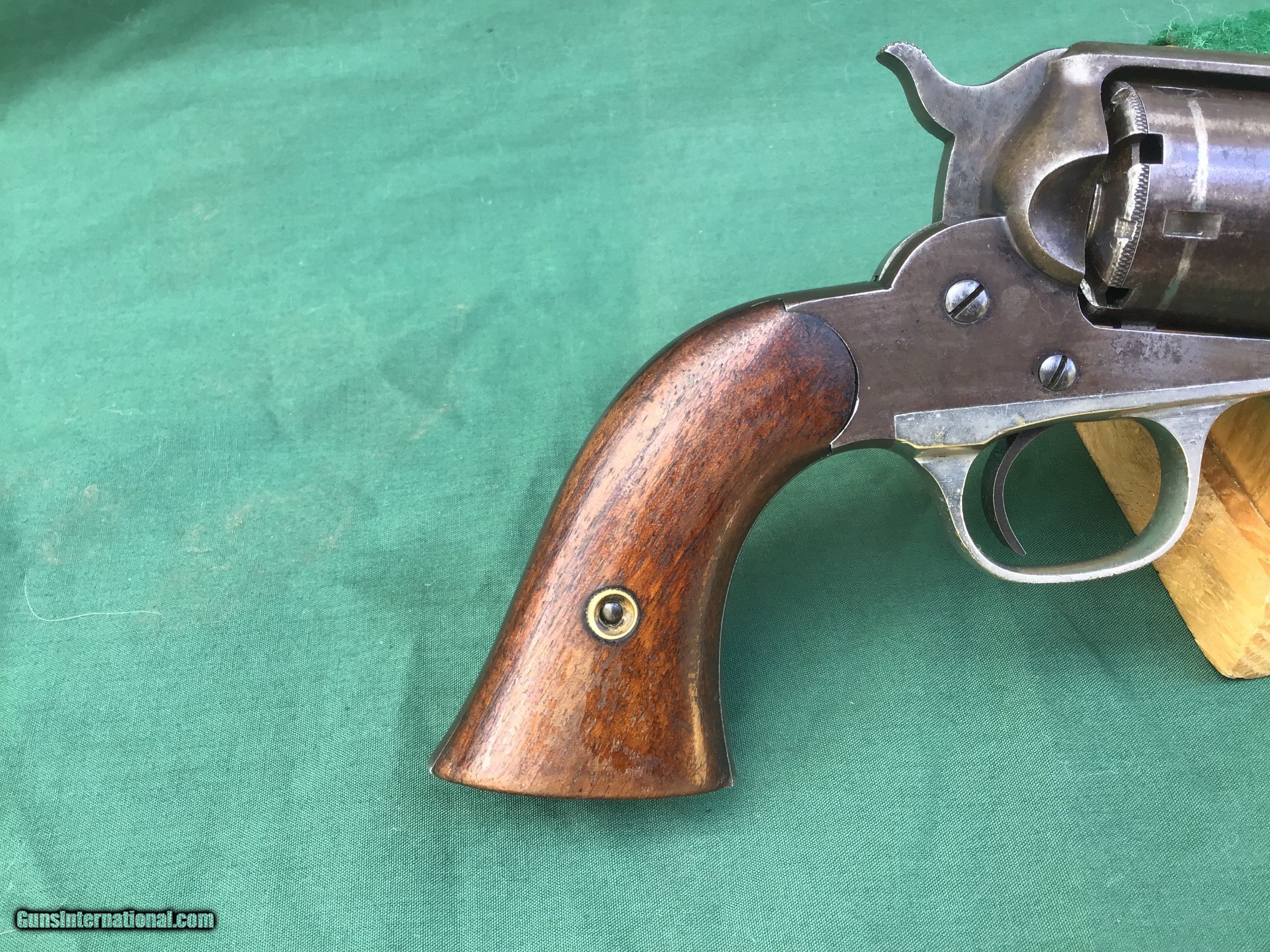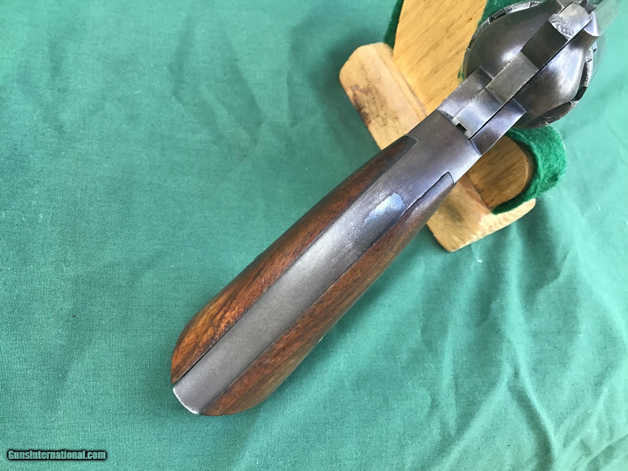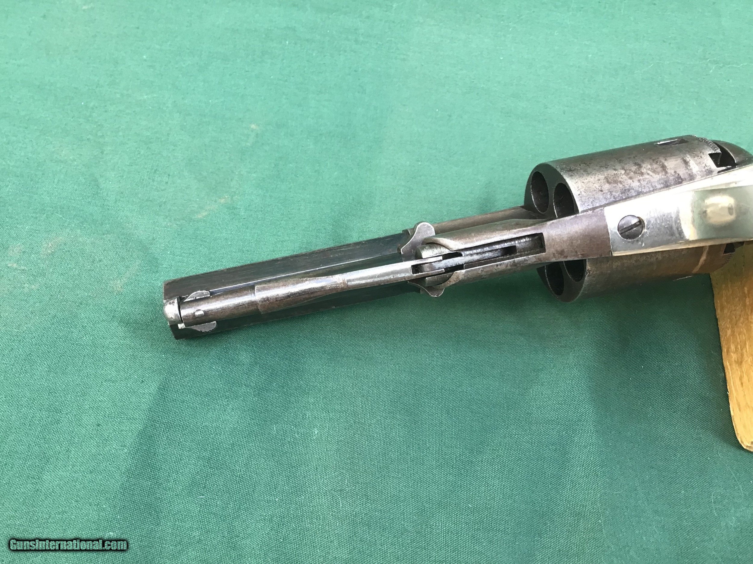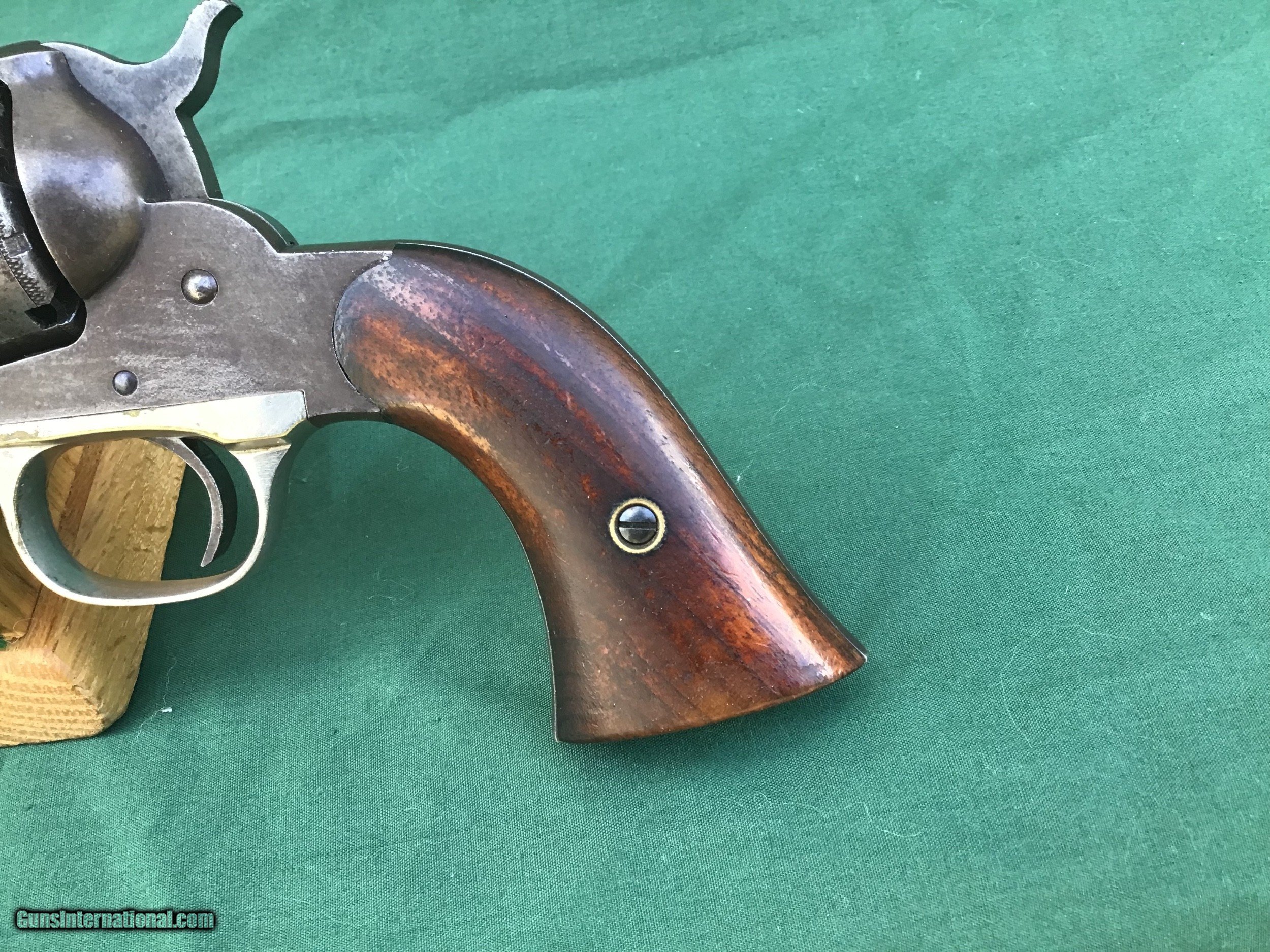 Description: Sold Remington New Model Police 38 RF Factory Conversion, serial number 2646 (barrel and inside grip frame). Two piece cylinder and 3 1/2" octagon barrel. Action functions nicely. This is a rarely seen factory blued example, most conversions were nickel plated. Barrel and loading lever retain 70 to 75% of their original blue. Traces of original blue on the frame and back strap. Trigger has almost all of its original factory finish remaining. Cylinder has about 20% of its original finish as well. Nice case colors still present on hammer. Very nice grips that have matching serial numbers. Very nice barrel markings. Original front sight and I will rate the bore in fair condition. Antique and can shipped directly to your doorsteps. Please feel free to ask questions. SOLD Antique: Yes |