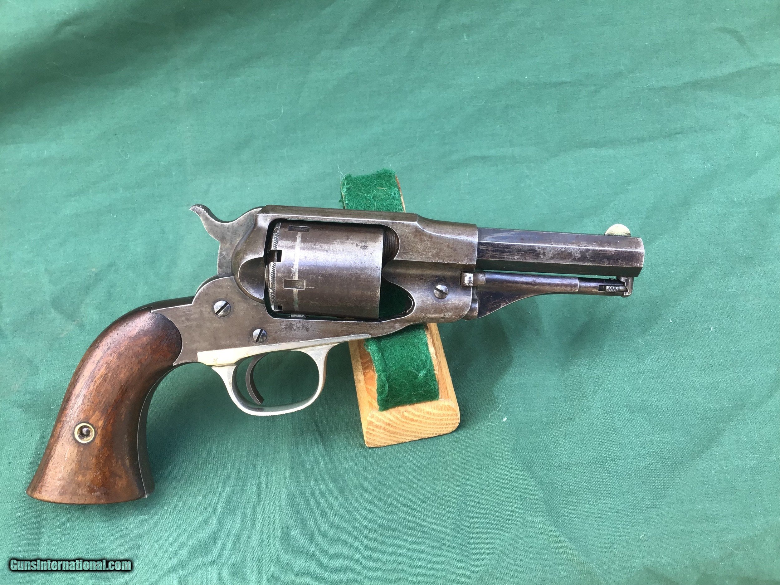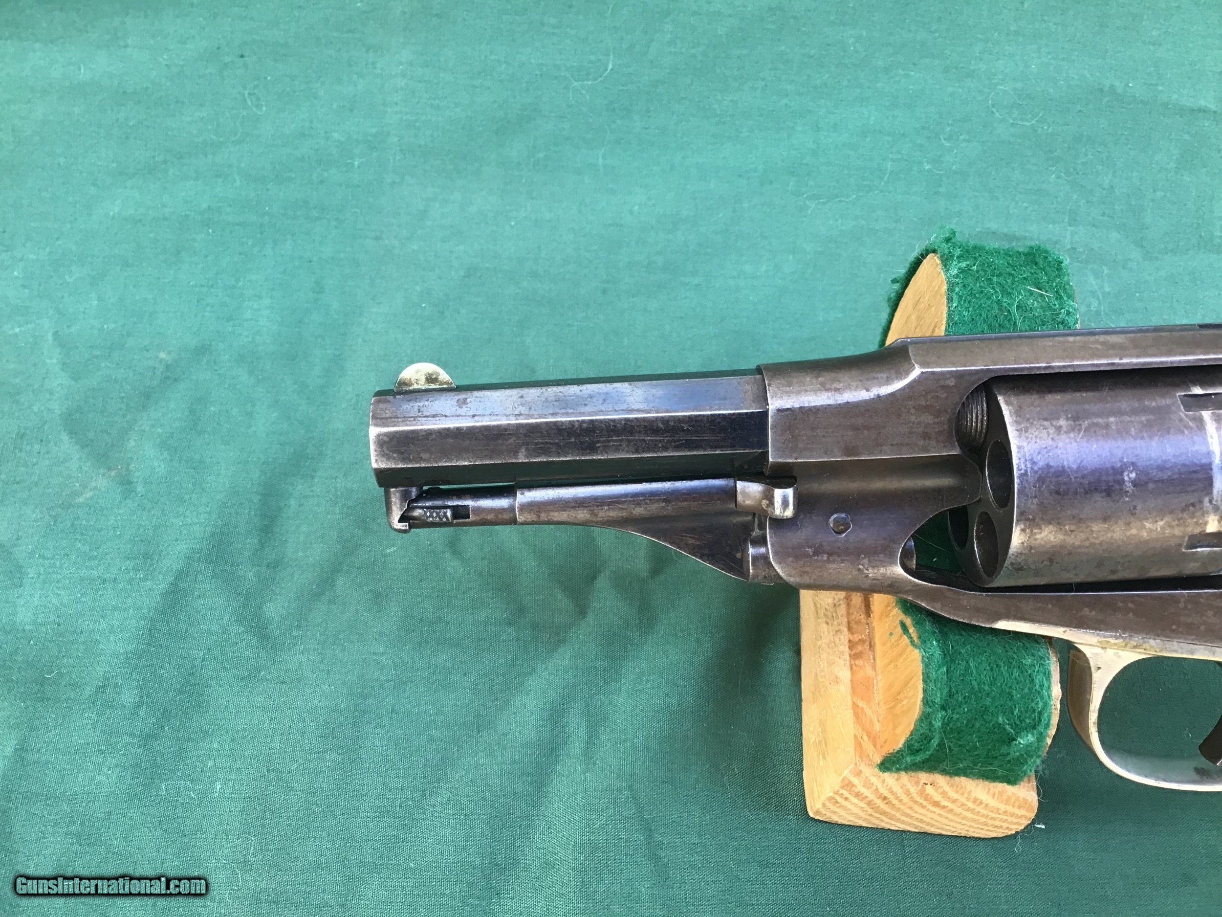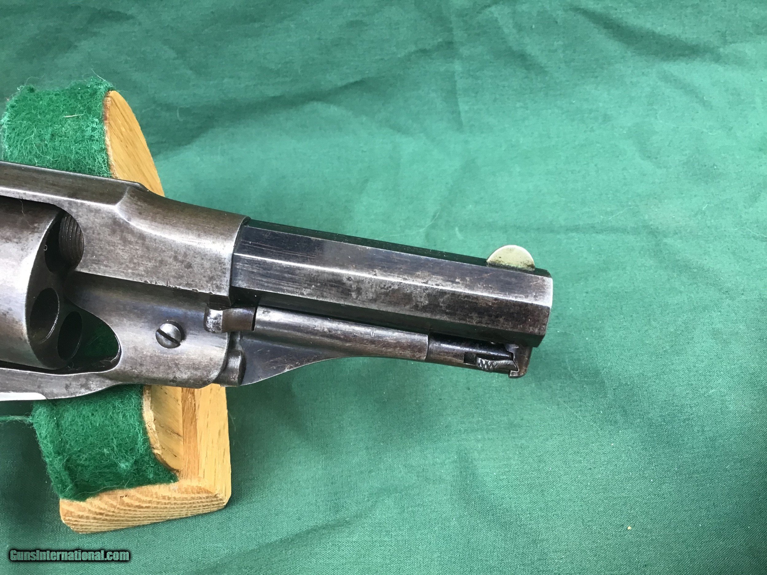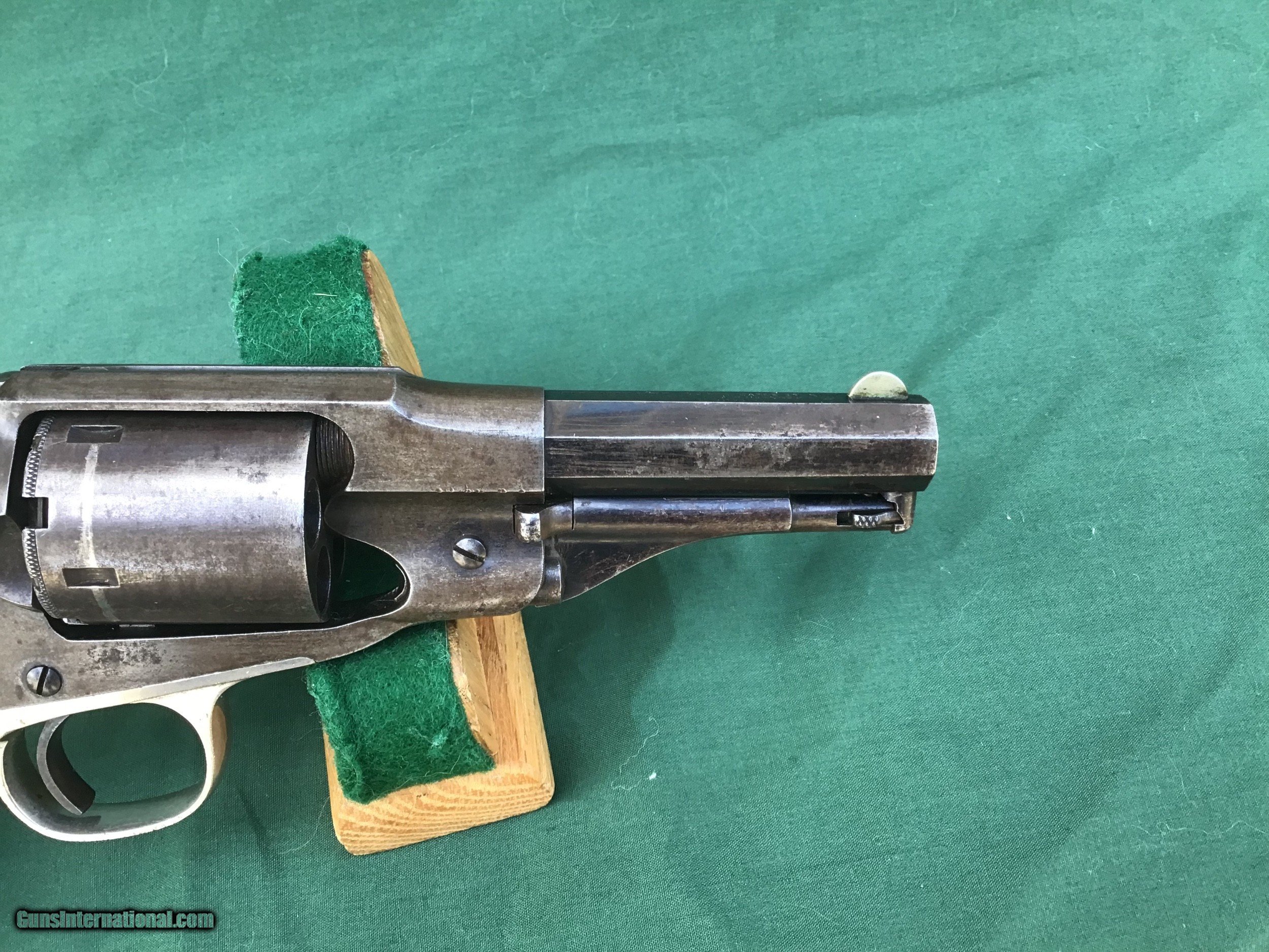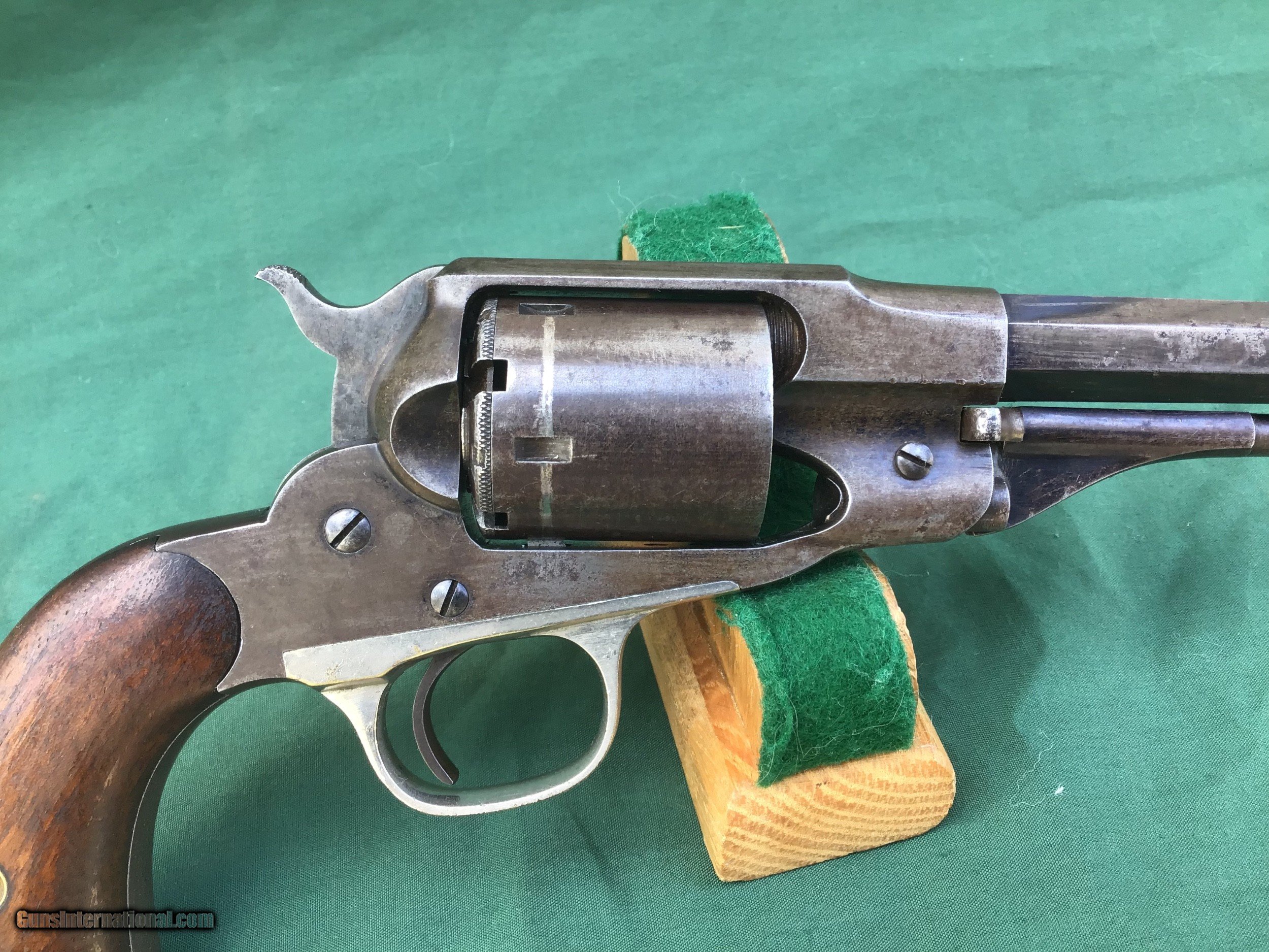 Description: Sold Remington New Model Police 38 RF Factory Conversion, serial number 2646 (barrel and inside grip frame). Two piece cylinder and 3 1/2" octagon barrel. Action functions nicely. This is a rarely seen factory blued example, most conversions were nickel plated. Barrel and loading lever retain 70 to 75% of their original blue. Traces of original blue on the frame and back strap. Trigger has almost all of its original factory finish remaining. Cylinder has about 20% of its original finish as well. Nice case colors still present on hammer. Very nice grips that have matching serial numbers. Very nice barrel markings. Original front sight and I will rate the bore in fair condition. Antique and can shipped directly to your doorsteps. Please feel free to ask questions. SOLD Antique: Yes |