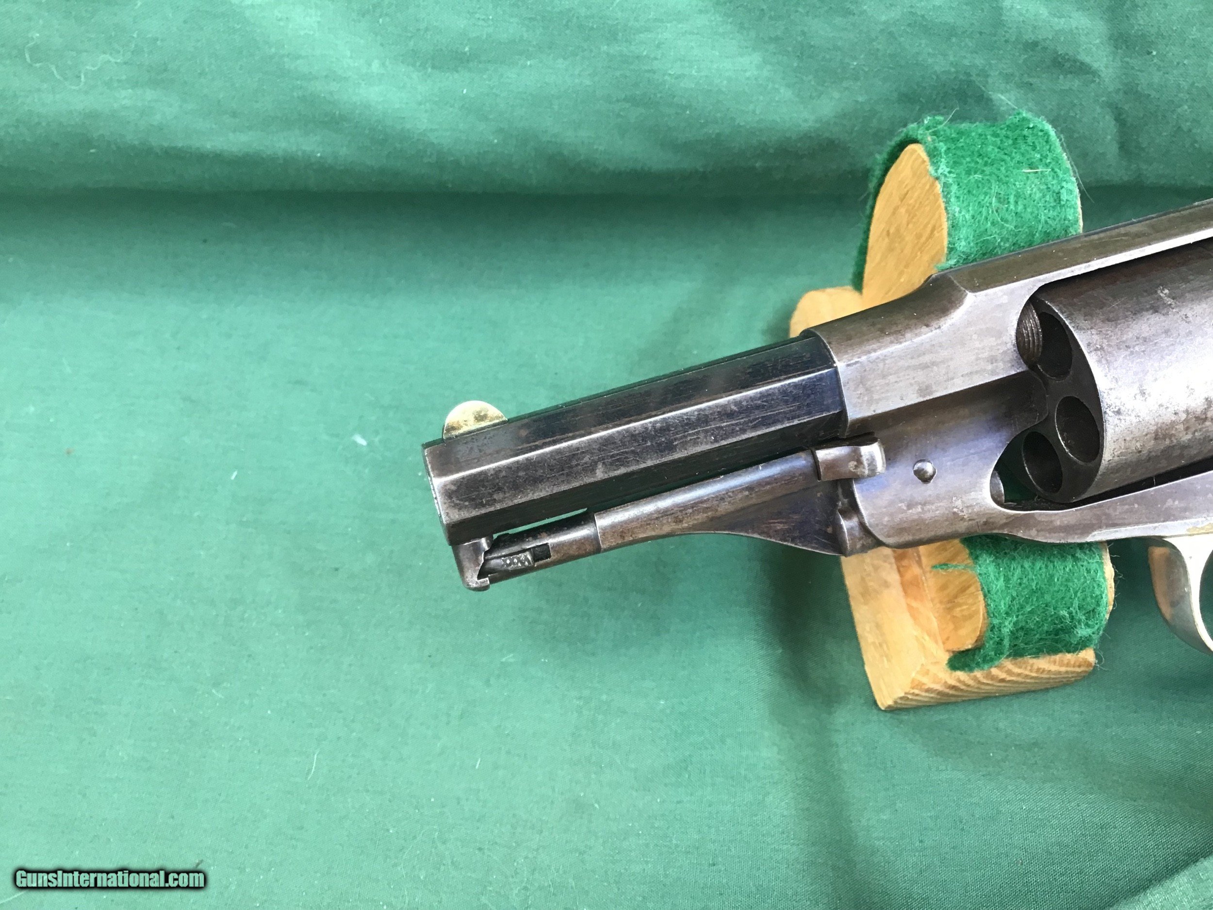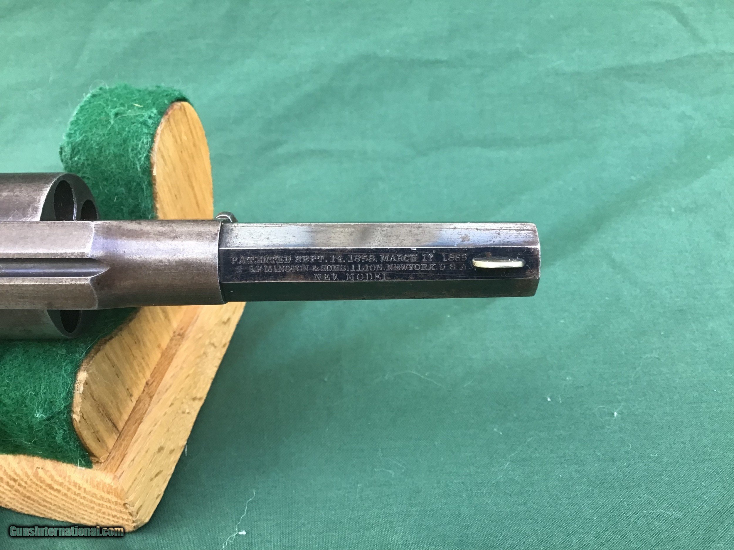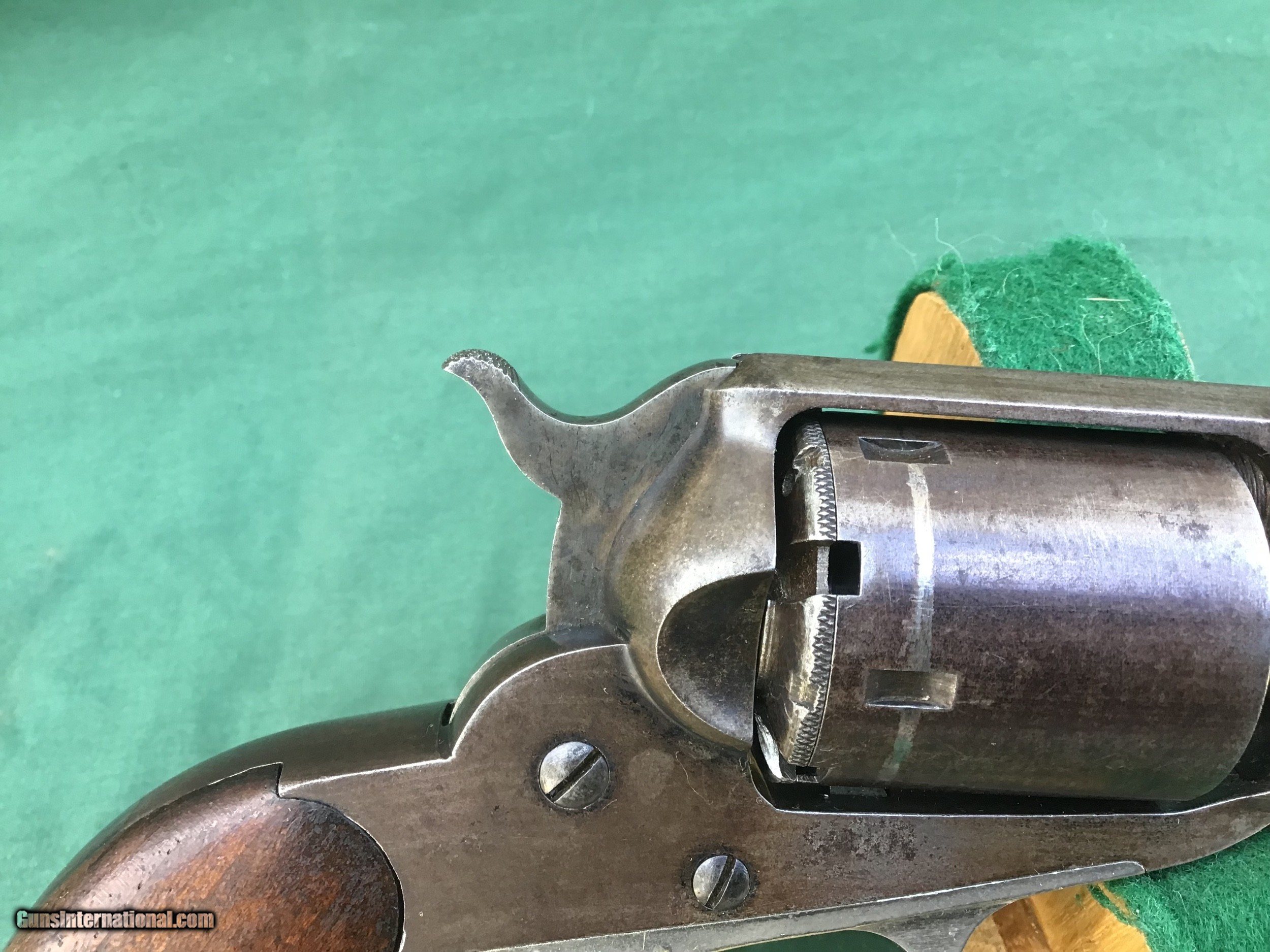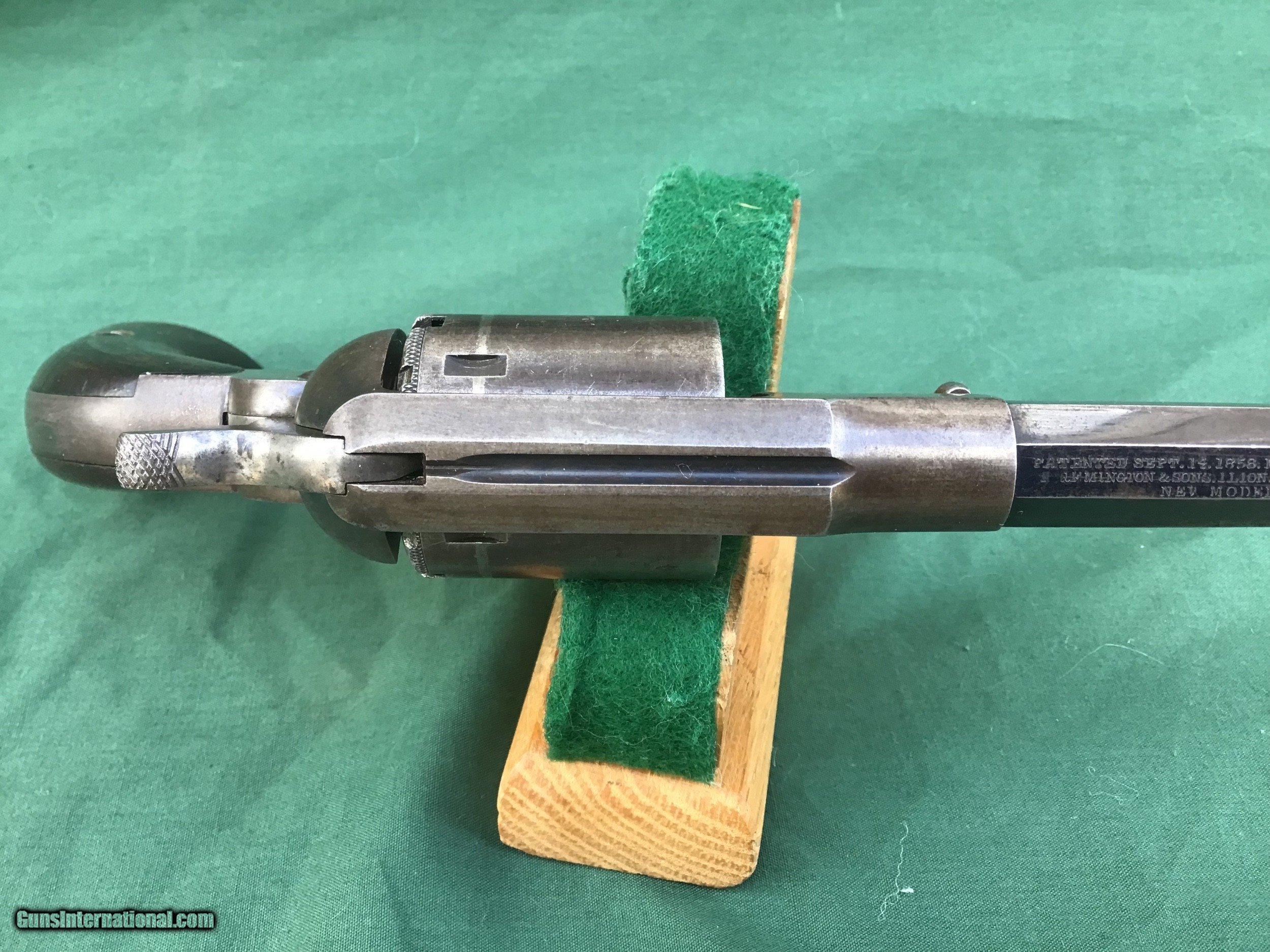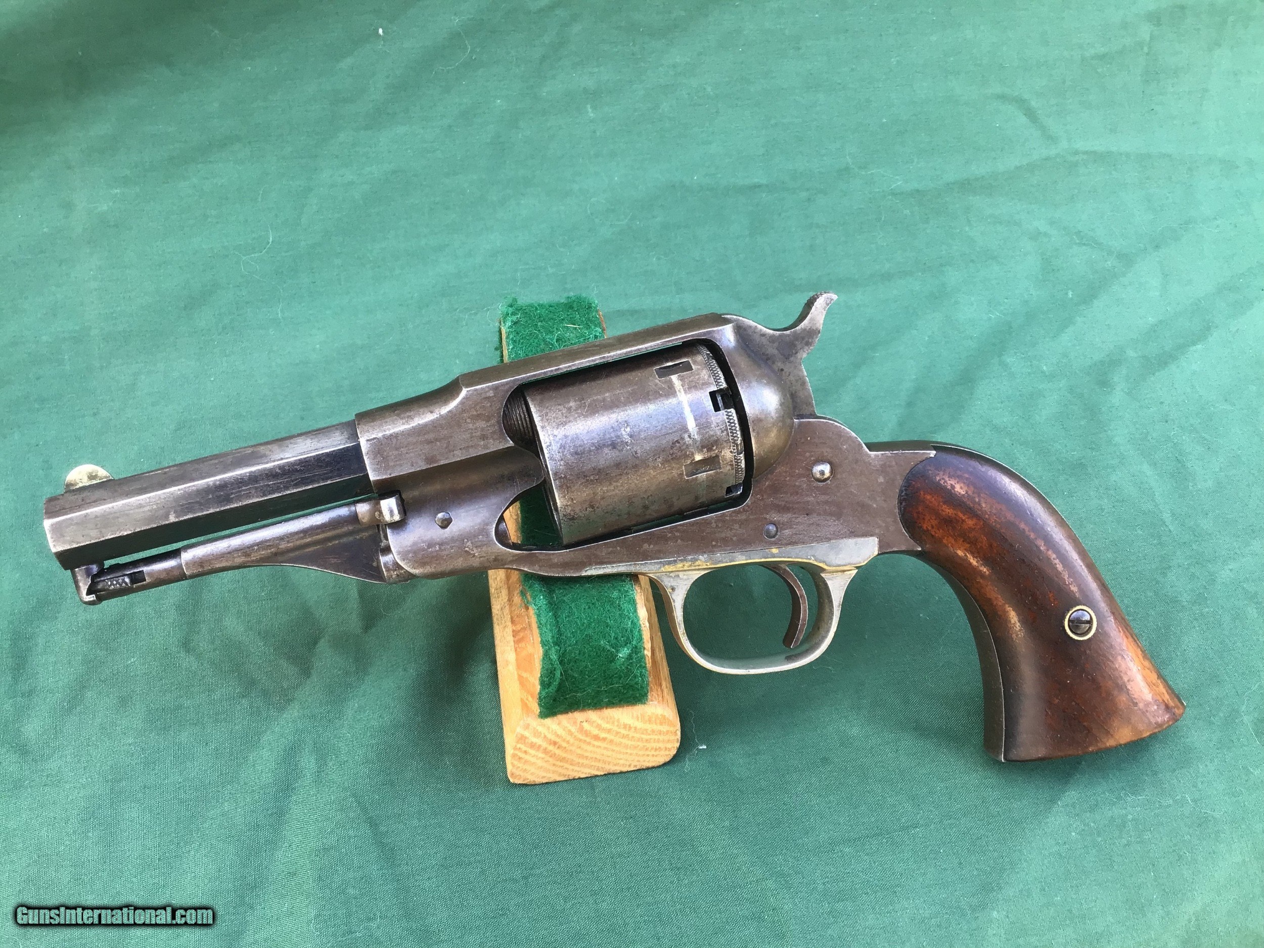 Description: Sold Remington New Model Police 38 RF Factory Conversion, serial number 2646 (barrel and inside grip frame). Two piece cylinder and 3 1/2" octagon barrel. Action functions nicely. This is a rarely seen factory blued example, most conversions were nickel plated. Barrel and loading lever retain 70 to 75% of their original blue. Traces of original blue on the frame and back strap. Trigger has almost all of its original factory finish remaining. Cylinder has about 20% of its original finish as well. Nice case colors still present on hammer. Very nice grips that have matching serial numbers. Very nice barrel markings. Original front sight and I will rate the bore in fair condition. Antique and can shipped directly to your doorsteps. Please feel free to ask questions. SOLD Antique: Yes |