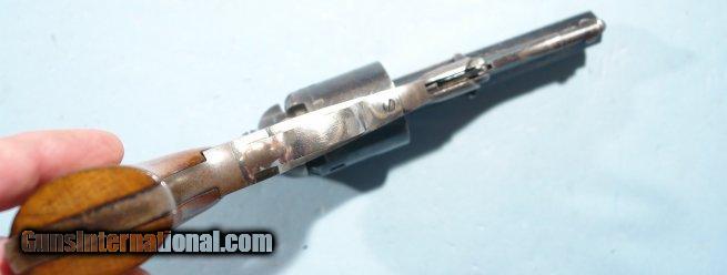 Description: SUPERIOR REMINGTON NEW MODEL 36 CAL. PERC. POLICE REVOLVER W/EXTRA FACTORY 38 RF CAL. CONV. CYL. CA. 1871. 5 shot with 3 ½” octagon barrel with “NEW MODEL” address. All original and matching serial numbers in the 1,xxx serial range with the conversion cylinder and recoil shield correctly assembly numbered in the 3xx range and matching. Excellent with 70% plus original blue and 995 silver plate on the trigger guard. Cylinder and frame with London proofs. Excellent screws with original blue. Rare factory “Oak” grips with all the finish. Was probably in a London oak case. Excellent bore and working order. Extra cylinder with 80-90 original blue. Extra nice. SOLD Antique: Yes |