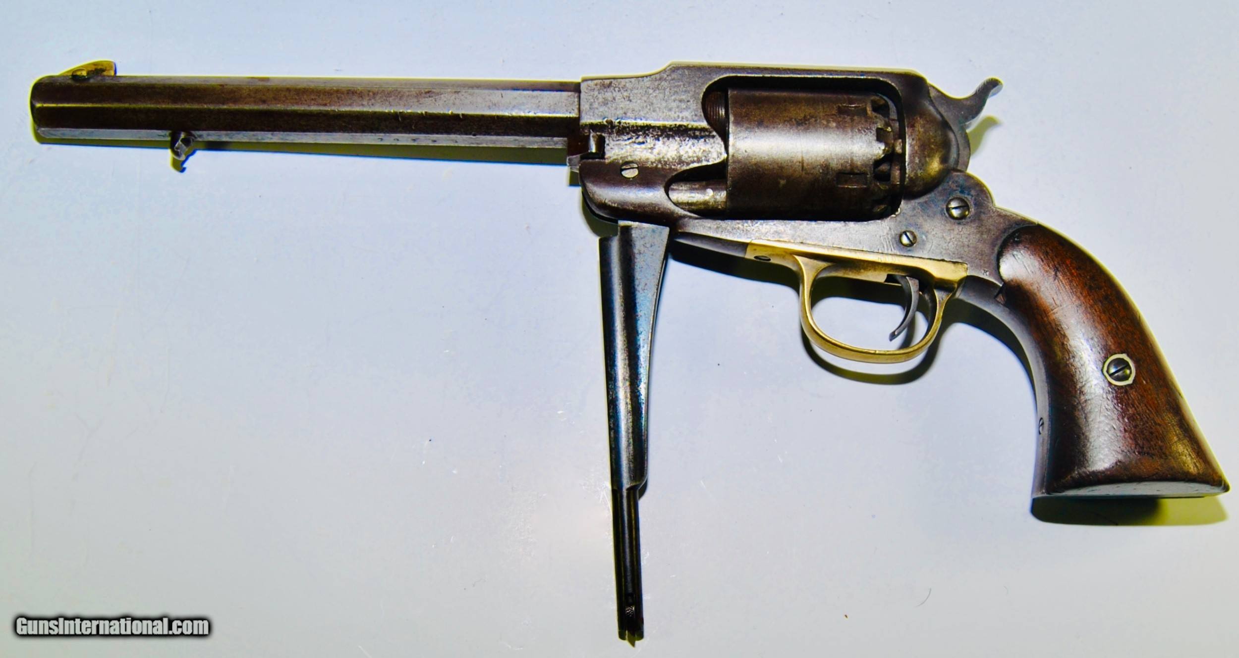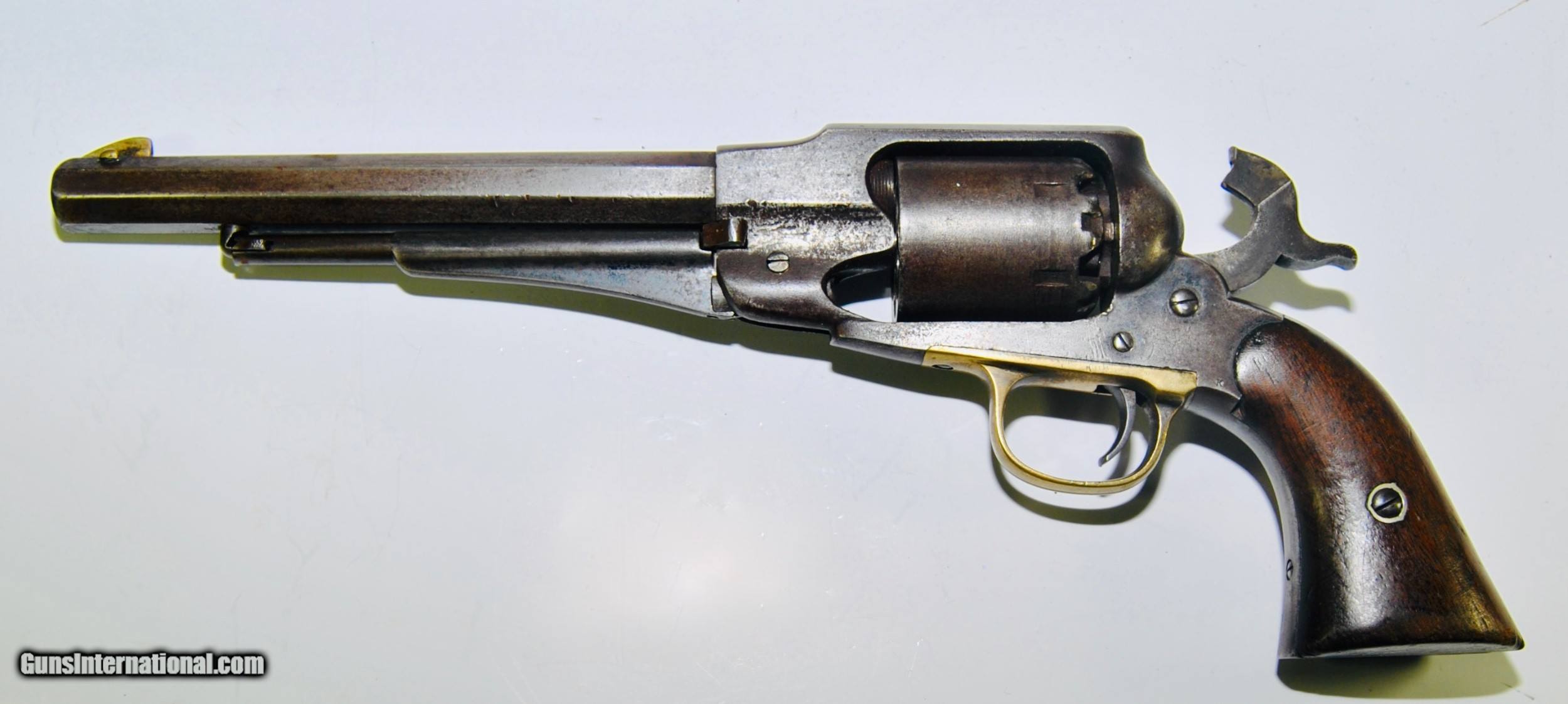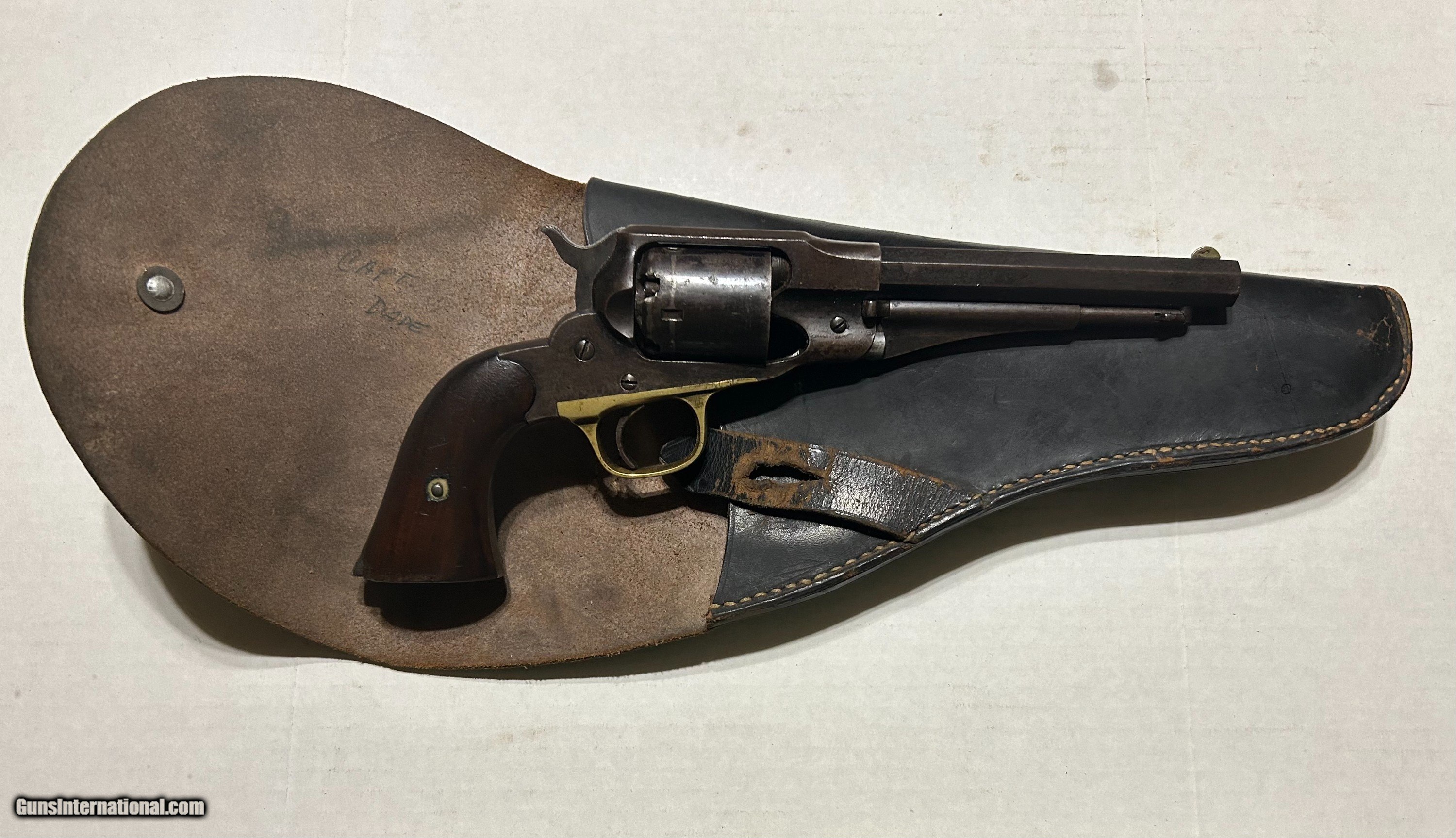 Description: NOTE: USE FREE N EZ LAYAWAY PLAN. NEVER A FEE!! 25% DWN Then you deside how many payments you wish to make. Rare Civil War Remington New Model Army single action revolver with holster. Made circa 1864. Top of the barrel is marked "PATENTED SEPT. 14. 1858/E.REMINGTON & SONS.ILION NEW YORK .U.S.A./ NEW-MODEL" A few inspector letter stamps on the metal components. No visible inspector cartouches on the grips. Barrel serial number and serial number on the butt of the frame are matching. Octagon barrel with brass blade front sight and u-notch cut out frame. Original finish on the metal components forming a pretty brown patina. Brass trigger guard. Oil finished walnut grips. CONDITION: Metal retains some of its original finish, having formed a grayish brown patina. Grips are very good with light handling marks and scratches. Bore is heavily frosted, with minor pitting near the chamber. Good overall rifling retained. SN 706933 First Model 3rd Issue Marked USA NOTE: We have very little info on holster other than it fits nicely. DISCLAIMER: All firearms are sold as collector's items only - we do not accept responsibility as to the shooting safety or reliability of any antique firearm. All firearms are described as accurately as possible. We want Happy heathly satisfied customers. Any city or state regulations regarding owning antique firearms are the responsibility of the purchaser. All firearms are "mechanically sound" unless noted, but again, are NOT warranted as safe to fire! SOLD Antique: Yes |