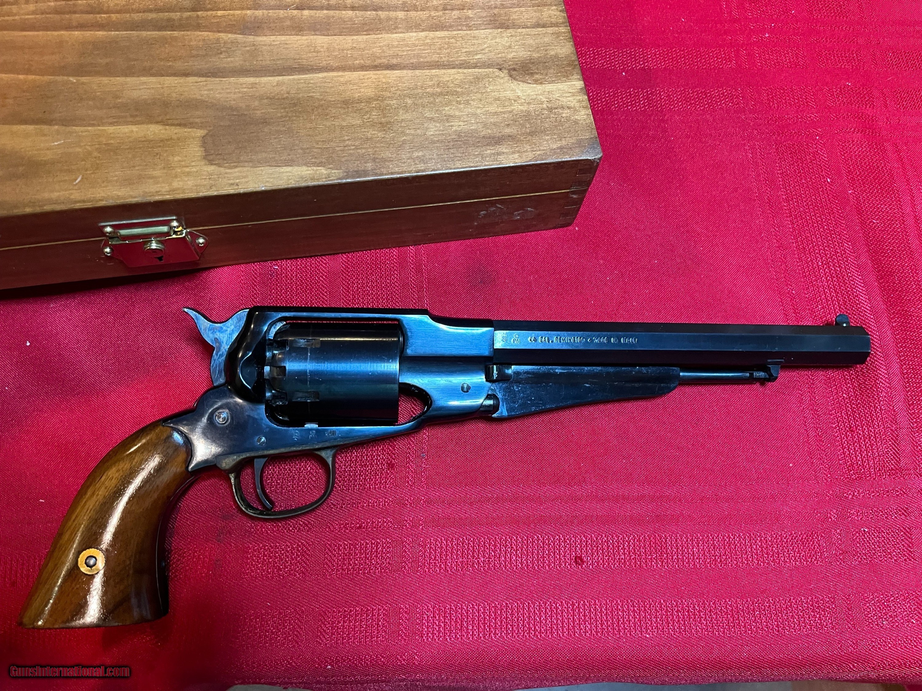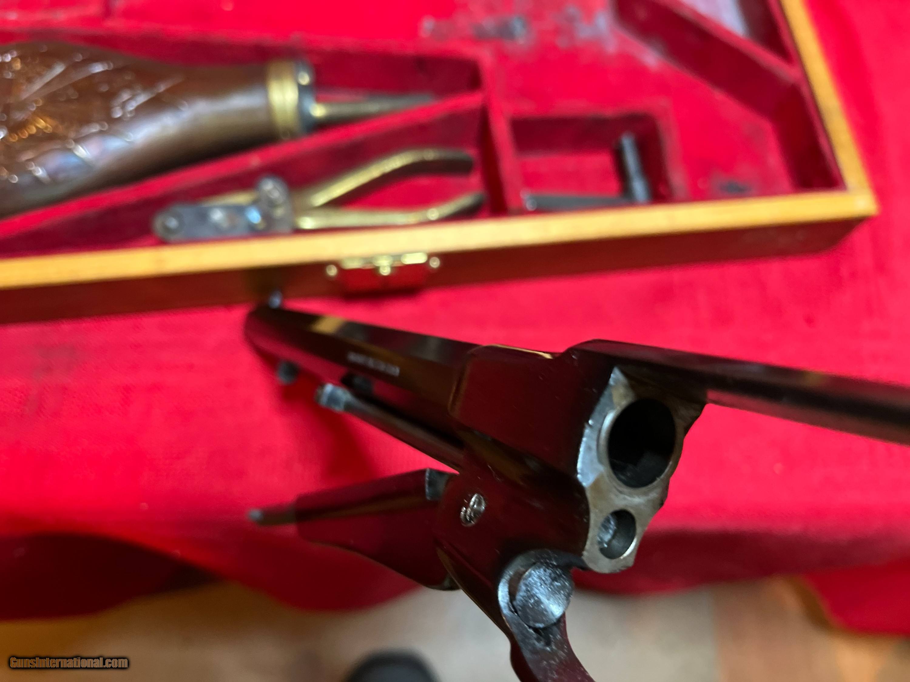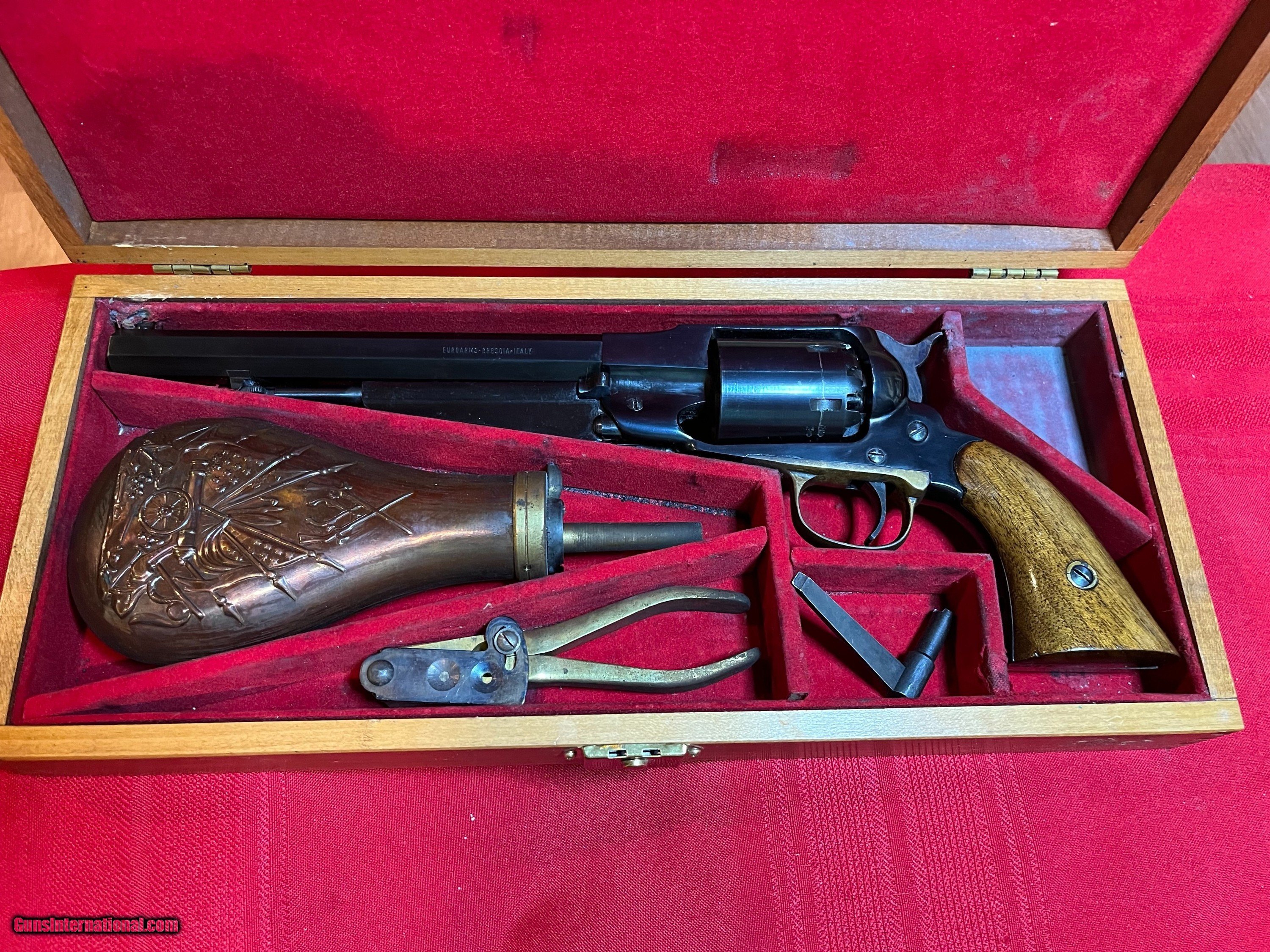 Description: Unfired in presentation case. Euroarms 44 cal. percussion revolver. Powder flask and tools. Bore and cylinders are perfect. NO FFL SOLD Antique: Yes Handgun Caliber: .44 |