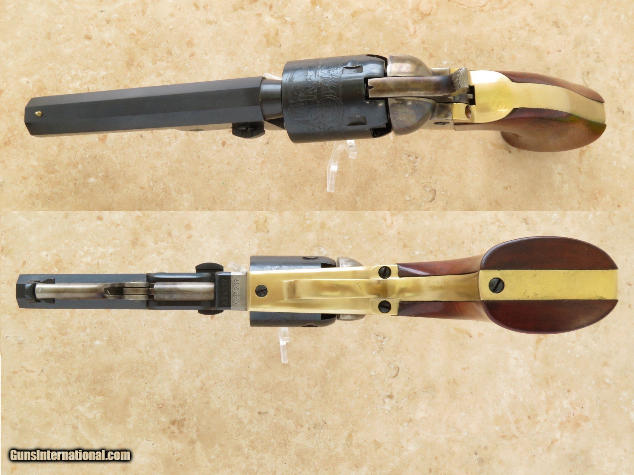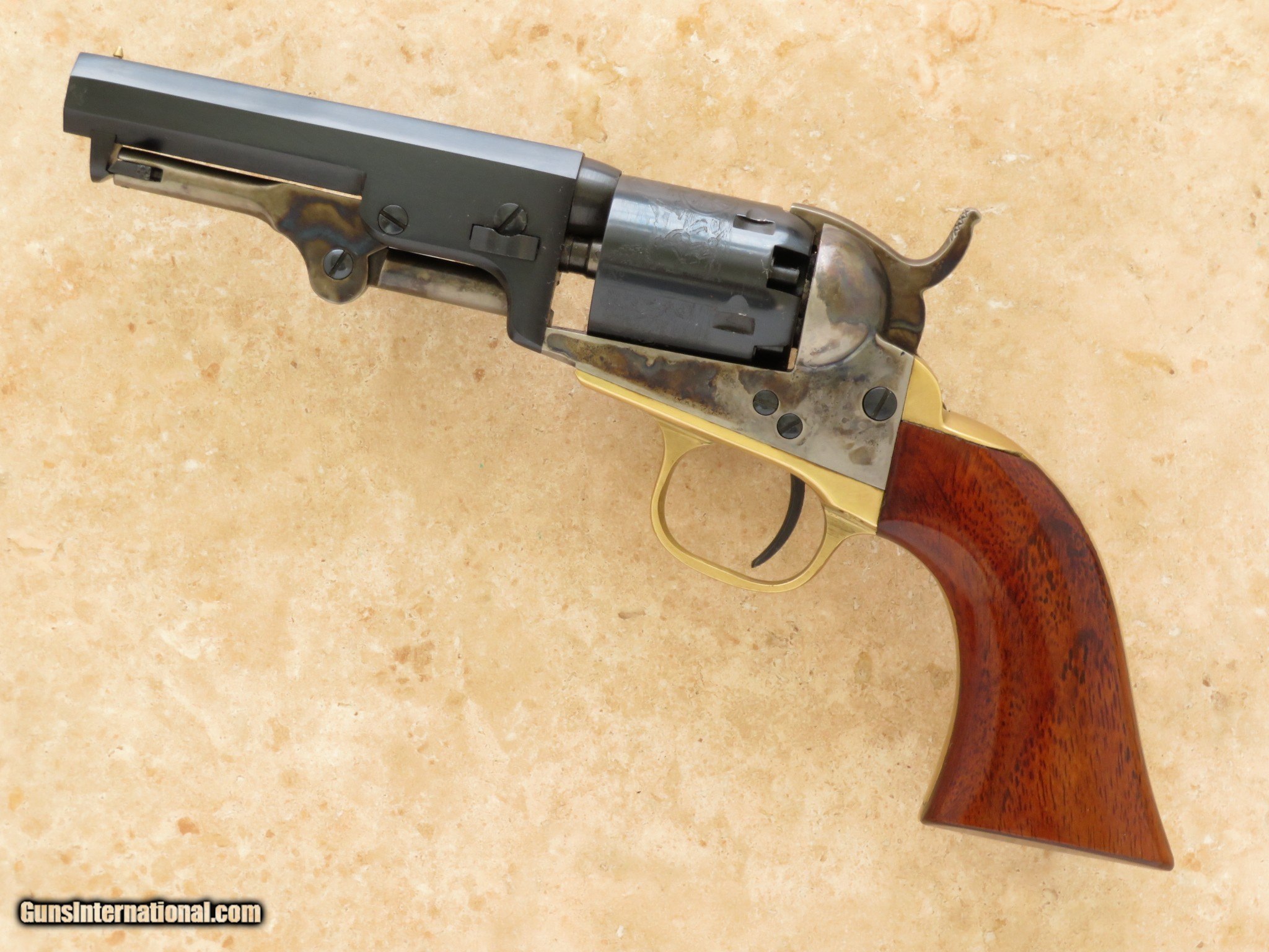 Description: Nice Italian reproduction of a Colt 1849 Pocket. The gun is fitted with a 4 inch octagon barrel, one piece smooth walnut grips, a loading lever, non-fluted 5-shot cylinder with nice roll engraved stagecoach hold up scene, brass trigger guard and back-strap, color case-hardened frame, loading lever, and hammer, blue finished barrel, cylinder and small parts, and is chambered in .31 Cal. Percussion. The gun has not been fired and is in excellent/almost new condition, except for the drag line and a surface scratch on the cylinder. The grips are in like new condition, with only a few very minor handling marks. The bore is as new and the action functions the same, with a tight lock-up on all 5 cylinders. Sorry, no box or paper-work. No FFL required. PRICE: $300 We are Antique & Modern Firearms in Lexington, KY, dealer of fine firearms since 1974. PH. 859-276-1419 We Buy, Sell and Trade Firearms & Knives. Have a Individual Firearm, Firearms Collection, or Firearms Estate to sell, let us know, we can buy or consignment sell it for you. NOTE: No additional fee for a Credit Card payment. SOLD Manufacturer: Italian Model: Repro Colt 1849 Pocket |