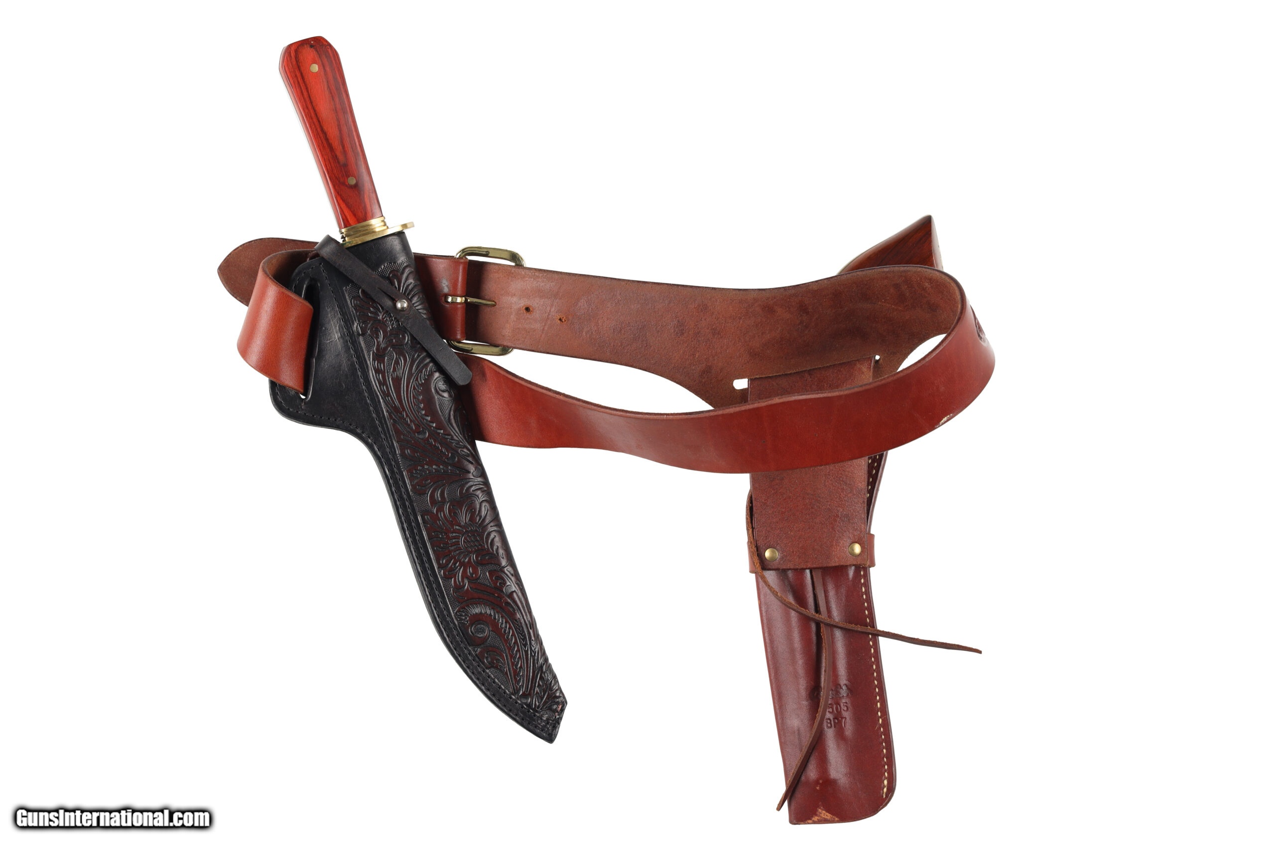 Description: This Reproduction 1851 Navy revolver, from an unknown Italian manufacturer, us in very good overall condition, with only light wear and holster marks. This revolver is also accompanied by a holster, belt and bowie knife. Manufactured in: Italy Hand: Right Hand Action Finish: Polished Hardened Brass Metal Finish: Original Barrel Length: 7.5 Inches Barrel Condition: Very Good Stock Finish: Original Stock Condition: Very Good Grip: Pistol SOLD Manufacturer: Italian Repro Model: 1851 Navy Caliber Info: .44 Condition: Preowned Metal Condition: Good Action: Revolver Triggers: Single Finish: Original Weight: 5.4 lbs Case: Leather Scabbard |