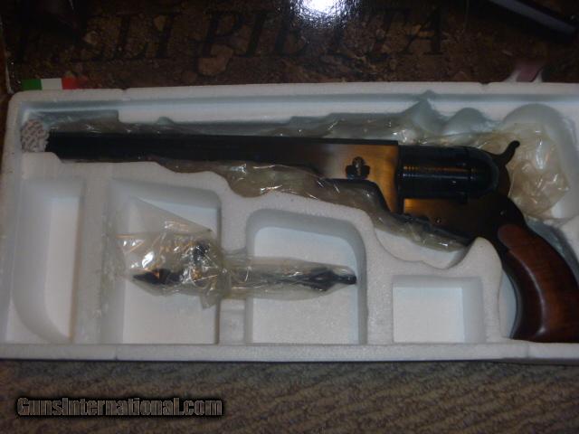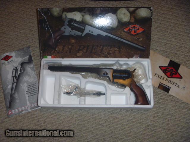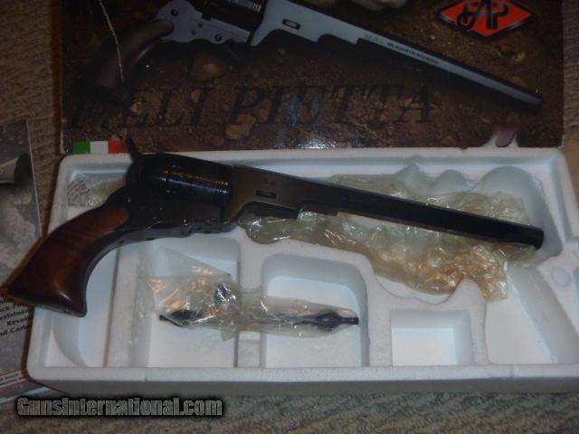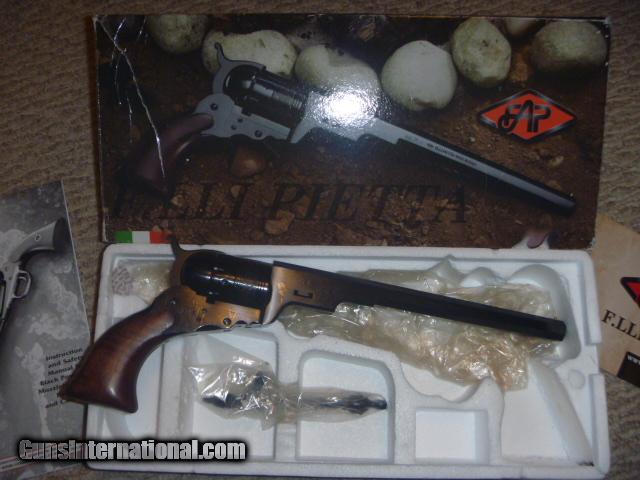 Description: Manufactured by Pietta of Italy. A very accurate reproduction of the famous Colt "Texas Paterson" revolver originally manufactured by Colt in 1836 in Paterson, N.J. This revolver is brand new, in perfect condition and still in the original factory box. It comes with the original paperwork and revolver loading lever. The gun has never been fired. The cylinder has never been turned. The only time it has been out of the box is for the pictures. It is .31bp percussion and is a very desirable collector's piece. Very few of these are made each year by Pietta. They are not easy to find. USPS money order preferred. Shipping is $15. Ships directly to buyer. No FFL. No shipments overseas. No inspection and return period. Sold "as is. SOLD Manufacturer: Pietta Caliber Info: .31BP Condition: New Metal Condition: New Wood Condition: New Bore Condition: New Barrel Type: Ocatgon Action: Single Finish: New Sights: Fixed Manufacture Date: 2015 Extras: Loading Lever Item Location: Missouri |