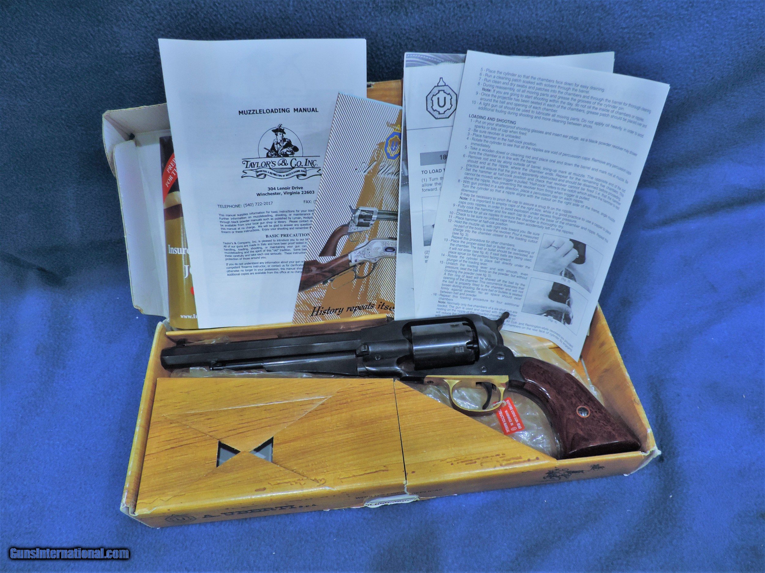 Description: Inv. 7161 Uberti Remington New Model Army, Cal. .44, Ser. A664XX. Unfired and almost mint in the box.. A tiny chip at the bottom of the left grip from handling it during photographing keeps if from being "Mint In a Box" this estate gun was from a collector of Civil War period Italian reproductions none of which were ever fired. It does indeed come with the original box and our "Purchase Satisfaction Guarantee" Only ......Shipped......$265. To purchase this firearm or if you want to request more information contact us at: Email ckguns[at]ymail[dot]com Phone 201-512-0002 Cell 201-575-6838 FAX 201-215-4759 We accept most major credit cards. Prices shown are Discounted 3% for Cash or Check. The buyer must be familiar with all the laws governing the purchase and the ownership of firearms in their own city and state. The Yankee Armorer, Inc is not responsible for any failure to comply with or observe these laws. The Yankee Armorer, Inc will only ship after full payment and receipt of all required documents. Shipping: Add $35.00 for handguns, $45.00 for long guns. New Jersey buyers are subject to a 7% sales tax. The Yankee Armorer, Inc offers a 3 day inspection period with full refund upon return of intact firearm and in the original condition. The Yankee Armorer, Inc offers a no interest lay away program - 25% down; 25% in 30 days; 25% in 60 days; and full payment in 90 days. Any violation of this policy is subject to restocking and forfeiture of all payments. Any variation from this policy must be agreed to in advance. Unshipped Cancelled sales are subject to a 20% restocking fee. Be advised that all firearms sold by The Yankee Armorer, Inc. or the Gun Exchange, LLC (SELLER) are sold as collector’s items. They have not been fired or tested for safety and must be examined by a license gunsmith prior to use. By purchasing any item from the (SELLER), you are agreeing to hold the (SELLER) free from any damages or lawsuits of any nature. Any item left for transfer or storage will be charged to $25.00 per month, per item from the day of its receipt. Any variation from this policy must be agreed to in advance. Store hours 10:00 am to 5:00 pm Tuesday -Saturday. It's always best to call for appointment. Store 201-512-0002, cell 201-575-6838. SOLD Manufacturer: Uberti Model: Remington New Model Army Serial Number: A664XX Caliber Info: .44 |